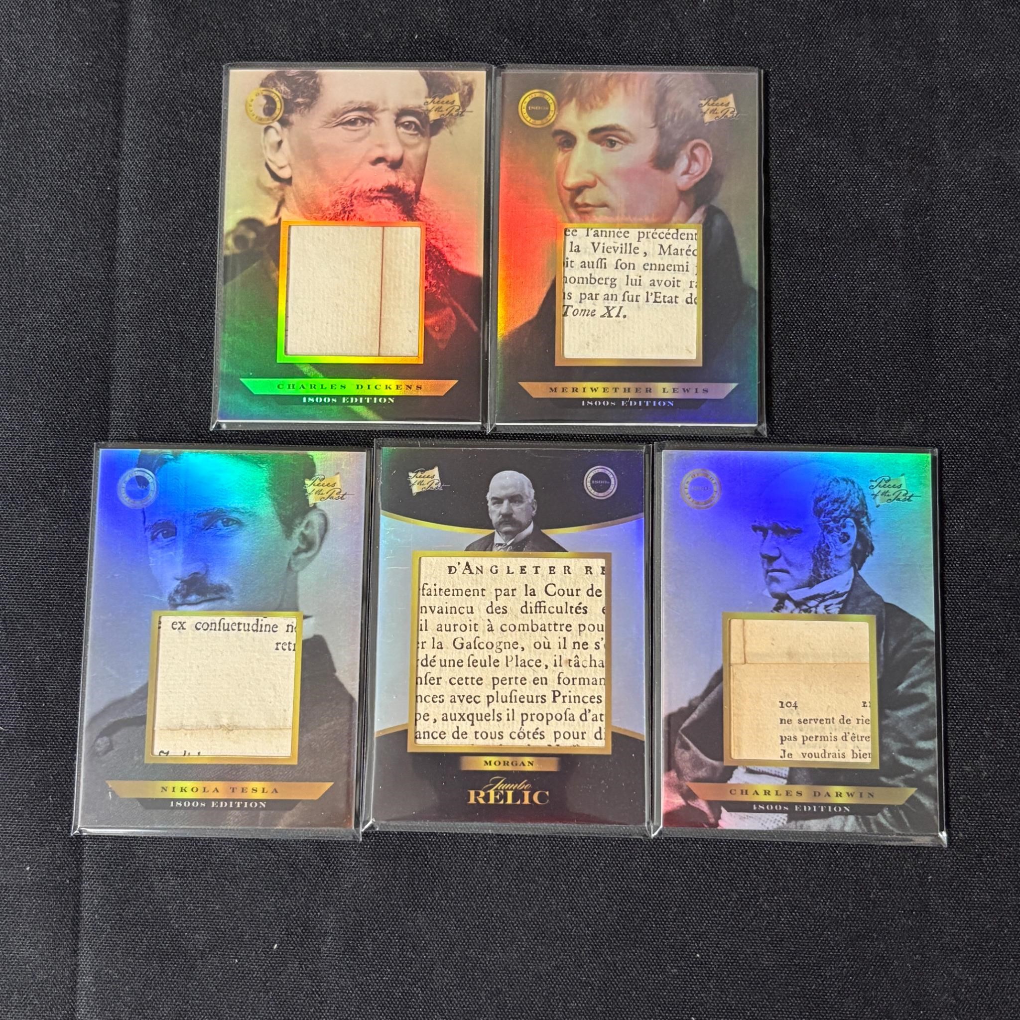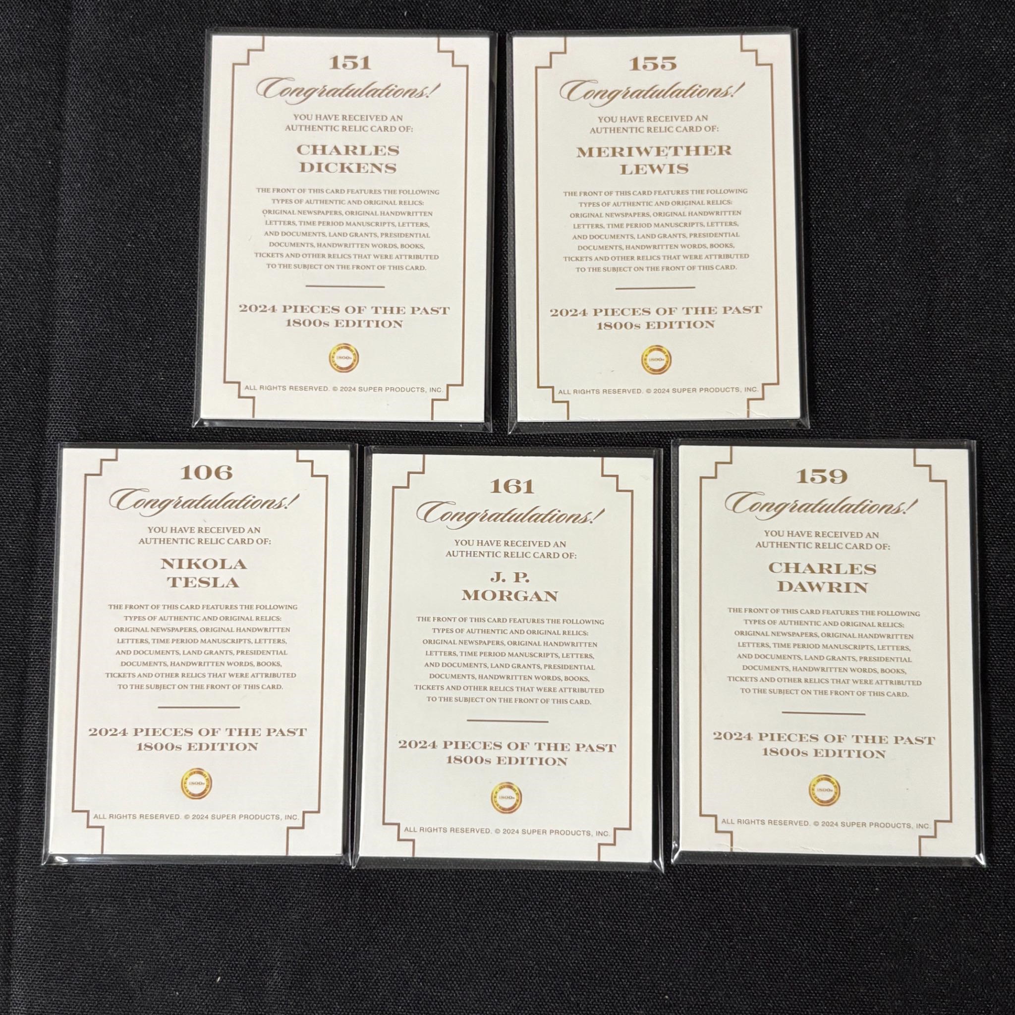 Large lot of 2024 Pieces of the Past 1800s Edition Relic Cards. Includes Charles Dickens, Nikola Tesla, J.P. Morgan, Meriwether Lewis, and Charles Darwin. All items are sold as is. Please look at pictures carefully to determine what you believe are the condition of each lot. By choosing which card to use to register to bid, you authorize us to use the card on file that you used at the time of registration.at the end of the auction to pay for any lots and shipping you won. Happy Bidding and Best of luck! We offer in-house shipping. We are currently accepting consignments.