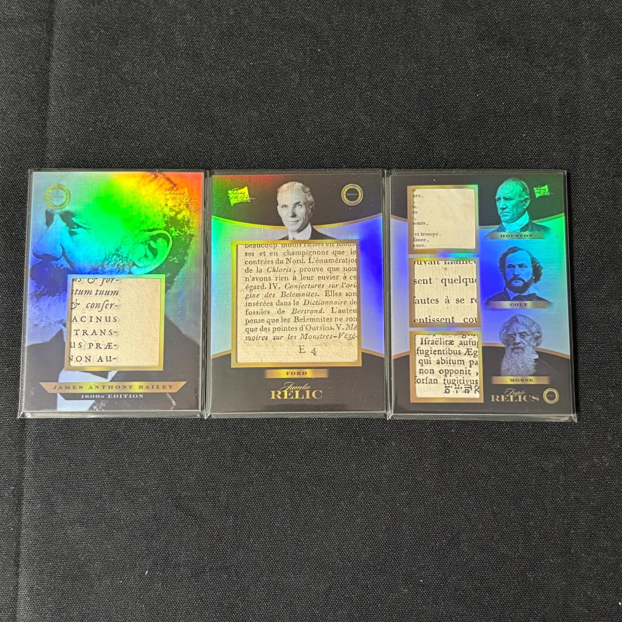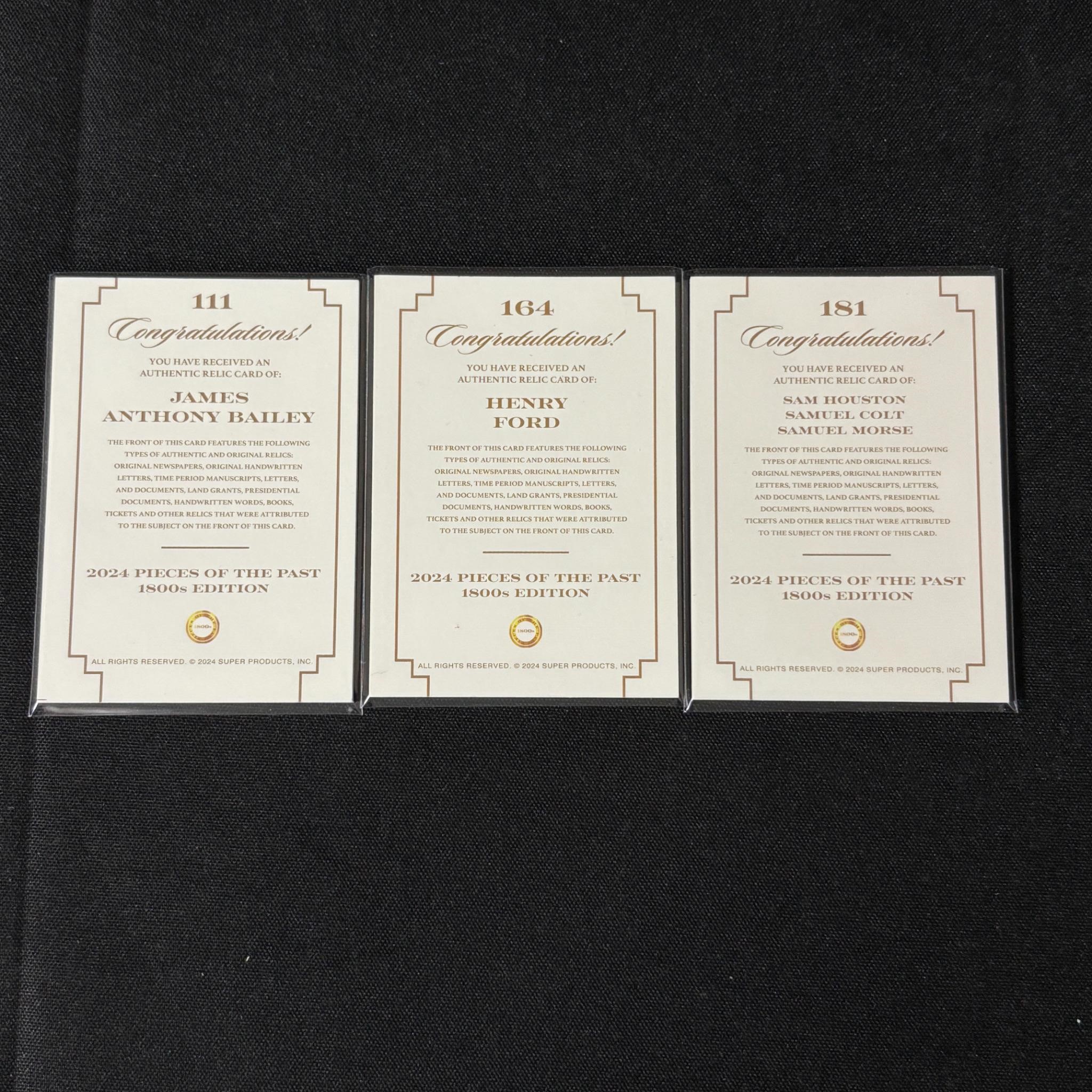 2024 Pieces of the Past Relic Cards. Includes Relics from Henry Ford, and James Bailey, as well as Sam Houston, Colt, Morse Triple Relic Card. All items are sold as is. Please look at pictures carefully to determine what you believe are the condition of each lot. By choosing which card to use to register to bid, you authorize us to use the card on file that you used at the time of registration.at the end of the auction to pay for any lots and shipping you won. Happy Bidding and Best of luck! We offer in-house shipping. We are currently accepting consignments.