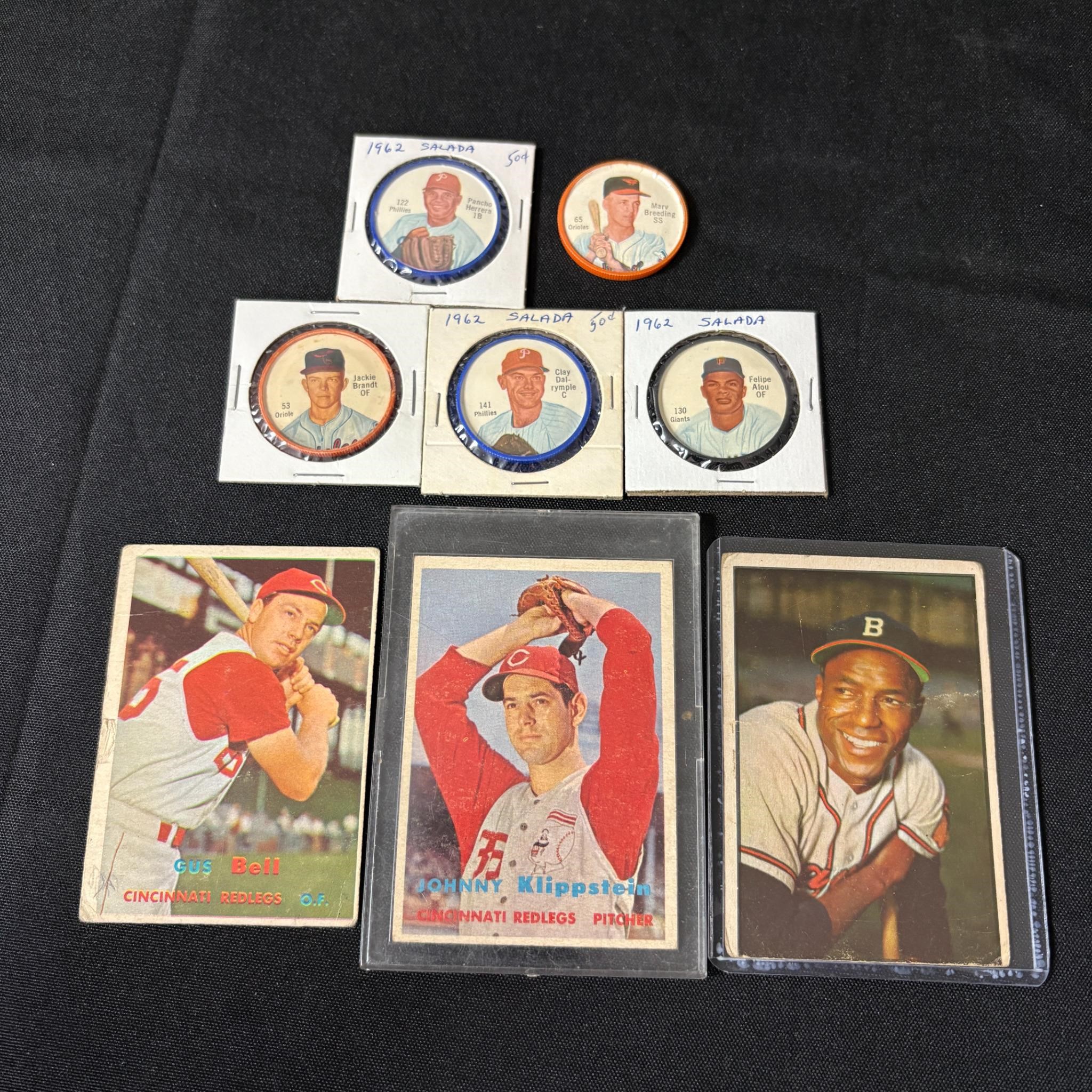 Lot of 1950s Topps Baseball Cards and 1962 Salada Baseball Coins. All items are sold as is. Please look at pictures carefully to determine what you believe are the condition of each lot. By choosing which card to use to register to bid, you authorize us to use the card on file that you used at the time of registration.at the end of the auction to pay for any lots and shipping you won. Happy Bidding and Best of luck! We offer in-house shipping. We are currently accepting consignments.