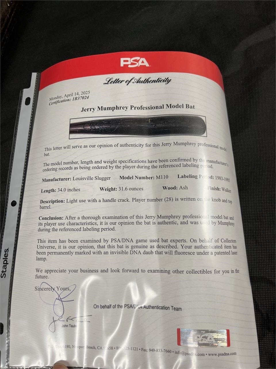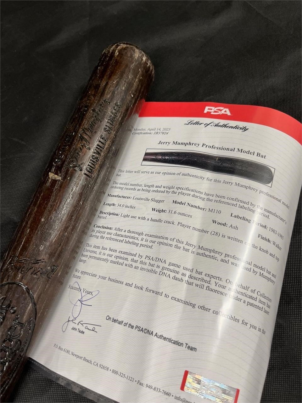 Used in Major League Baseball Games. Up for auction, gamed used Mumphrey baseball bat. Comes with PSA/DNA We ship in-house! We ship internationally. We also offer pick up and we offer a discount for cash payments. Please look at pictures carefully to determine what you believe are the condition of each lot. We offer in person or virtual previews and we can take additional pictures, or answer questions about any lot until about 24 hours prior to auction. So all lots sold as is. By choosing which card to use to register to bid, you authorize the auction host to charge the card on file at the end of the auction to pay for any lots and shipping you won. Happy Bidding and Best of luck!