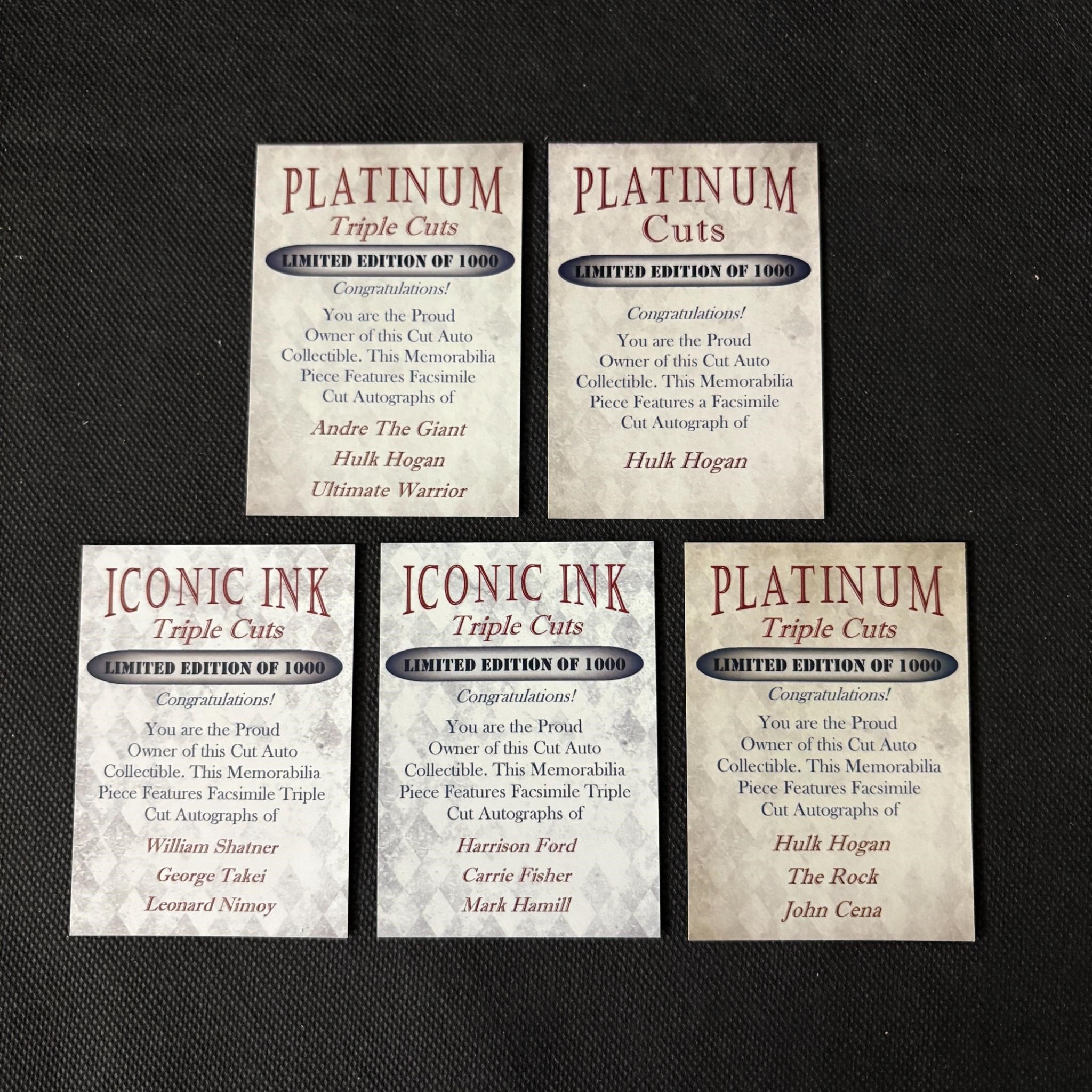 Entertainer Facsimilie Auto Cards Platinum Cuts or Iconic Ink We ship in-house! We ship internationally. We also offer pick up and we offer a discount for cash payments. Please look at pictures carefully to determine what you believe are the condition of each lot. We offer in person or virtual previews and we can take additional pictures, or answer questions about any lot until about 24 hours prior to auction. So all lots sold as is. By choosing which card to use to register to bid, you authorize the auction host to charge the card on file at the end of the auction to pay for any lots and shipping you won. Happy Bidding and Best of luck!