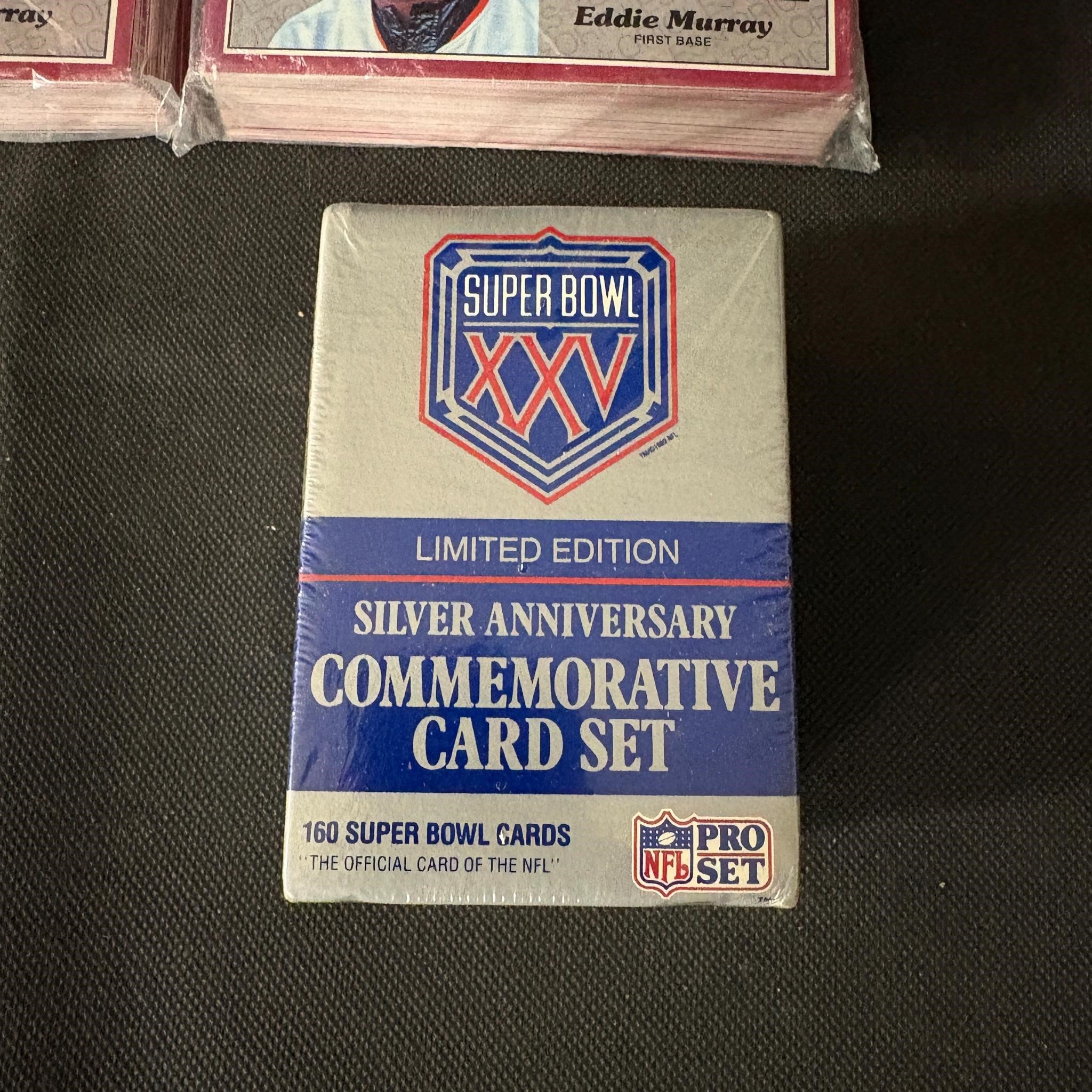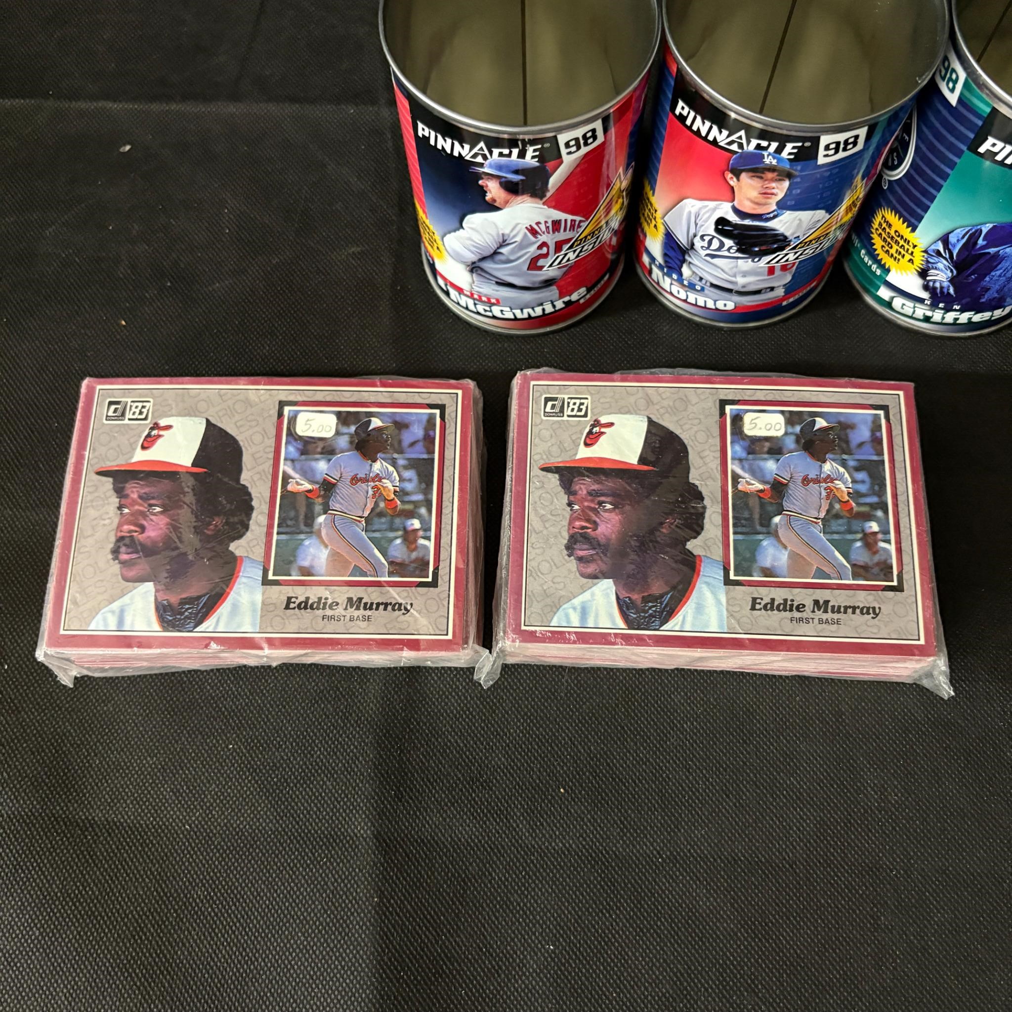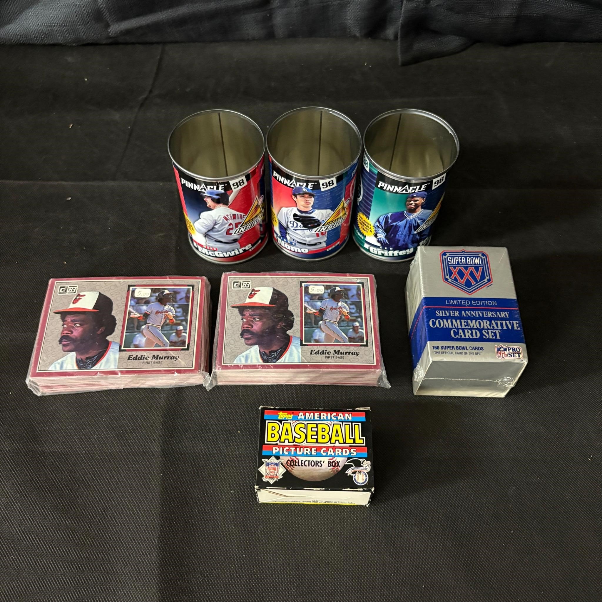 Opened Pinnacle Tins wth KGJr, (2) Sets 1983 Action All Stars, 1988 Topps American Baseball Picture Cards, Super Bowl Silver Anniversary Commemorative Card Set.