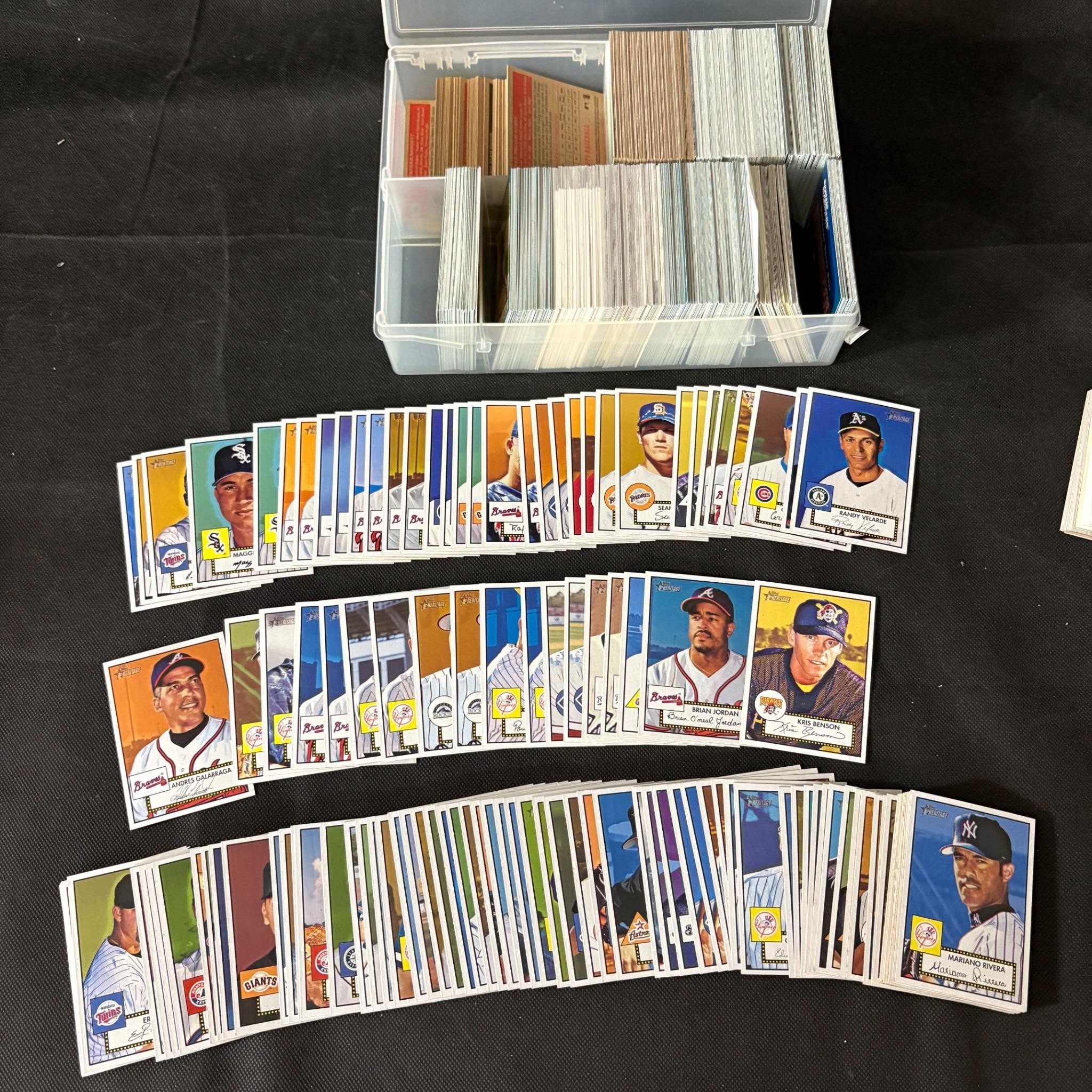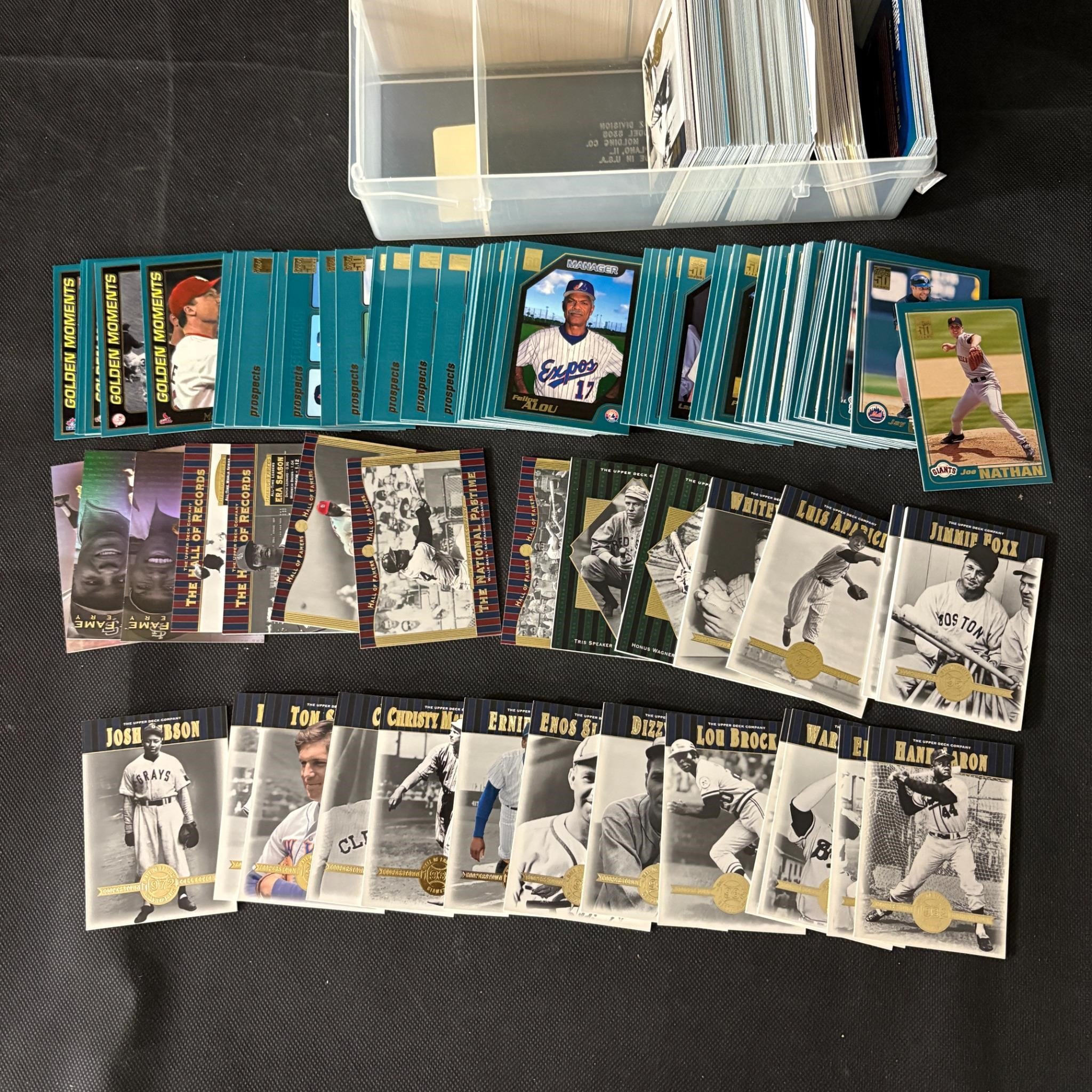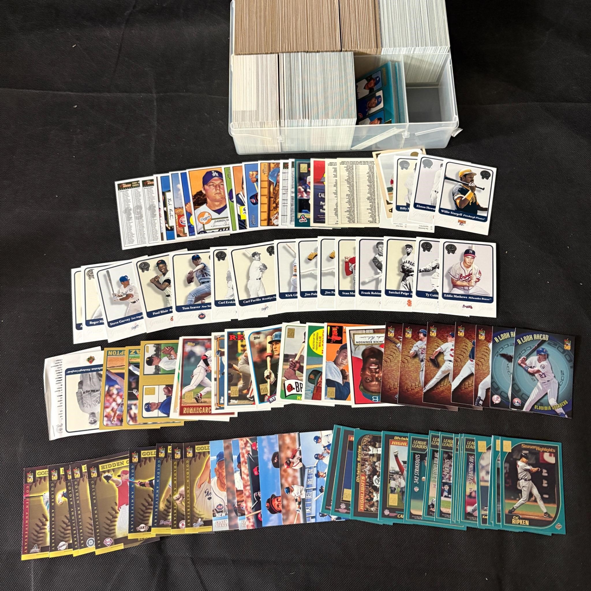 Box of unsorted sports cards spanning multiple years, sports, and brands.
