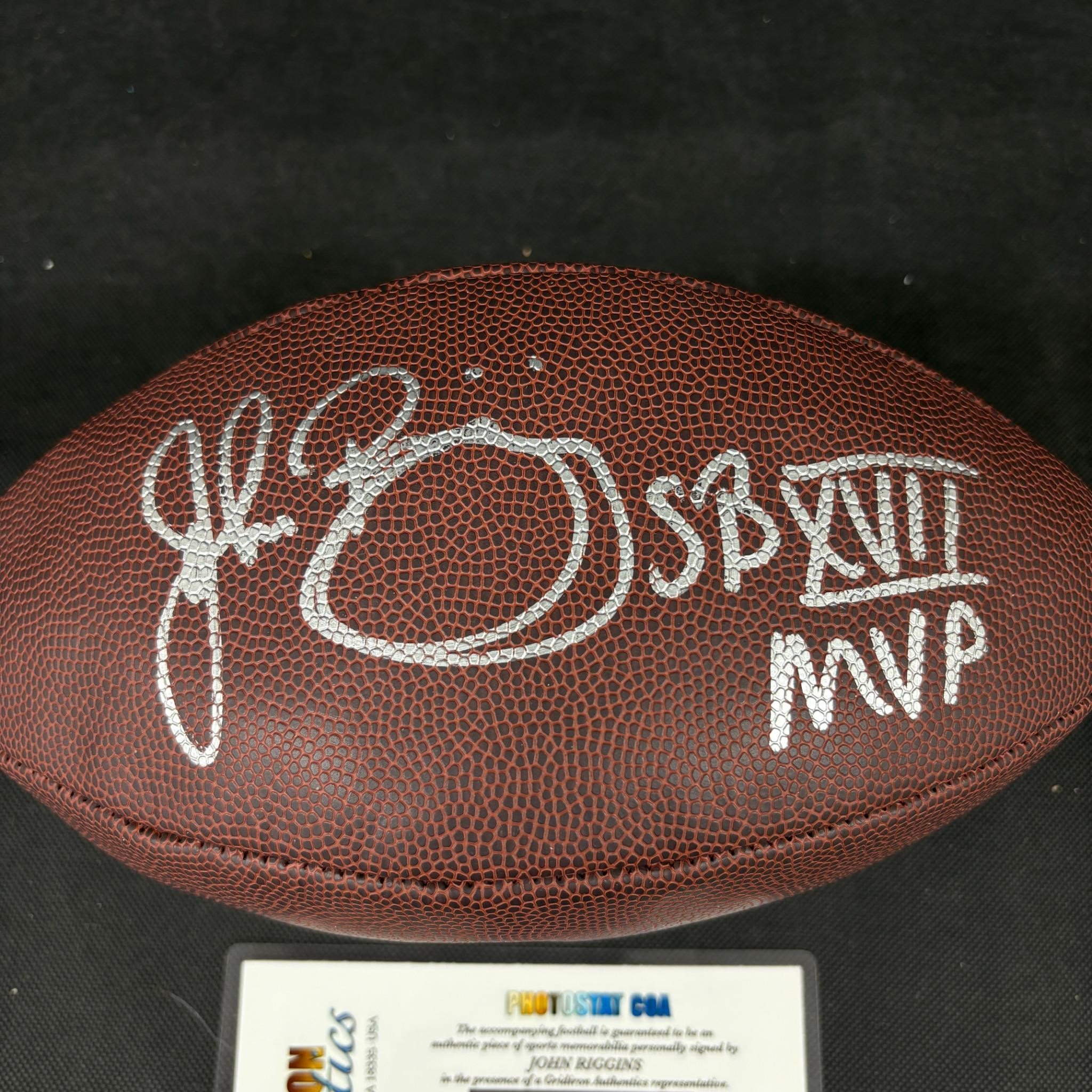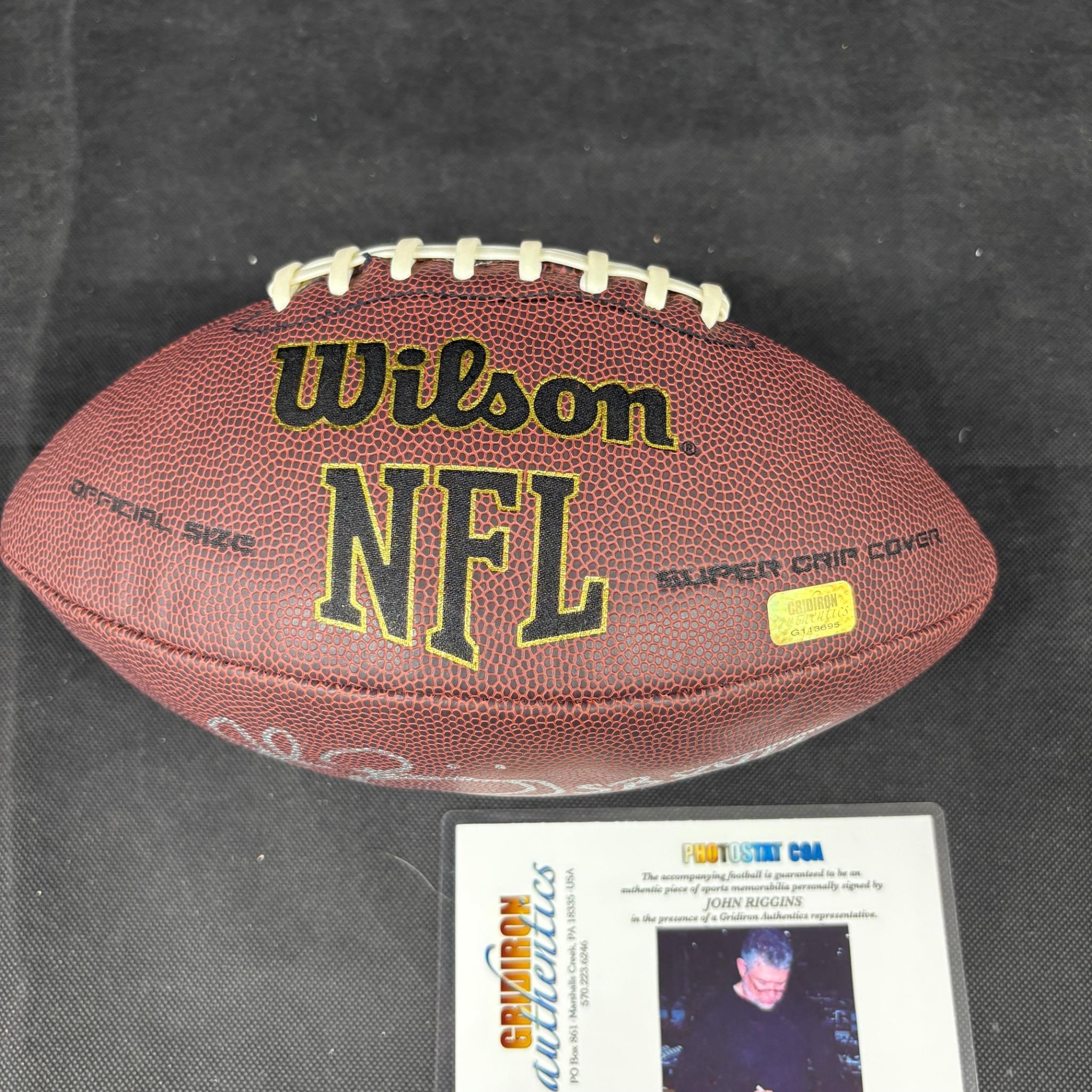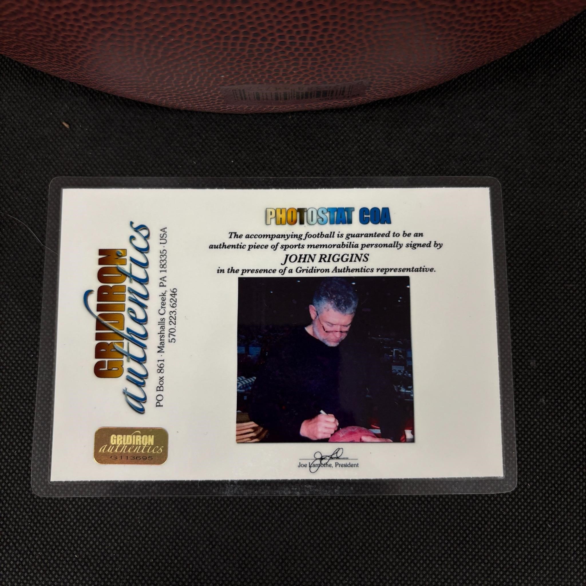 John Riggins Signed Football with Grid Iron Authentics COA. We ship in-house! We ship internationally. We also offer pick up and we offer a discount for cash payments. Please look at pictures carefully to determine what you believe are the condition of each lot. We offer in person or virtual previews and we can take additional pictures, or answer questions about any lot until about 24 hours prior to auction. So all lots sold as is. By choosing which card to use to register to bid, you authorize the auction host to charge the card on file at the end of the auction to pay for any lots and shipping you won. Happy Bidding and Best of luck!