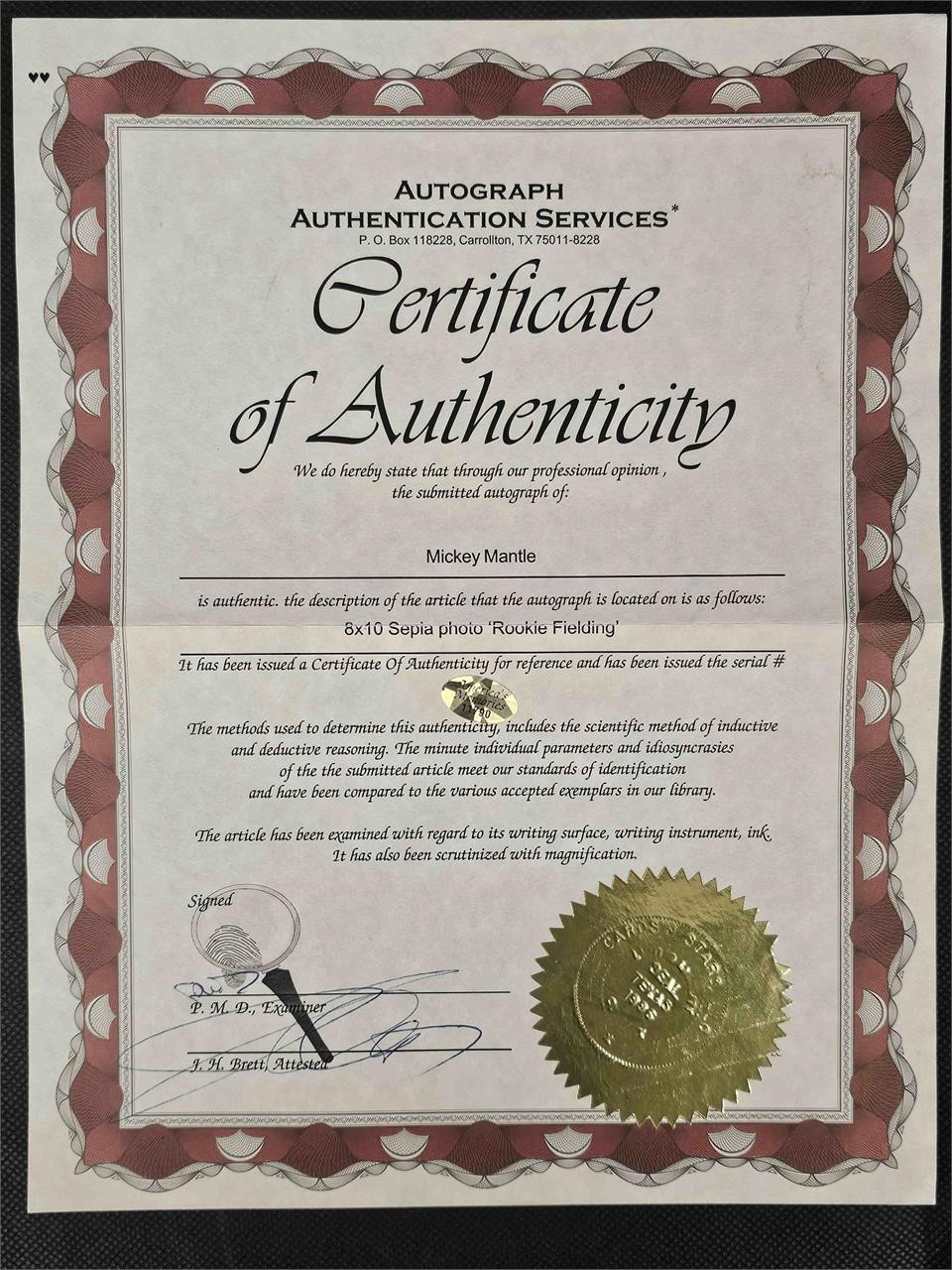 Rare signed photograph of Mickey Mantle from his 1951 rookie season Spring Training. Authenticated with COA. An exceptional early-career piece showcasing “The Mick” before becoming a Yankees legend. Highly desirable for serious Mantle and vintage collectors.