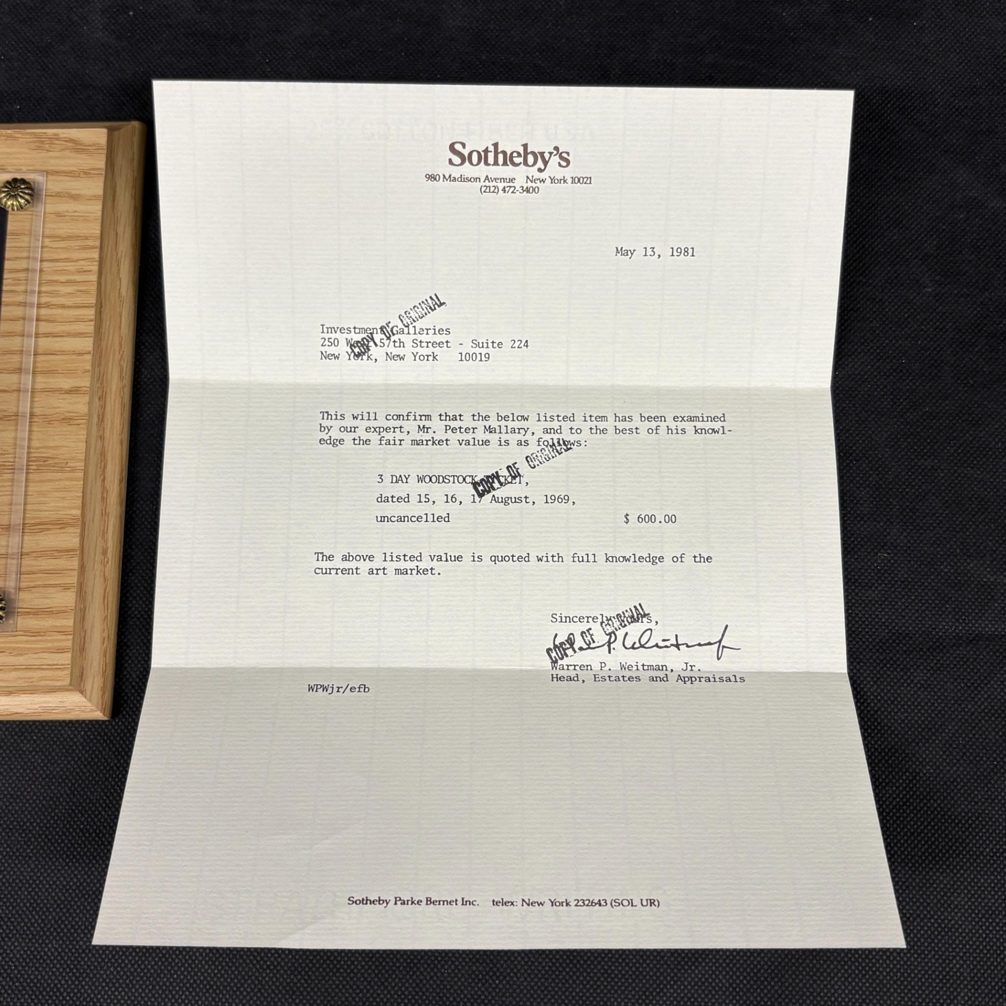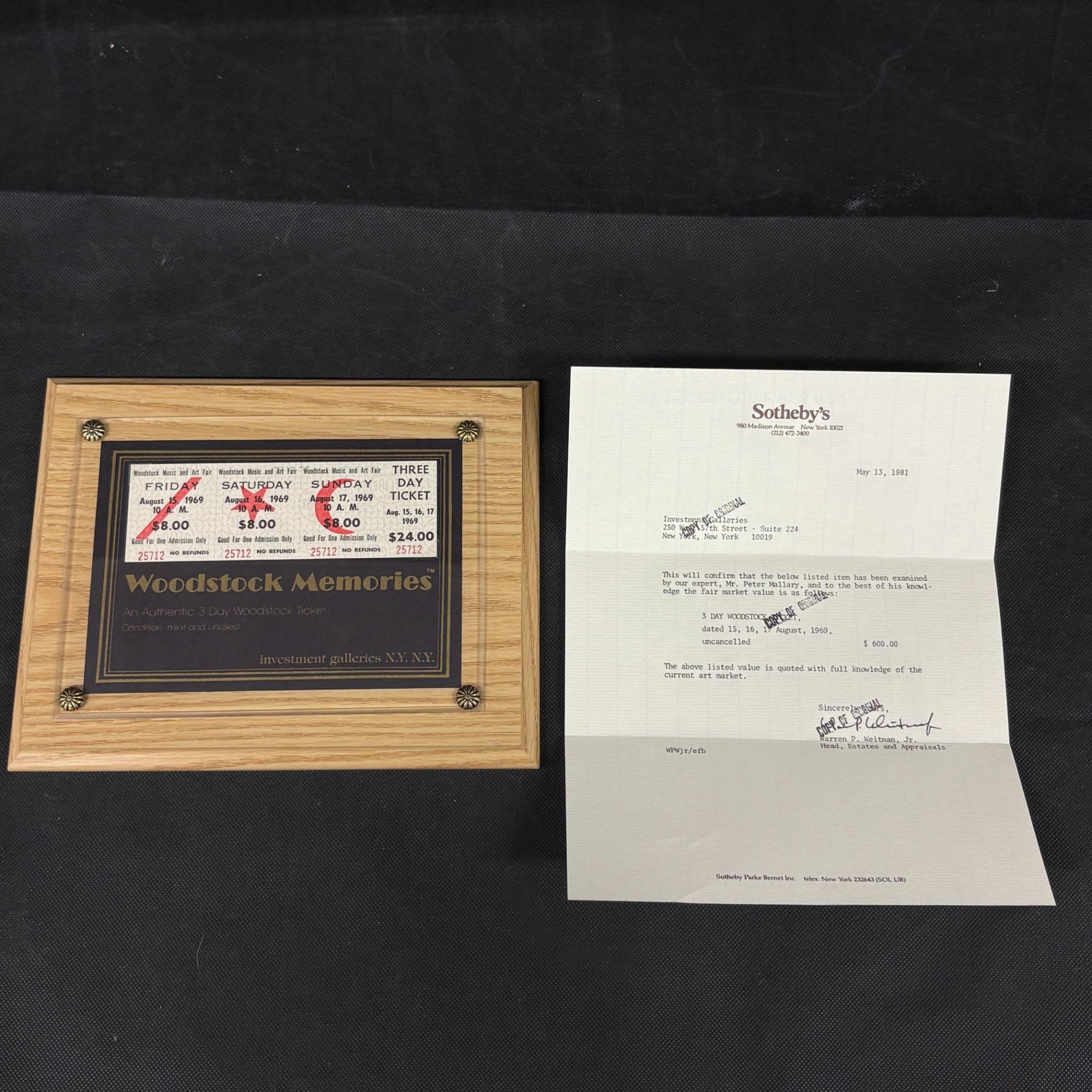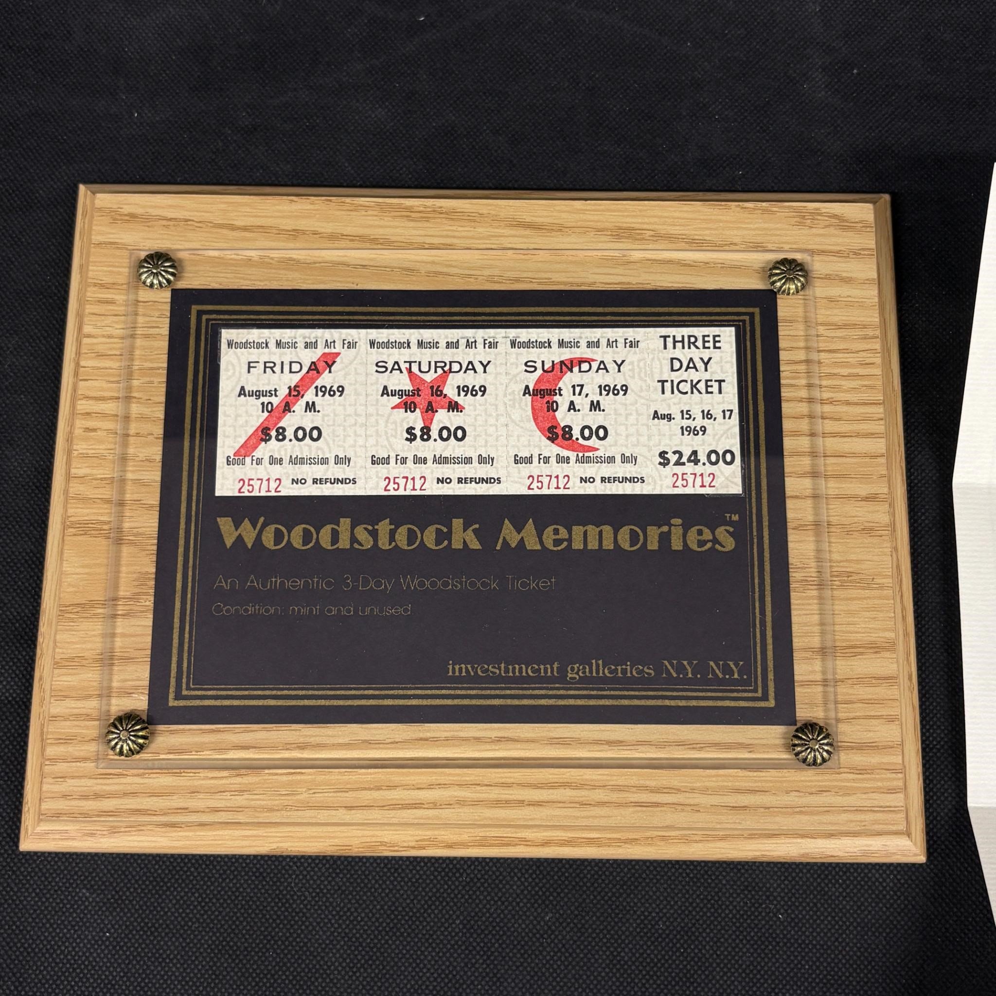 Authentic Woodstock Ticket Plaque, COA