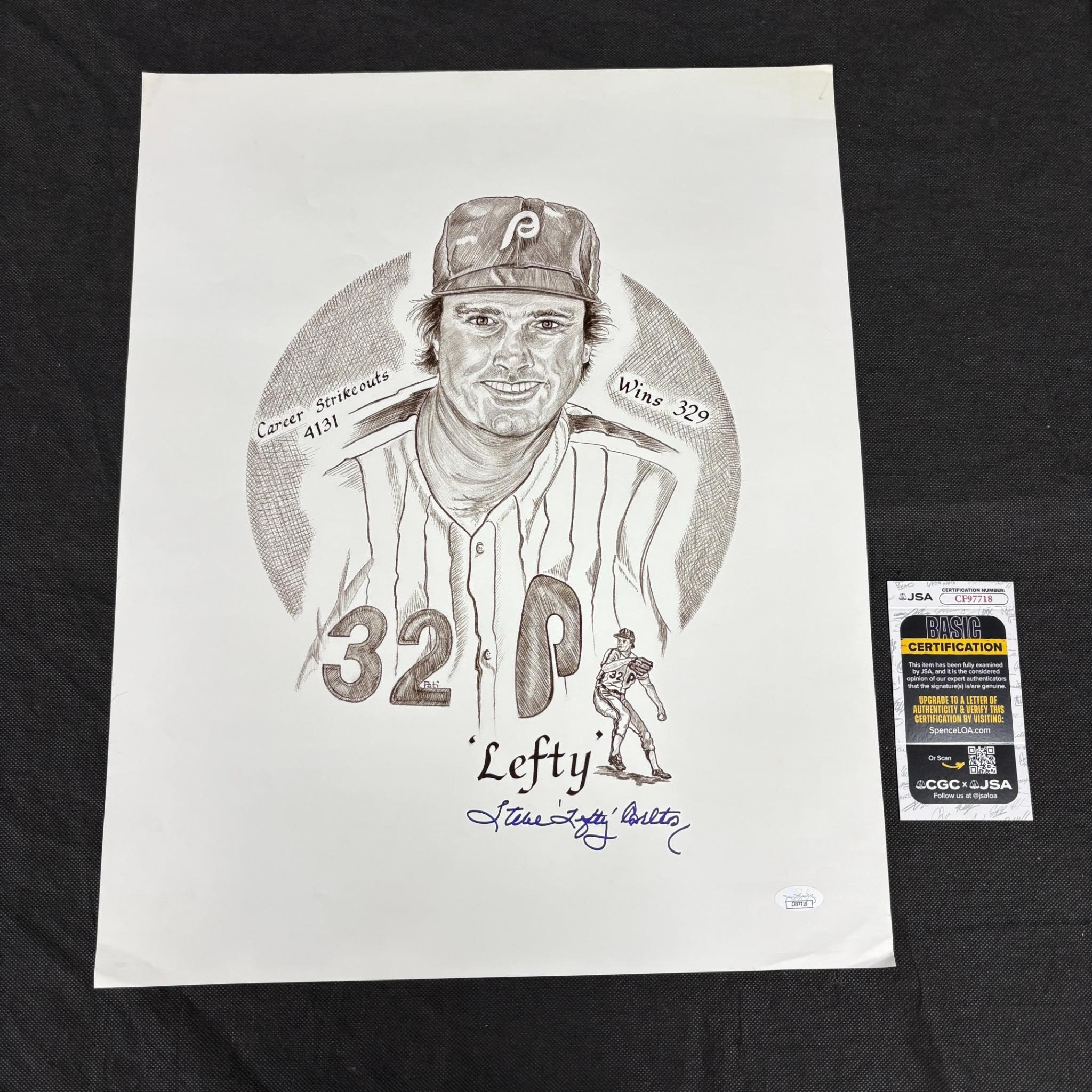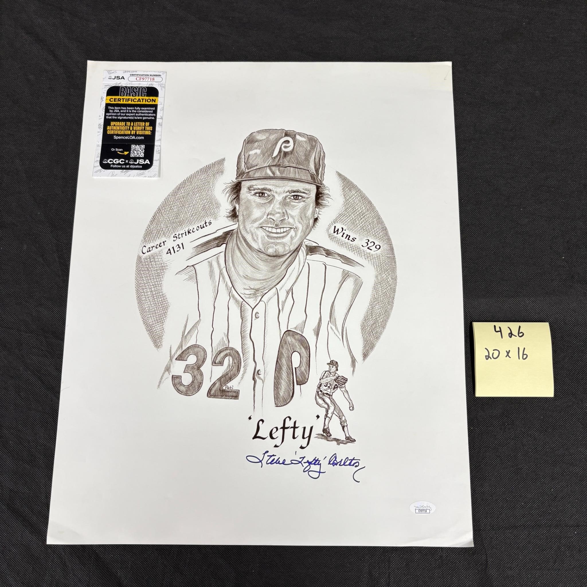 Steve Carlton Signed Art Print, JSA COA. Signed Steve “Lefty” Carlton. Baseball. Dimensions: 20×16. We ship in-house! We ship internationally. We also offer pick up and we offer a discount for cash payments. Please look at pictures carefully to determine what you believe are the condition of each lot. We offer in person or virtual previews and we can take additional pictures, or answer questions about any lot until about 24 hours prior to auction. So all lots sold as is. By choosing which card to use to register to bid, you authorize the auction host to charge the card on file at the end of the auction to pay for any lots and shipping you won. Happy Bidding and Best of luck!