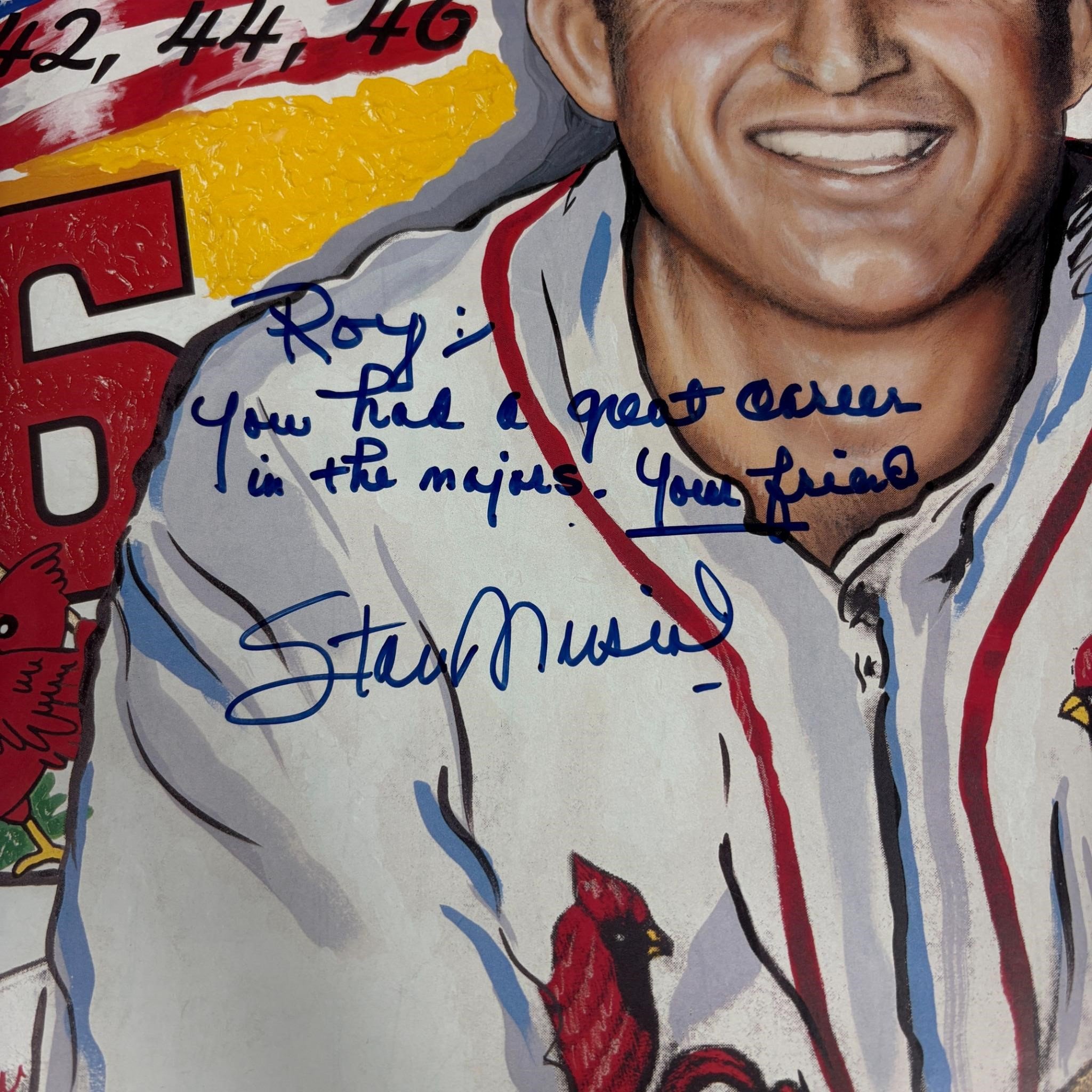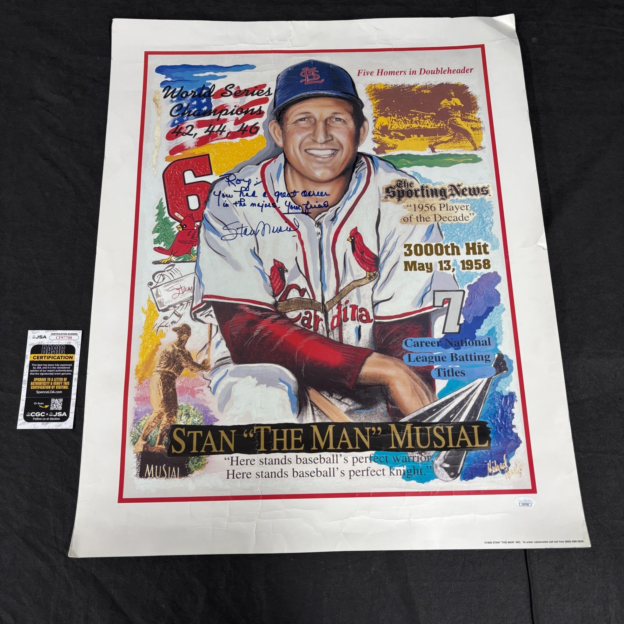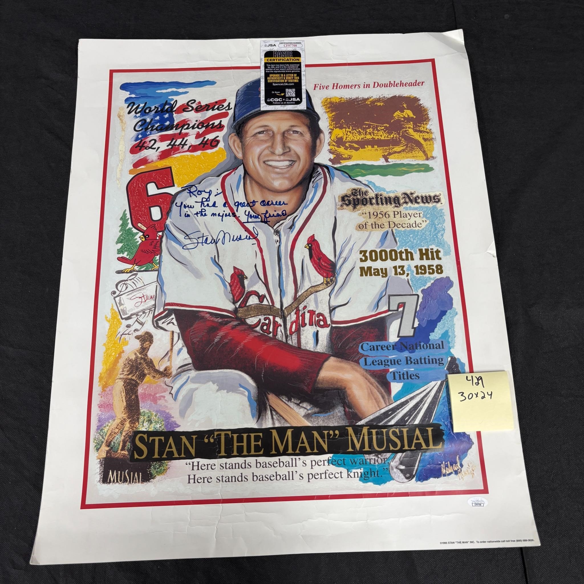 Baseball Player Stan Musial Poster Signed Poster. JSA COA. Dimensions: 30×24. We ship in-house! We ship internationally. We also offer pick up and we offer a discount for cash payments. Please look at pictures carefully to determine what you believe are the condition of each lot. We offer in person or virtual previews and we can take additional pictures, or answer questions about any lot until about 24 hours prior to auction. So all lots sold as is. By choosing which card to use to register to bid, you authorize the auction host to charge the card on file at the end of the auction to pay for any lots and shipping you won. Happy Bidding and Best of luck!