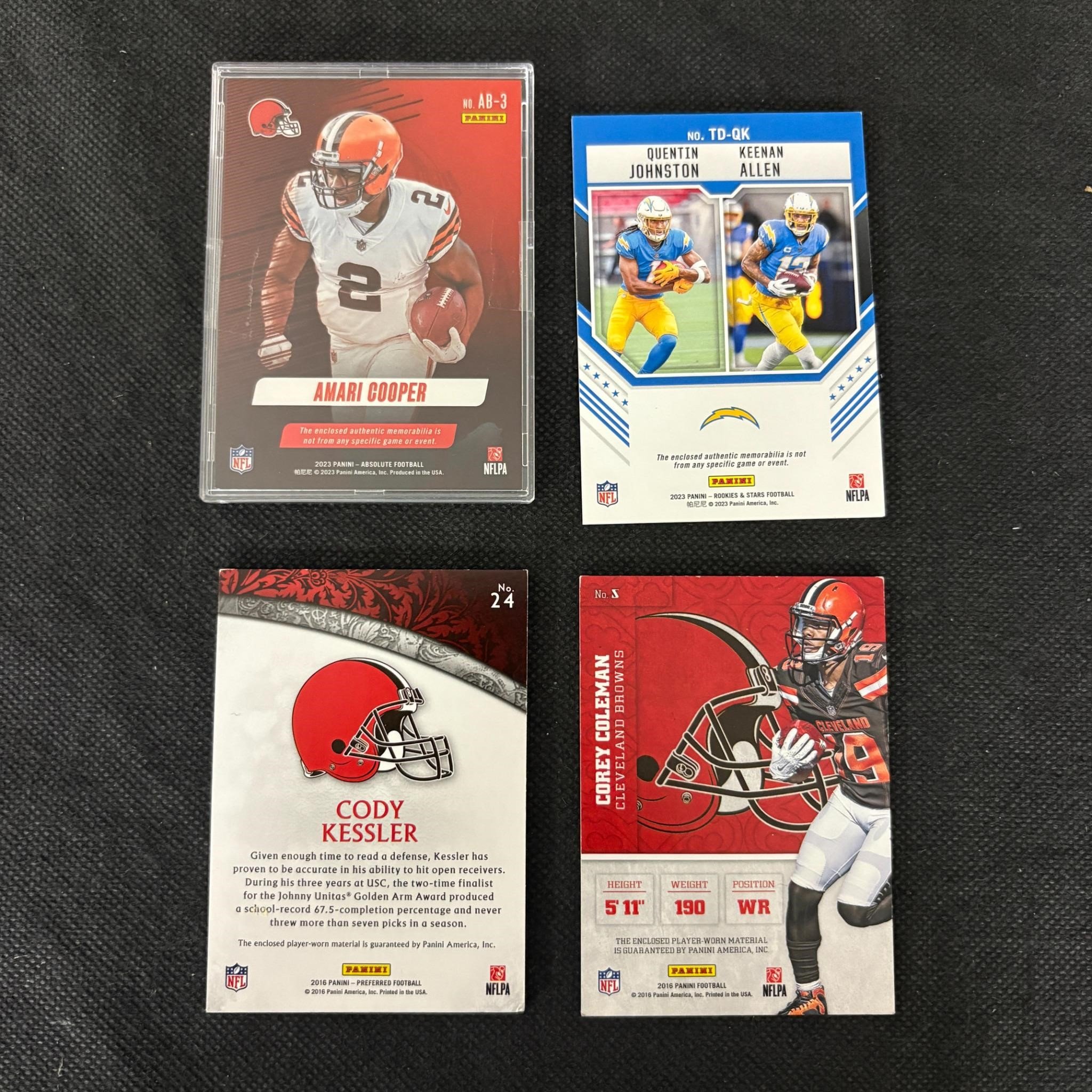 Include Amari Cooper, Quintin Johnston And Keenan Allen Dual Jersey, Corey Coleman Rookie, and Cody Kessler. We ship in-house! We ship internationally. We also offer pick up and we offer a discount for cash payments. Please look at pictures carefully to determine what you believe are the condition of each lot. We offer in person or virtual previews and we can take additional pictures, or answer questions about any lot until about 24 hours prior to auction. So all lots sold as is. By choosing which card to use to register to bid, you authorize the auction host to charge the card on file at the end of the auction to pay for any lots and shipping you won. Happy Bidding and Best of luck!