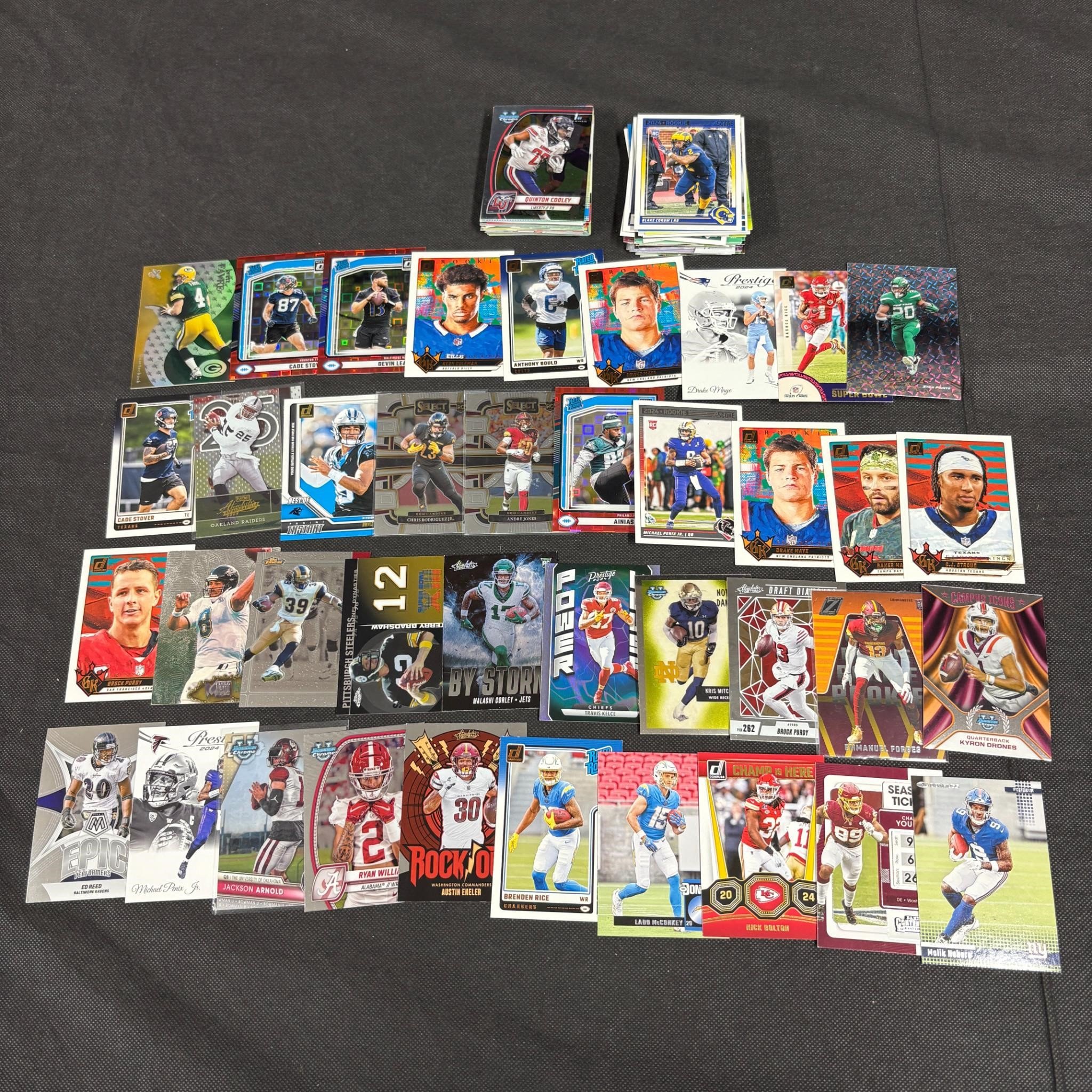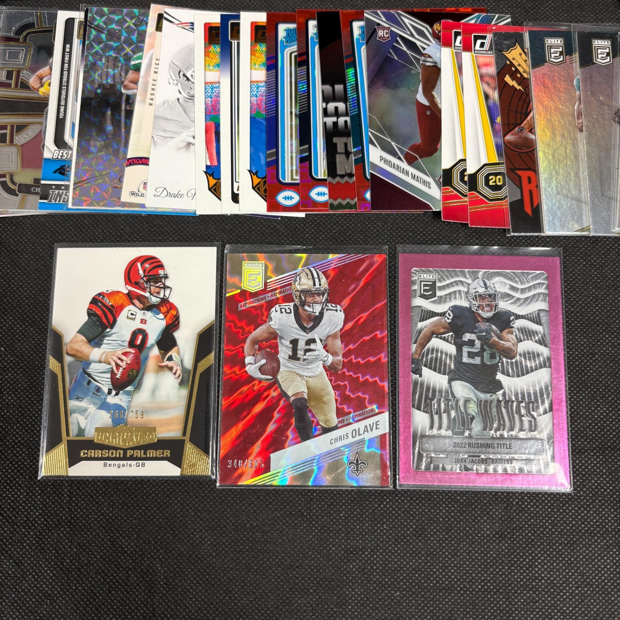 Modern Football Cards from various sets and years. Includes Carson Palmer #/759, Chris Olave #/625, and Josch Jacobs 2022 Rushing Title. We ship in-house! We ship internationally. We also offer pick up and we offer a discount for cash payments. Please look at pictures carefully to determine what you believe are the condition of each lot. We offer in person or virtual previews and we can take additional pictures, or answer questions about any lot until about 24 hours prior to auction. So all lots sold as is. By choosing which card to use to register to bid, you authorize the auction host to charge the card on file at the end of the auction to pay for any lots and shipping you won. Happy Bidding and Best of luck!