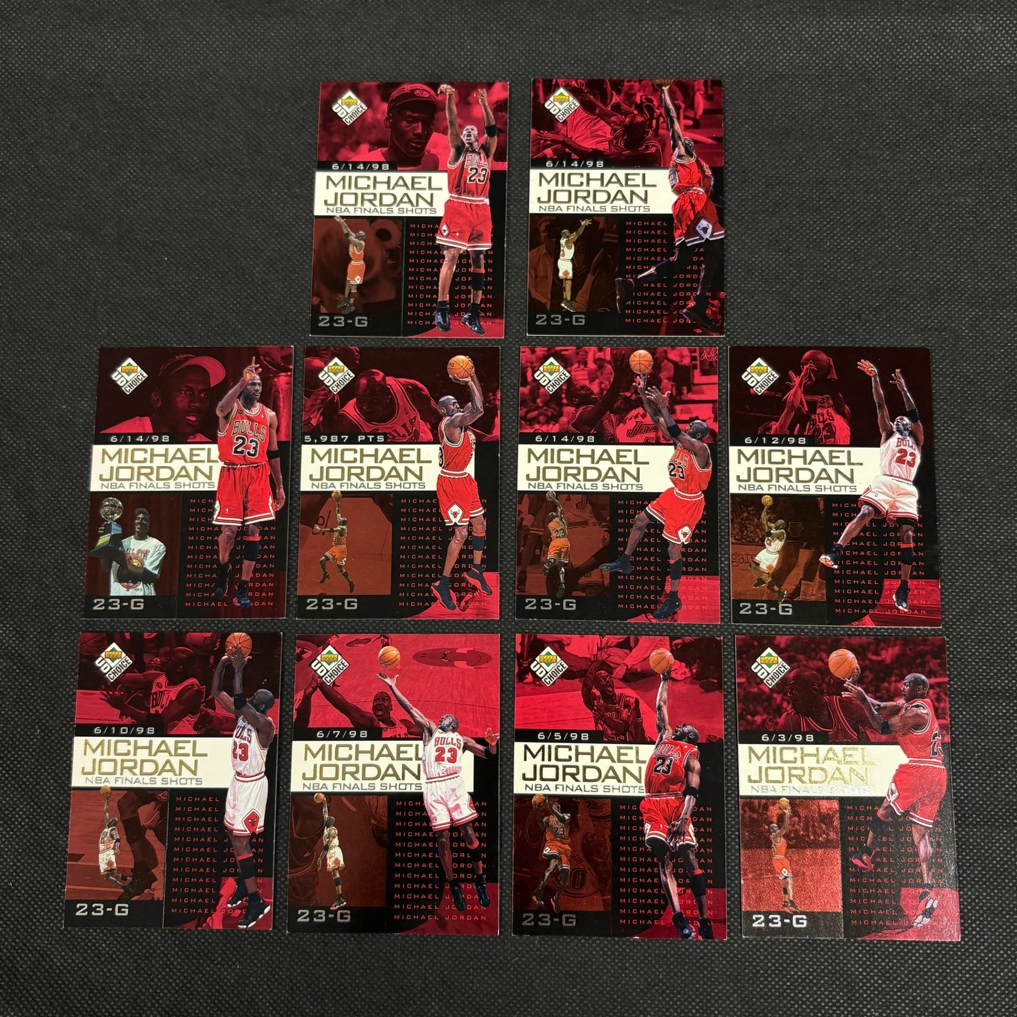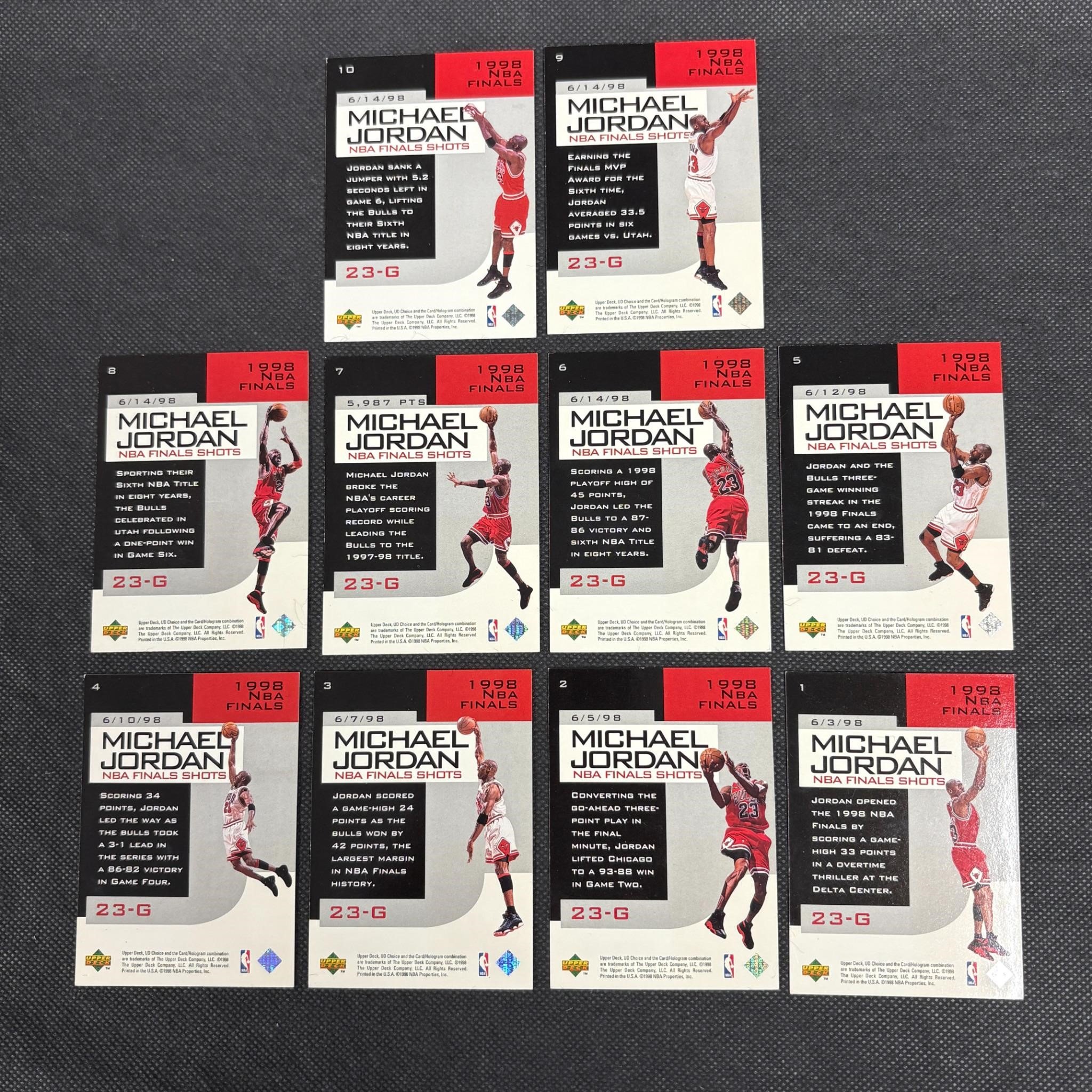 1998 Upper Deck Choice Michael Jordan Basketball Cards NBA Final Shots #1-10. We ship in-house! We ship internationally. We also offer pick up and we offer a discount for cash payments. Please look at pictures carefully to determine what you believe are the condition of each lot. We offer in person or virtual previews and we can take additional pictures, or answer questions about any lot until about 24 hours prior to auction. So all lots sold as is. By choosing which card to use to register to bid, you authorize the auction host to charge the card on file at the end of the auction to pay for any lots and shipping you won. Happy Bidding and Best of luck!