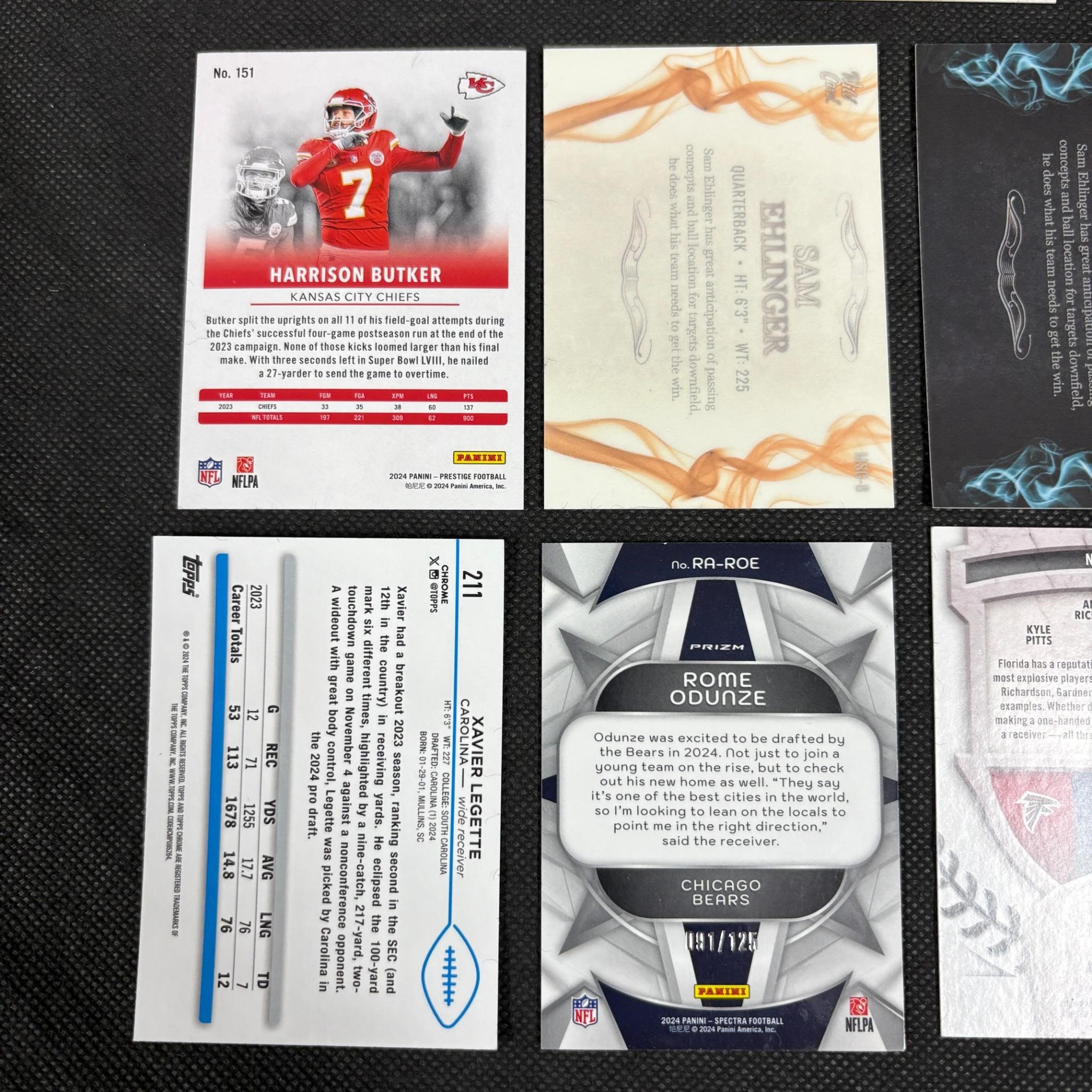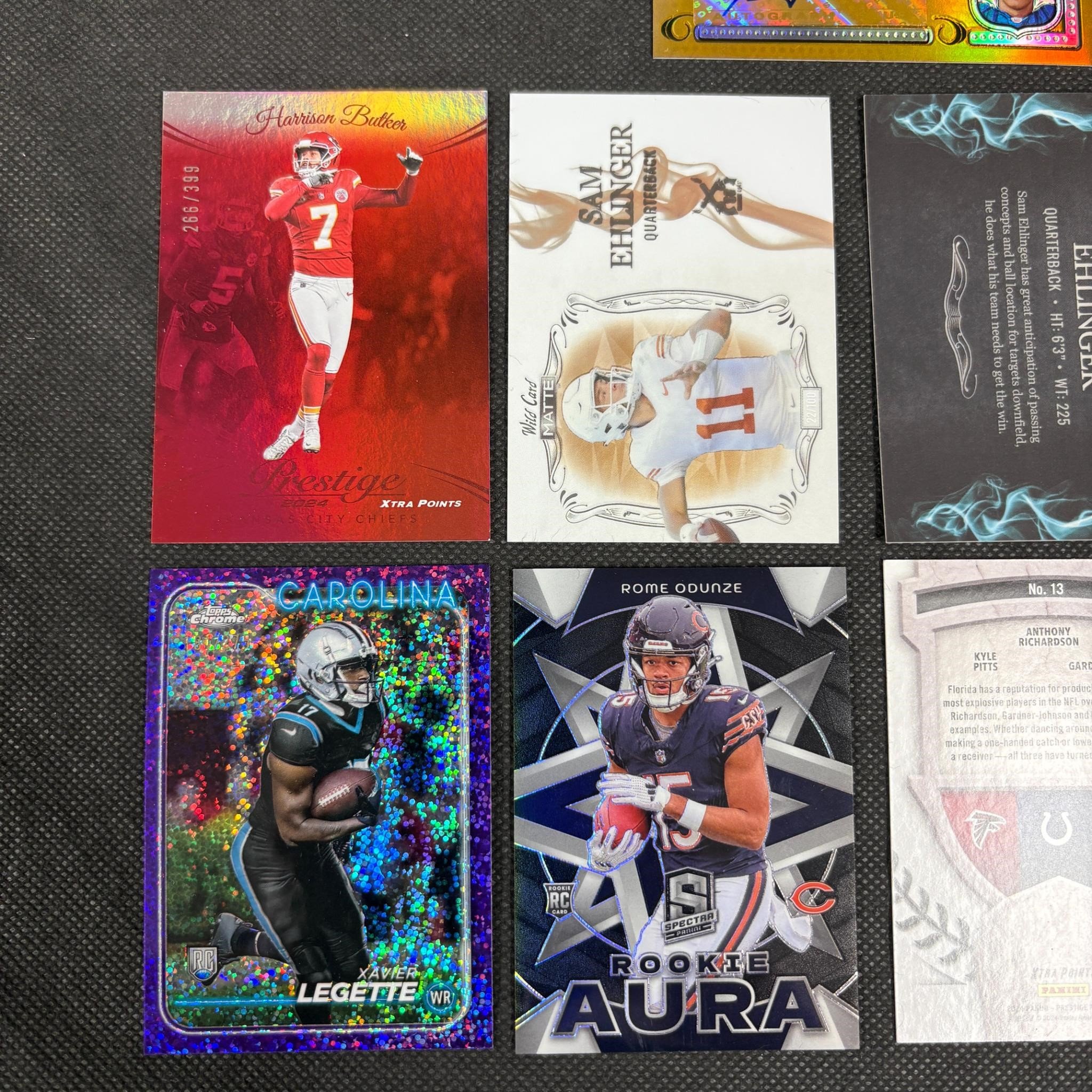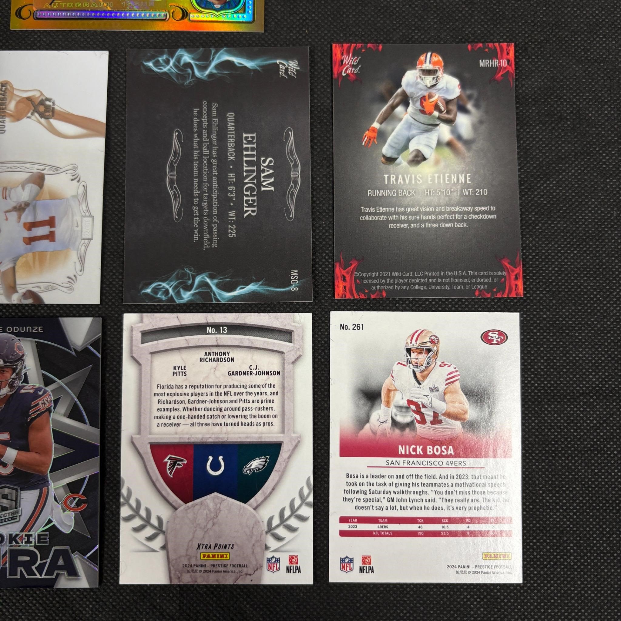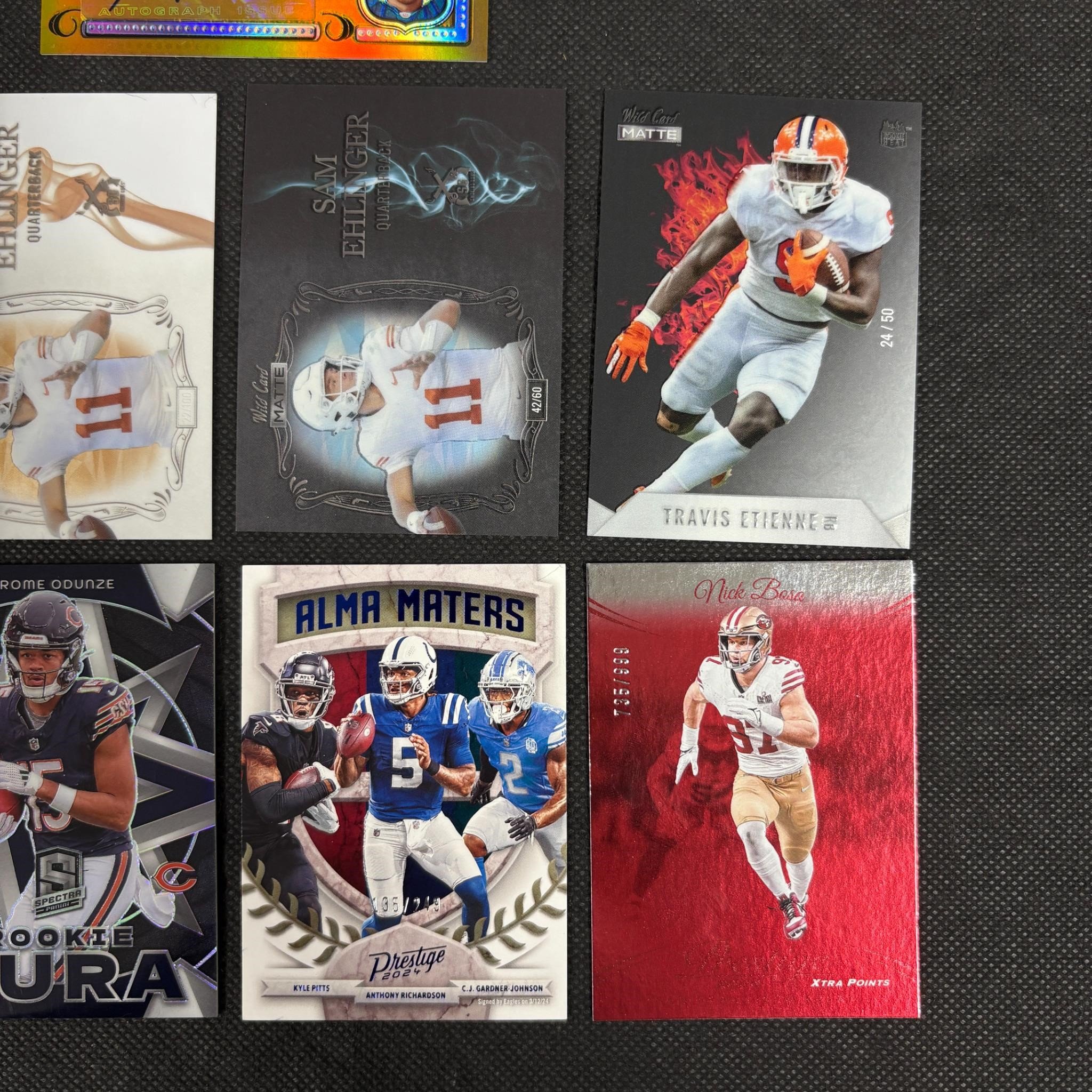Travis Etienne #/50, Nick Bosa #/999, Anthony Richardson #/249, Sam Ehlinger #/60, Rome Odunze Rookie #/125, Xavier Legette Rookie Topps Chrome #/275, Pttman Gonzalez Double Auto #/250. We ship in-house! We ship internationally. We also offer pick up and we offer a discount for cash payments. Please look at pictures carefully to determine what you believe are the condition of each lot. We offer in person or virtual previews and we can take additional pictures, or answer questions about any lot until about 24 hours prior to auction. So all lots sold as is. By choosing which card to use to register to bid, you authorize the auction host to charge the card on file at the end of the auction to pay for any lots and shipping you won. Happy Bidding and Best of luck!
