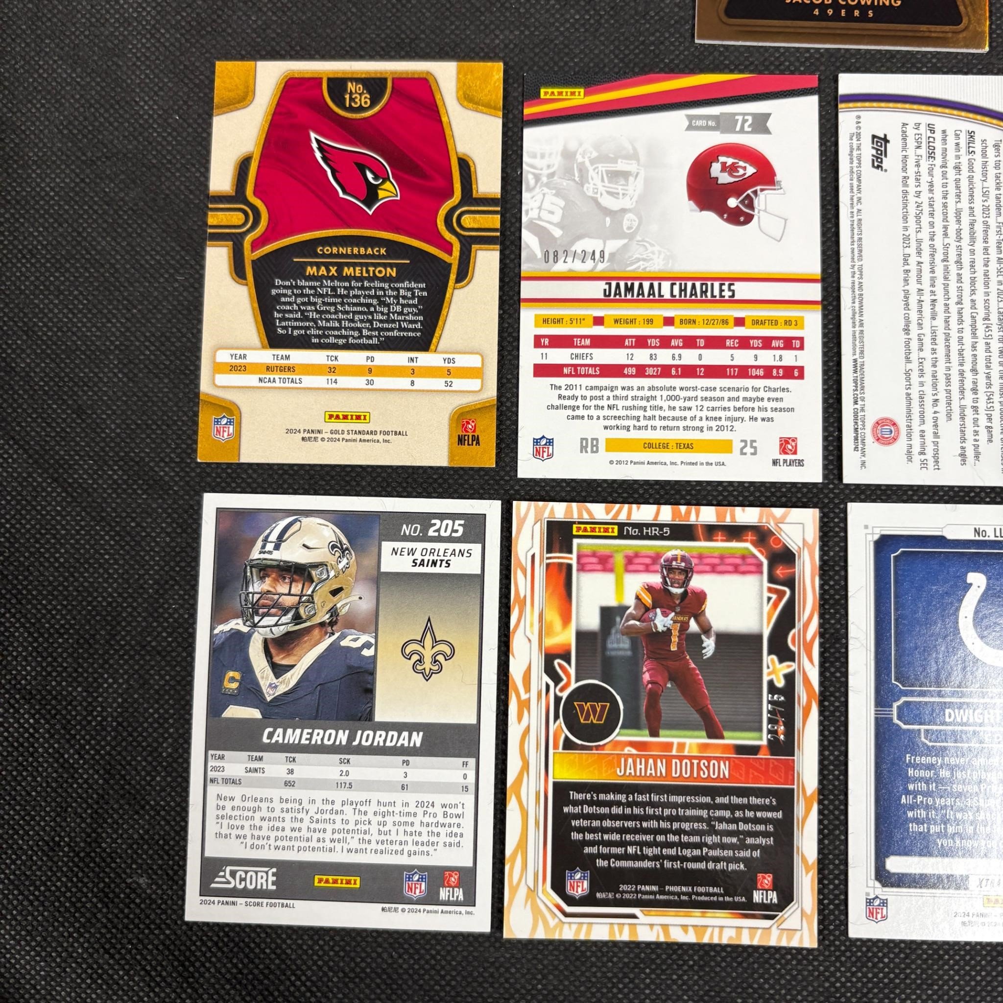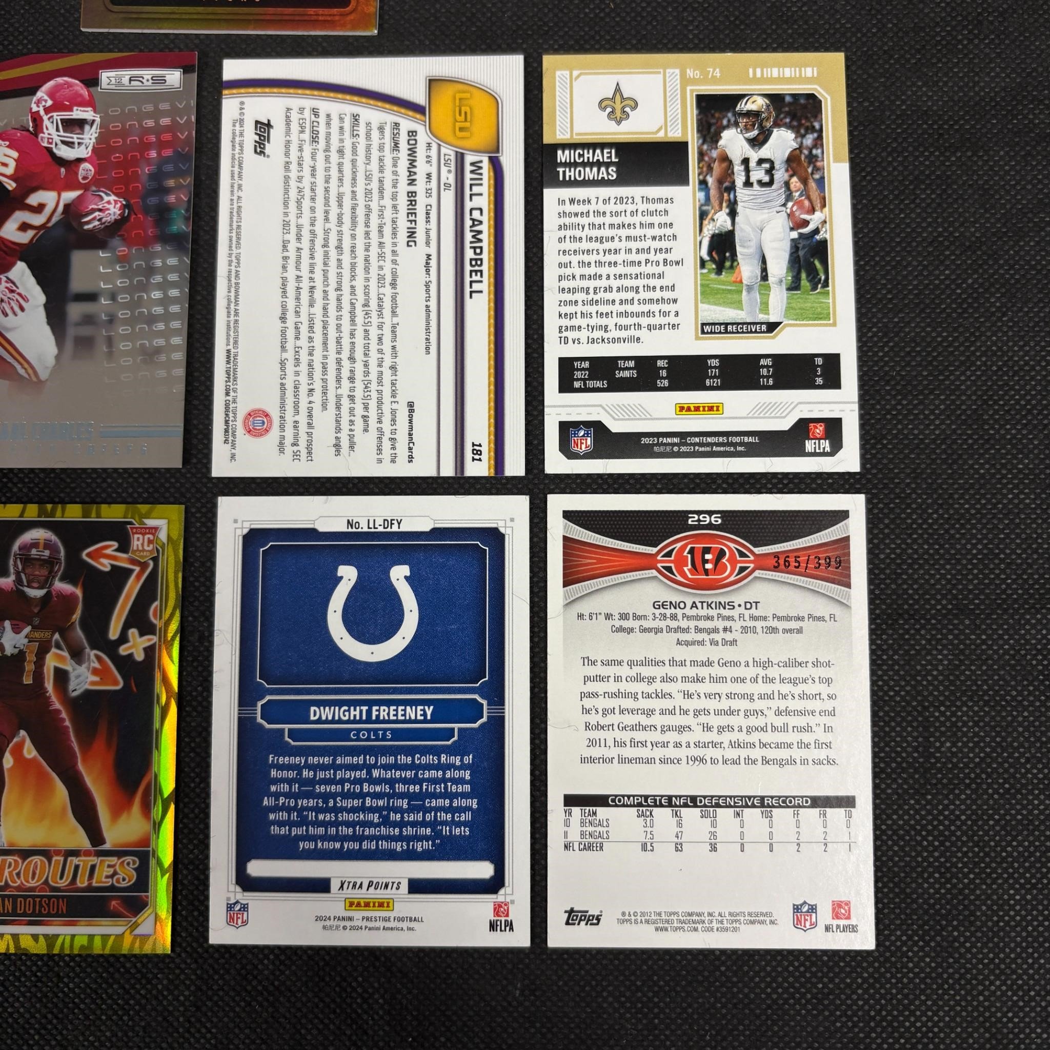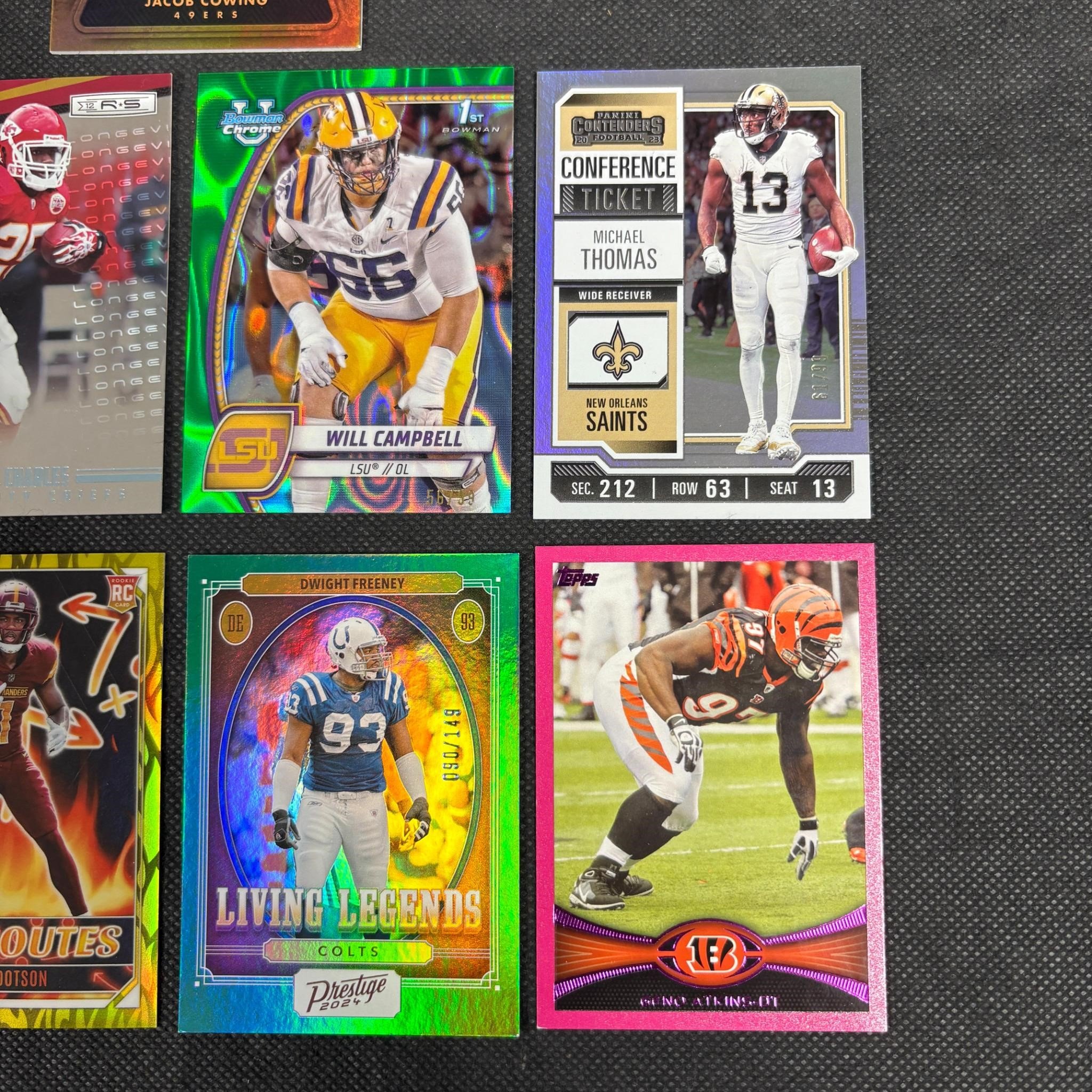 Includes Geno Atkins #/399, Michael Thomas #/99, Will Campbell #/99, Dwight Freeney #149, Jahan Dotson Rookie #/399, Jamaal Charles #249, Max Melton #99, Cameron Jordan #/399, and Jacob Cowing Rookie #/40. We ship in-house! We ship internationally. We also offer pick up and we offer a discount for cash payments. Please look at pictures carefully to determine what you believe are the condition of each lot. We offer in person or virtual previews and we can take additional pictures, or answer questions about any lot until about 24 hours prior to auction. So all lots sold as is. By choosing which card to use to register to bid, you authorize the auction host to charge the card on file at the end of the auction to pay for any lots and shipping you won. Happy Bidding and Best of luck!