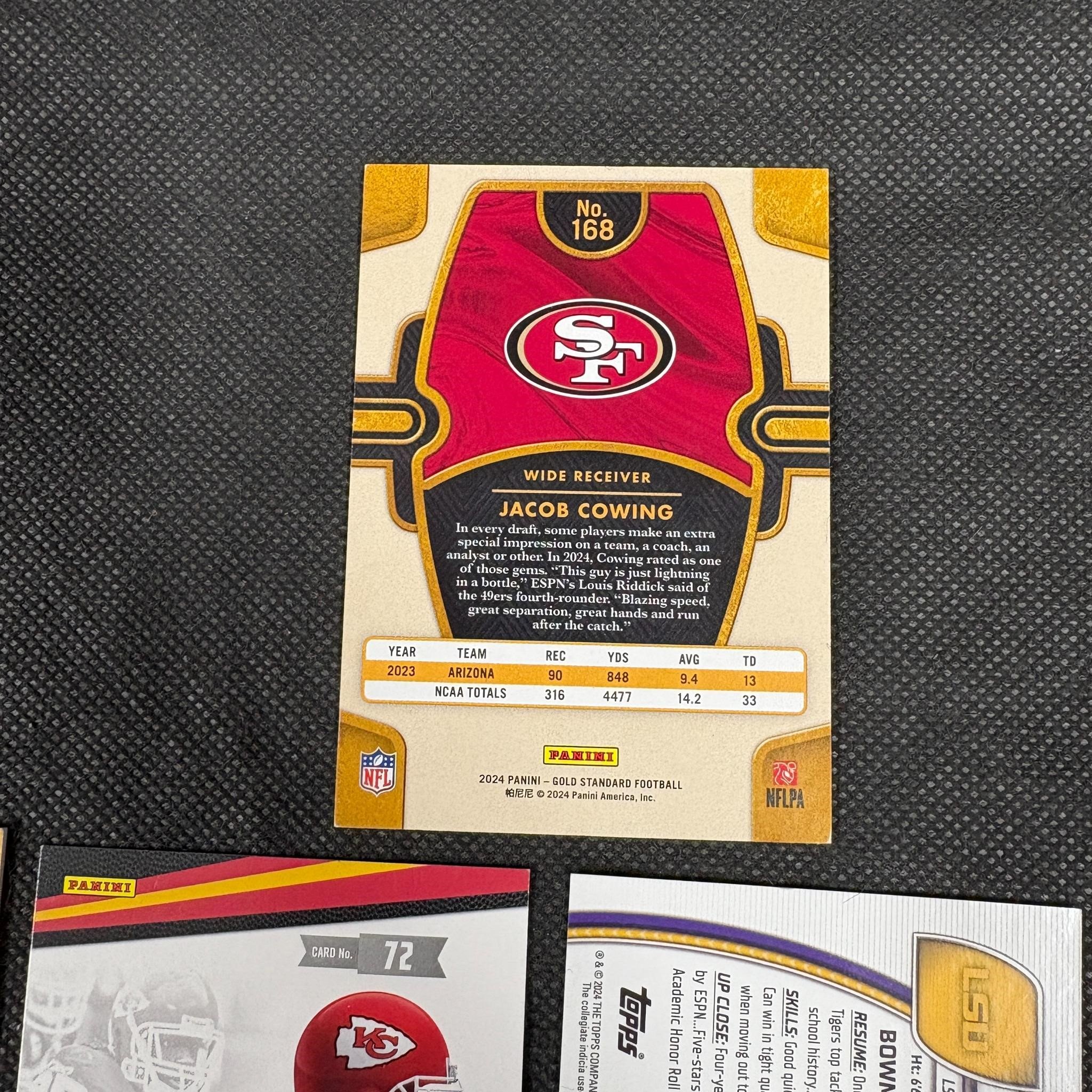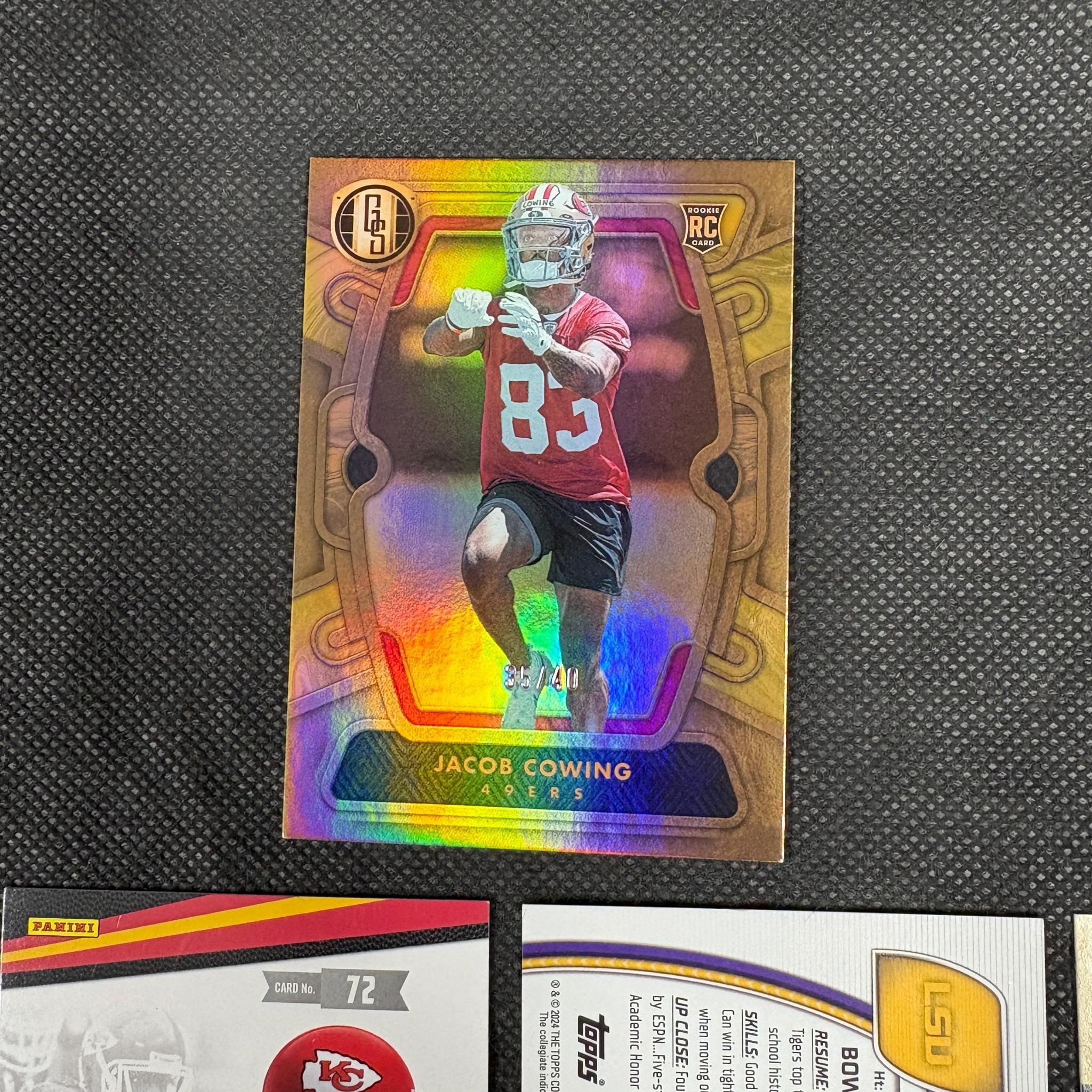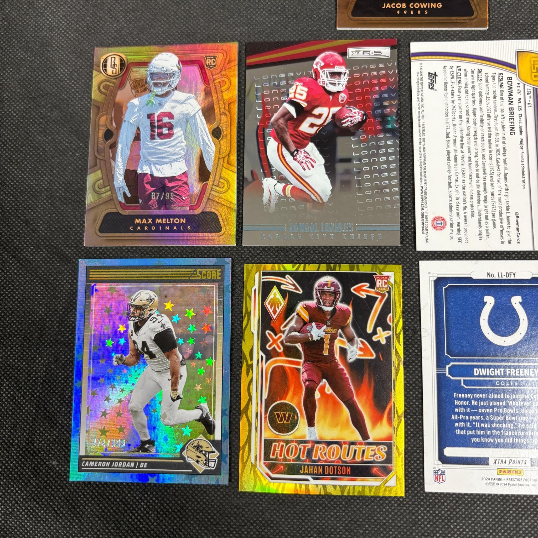 Includes Geno Atkins #/399, Michael Thomas #/99, Will Campbell #/99, Dwight Freeney #149, Jahan Dotson Rookie #/399, Jamaal Charles #249, Max Melton #99, Cameron Jordan #/399, and Jacob Cowing Rookie #/40. We ship in-house! We ship internationally. We also offer pick up and we offer a discount for cash payments. Please look at pictures carefully to determine what you believe are the condition of each lot. We offer in person or virtual previews and we can take additional pictures, or answer questions about any lot until about 24 hours prior to auction. So all lots sold as is. By choosing which card to use to register to bid, you authorize the auction host to charge the card on file at the end of the auction to pay for any lots and shipping you won. Happy Bidding and Best of luck!