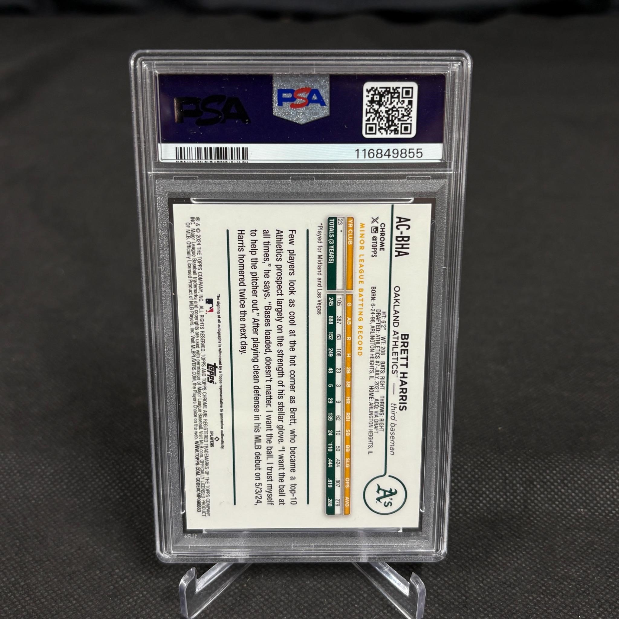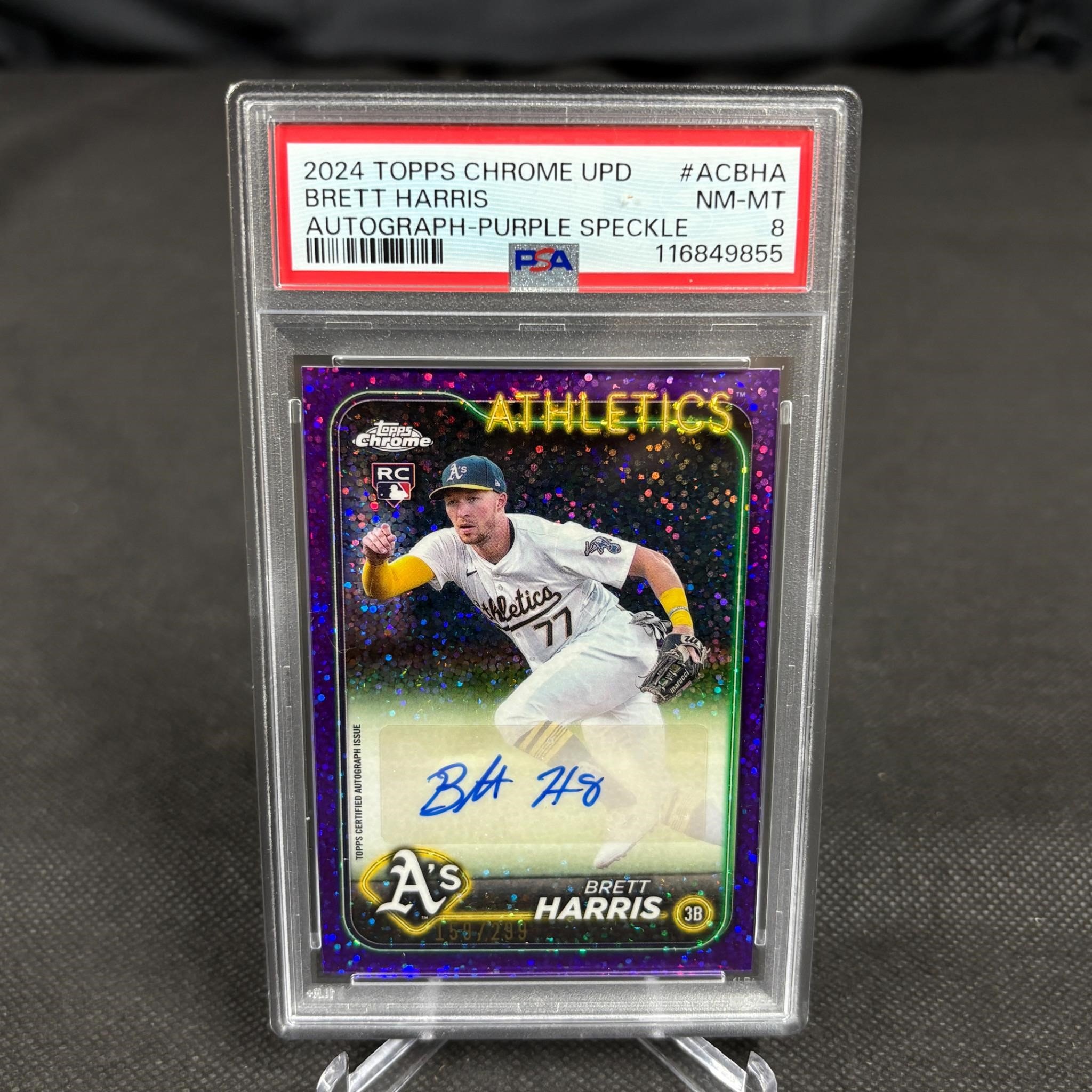 PSA 8 Brett Harris #ACBHA Auto Purple Speckle Baseball Card #/299. We ship in-house! We ship internationally. We also offer pick up and we offer a discount for cash payments. Please look at pictures carefully to determine what you believe are the condition of each lot. We offer in person or virtual previews and we can take additional pictures, or answer questions about any lot until about 24 hours prior to auction. So all lots sold as is. By choosing which card to use to register to bid, you authorize the auction host to charge the card on file at the end of the auction to pay for any lots and shipping you won. Happy Bidding and Best of luck!