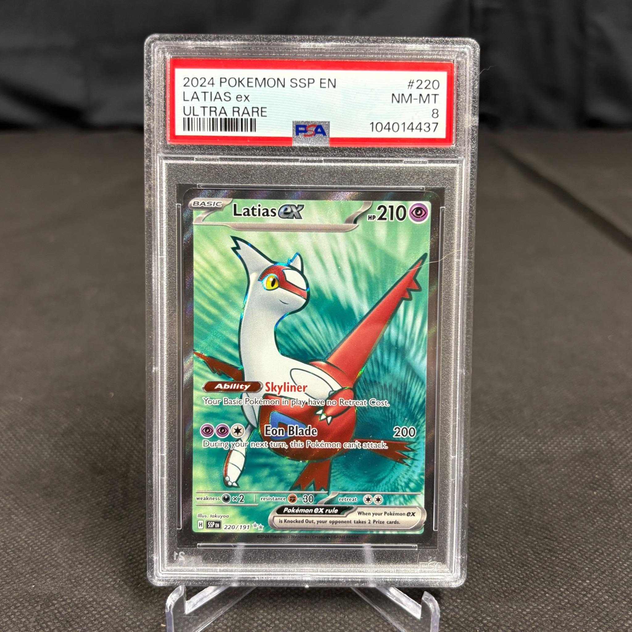 PSA 8 Latias ex #220 Ultra Rare Surging Sparks Pokemon Card. We ship in-house! We ship internationally. We also offer pick up and we offer a discount for cash payments. Please look at pictures carefully to determine what you believe are the condition of each lot. We offer in person or virtual previews and we can take additional pictures, or answer questions about any lot until about 24 hours prior to auction. So all lots sold as is. By choosing which card to use to register to bid, you authorize the auction host to charge the card on file at the end of the auction to pay for any lots and shipping you won. Happy Bidding and Best of luck!