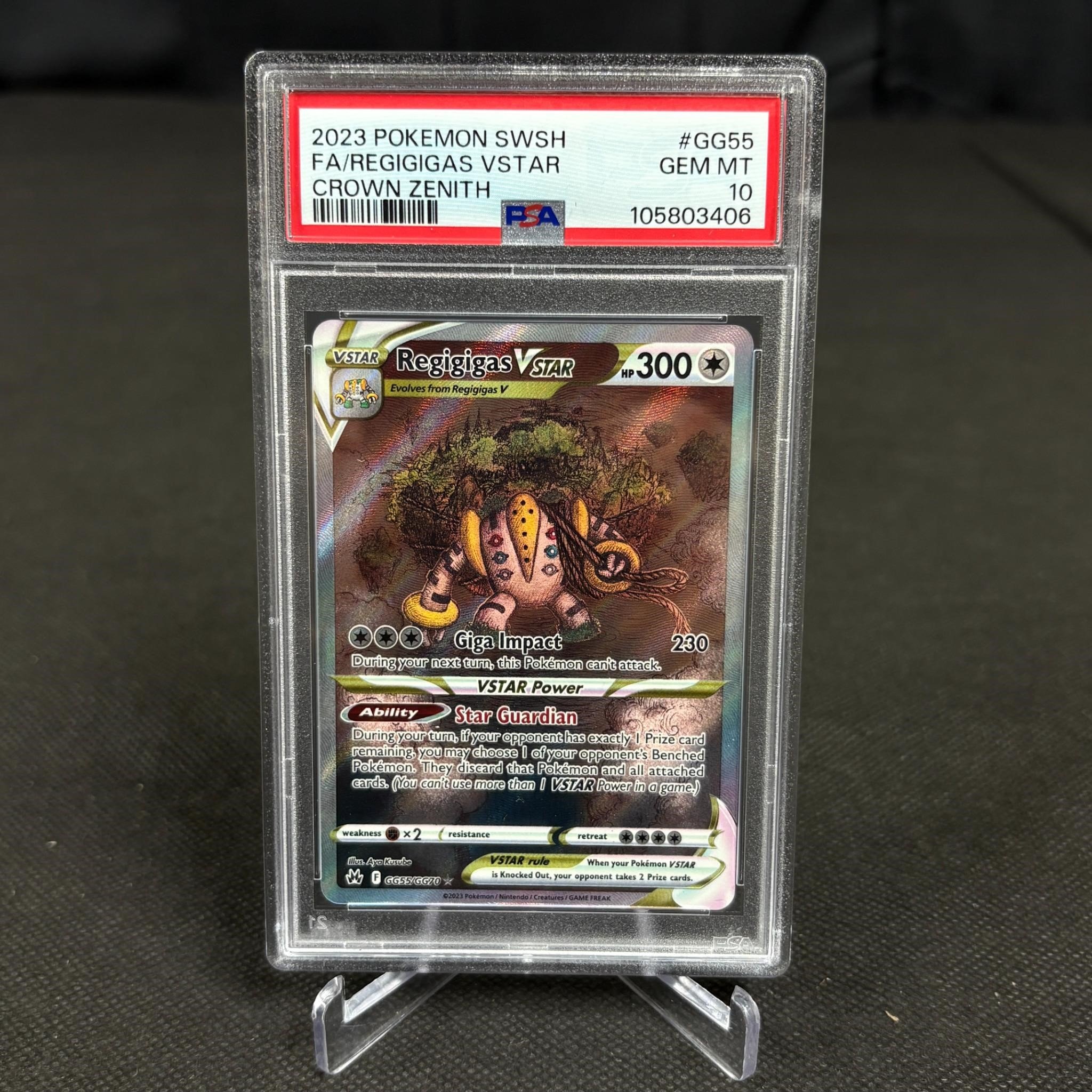 PSA 10 Regigigas VSTAR #GG55 Crown Zenith Pokemon Card. We ship in-house! We ship internationally. We also offer pick up and we offer a discount for cash payments. Please look at pictures carefully to determine what you believe are the condition of each lot. We offer in person or virtual previews and we can take additional pictures, or answer questions about any lot until about 24 hours prior to auction. So all lots sold as is. By choosing which card to use to register to bid, you authorize the auction host to charge the card on file at the end of the auction to pay for any lots and shipping you won. Happy Bidding and Best of luck!