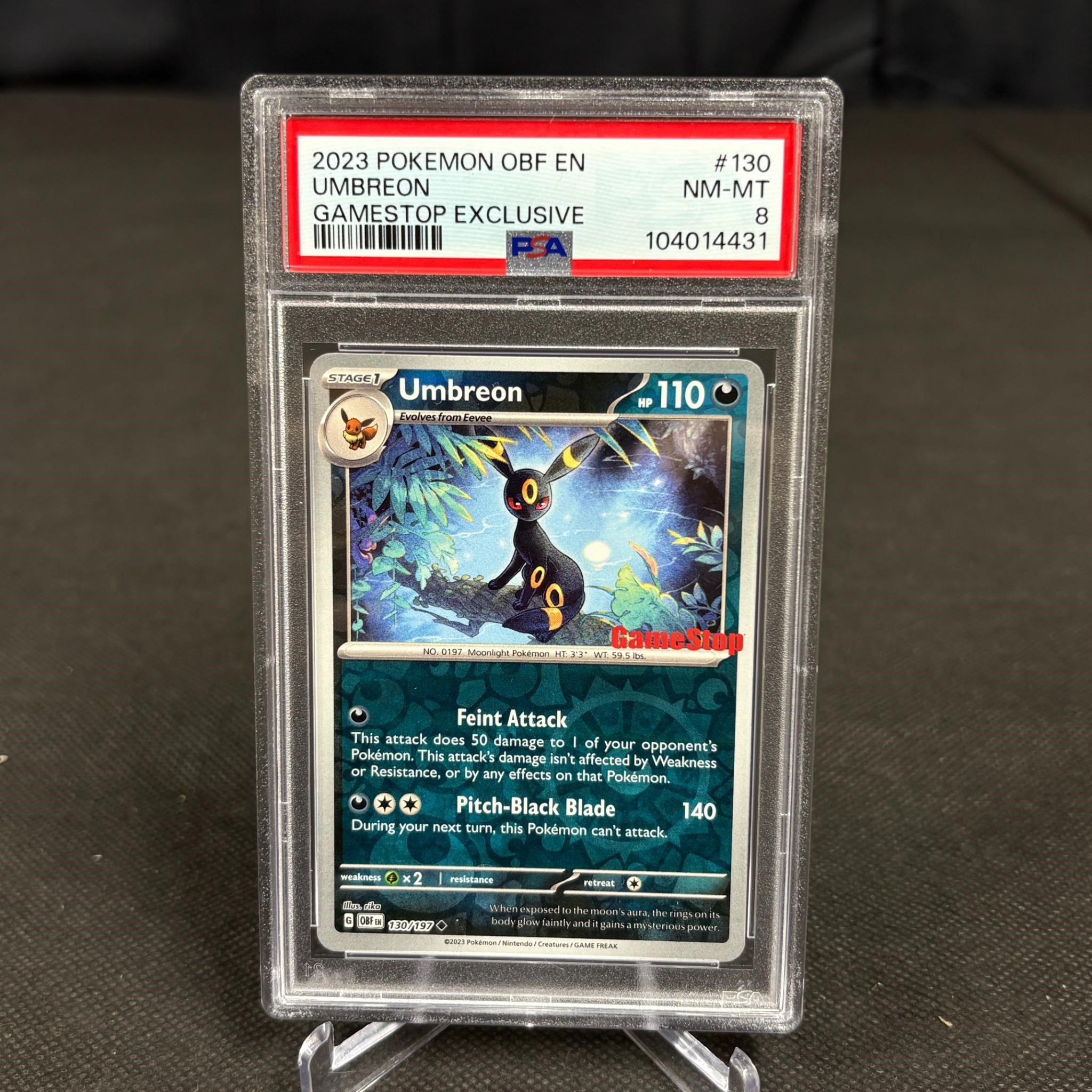 PSA 8 Umbreon #130 Reverse Holo Game Stop Exclusive Stamp Pokemon Card. We ship in-house! We ship internationally. We also offer pick up and we offer a discount for cash payments. Please look at pictures carefully to determine what you believe are the condition of each lot. We offer in person or virtual previews and we can take additional pictures, or answer questions about any lot until about 24 hours prior to auction. So all lots sold as is. By choosing which card to use to register to bid, you authorize the auction host to charge the card on file at the end of the auction to pay for any lots and shipping you won. Happy Bidding and Best of luck!