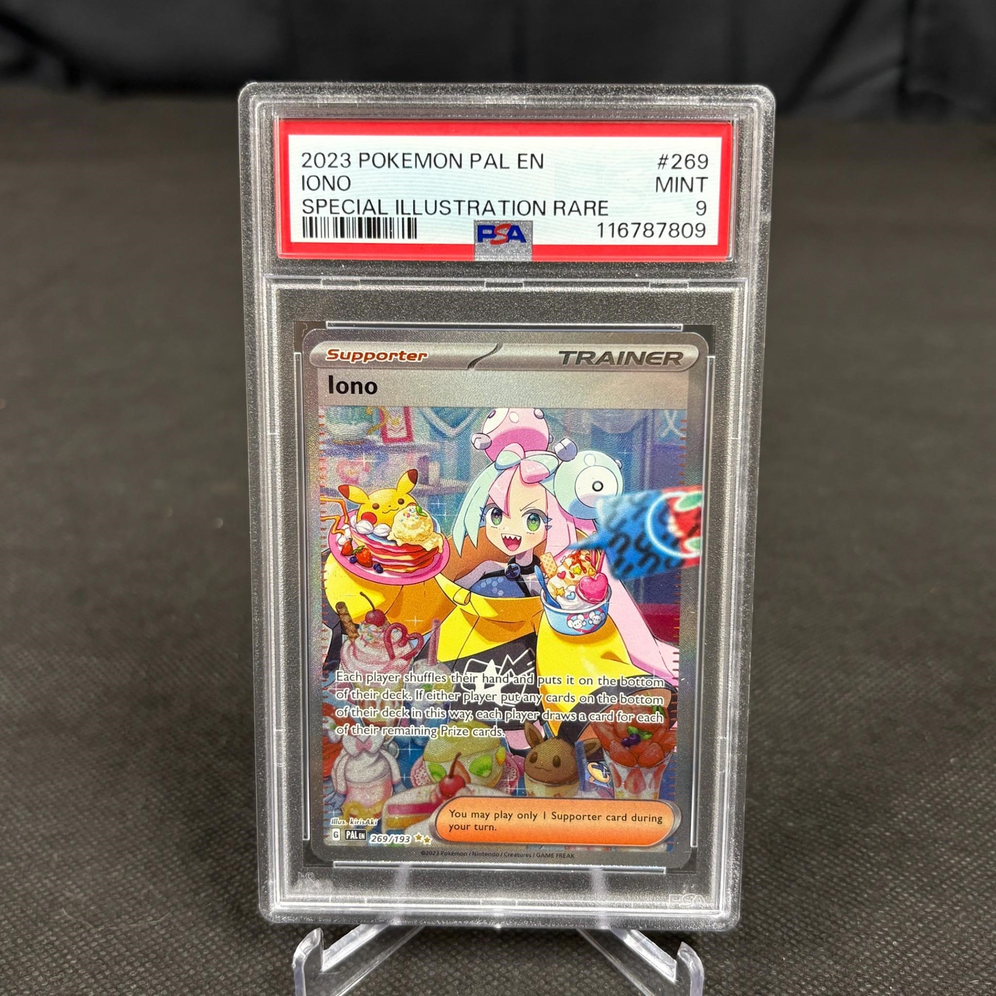 PSA 9 Iono #269 Special Illustration Rare Pokemon Card. We ship in-house! We ship internationally. We also offer pick up and we offer a discount for cash payments. Please look at pictures carefully to determine what you believe are the condition of each lot. We offer in person or virtual previews and we can take additional pictures, or answer questions about any lot until about 24 hours prior to auction. So all lots sold as is. By choosing which card to use to register to bid, you authorize the auction host to charge the card on file at the end of the auction to pay for any lots and shipping you won. Happy Bidding and Best of luck!