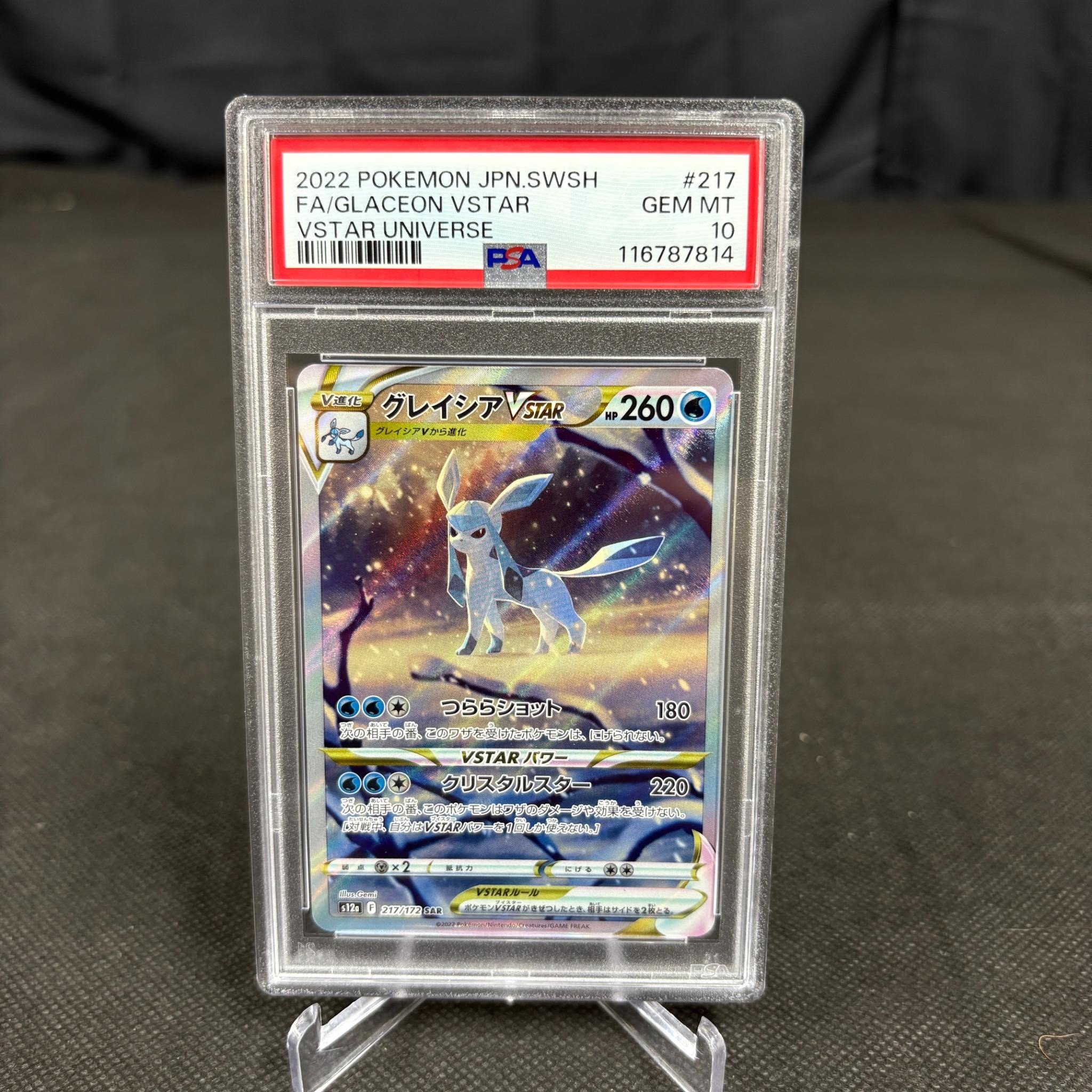 PSA 10 Glaceon VSTAR #217 Special Art Rare VSTAR Universe Japanese Pokemon Card. We ship in-house! We ship internationally. We also offer pick up and we offer a discount for cash payments. Please look at pictures carefully to determine what you believe are the condition of each lot. We offer in person or virtual previews and we can take additional pictures, or answer questions about any lot until about 24 hours prior to auction. So all lots sold as is. By choosing which card to use to register to bid, you authorize the auction host to charge the card on file at the end of the auction to pay for any lots and shipping you won. Happy Bidding and Best of luck!