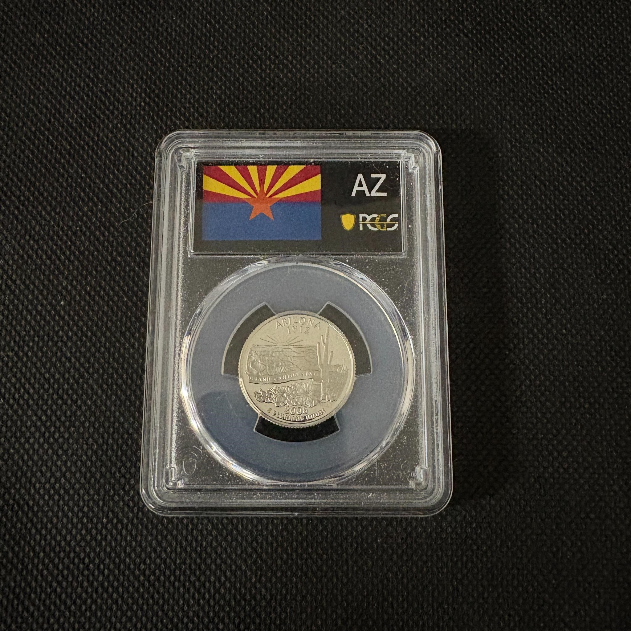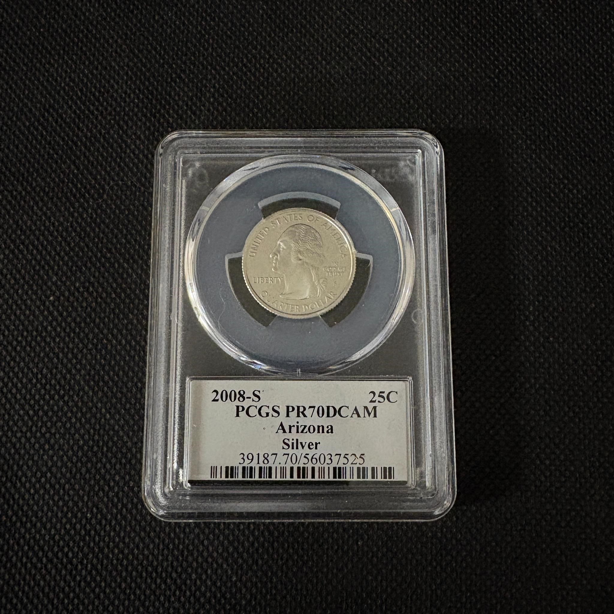 PCGS PR70DCAM Arizona Silver 2008-S Quarter. We ship in-house! We ship internationally. We also offer pick up and we offer a discount for cash payments. Please look at pictures carefully to determine what you believe are the condition of each lot. We offer in person or virtual previews and we can take additional pictures, or answer questions about any lot until about 24 hours prior to auction. So all lots sold as is. By choosing which card to use to register to bid, you authorize the auction host to charge the card on file at the end of the auction to pay for any lots and shipping you won. Happy Bidding and Best of luck!