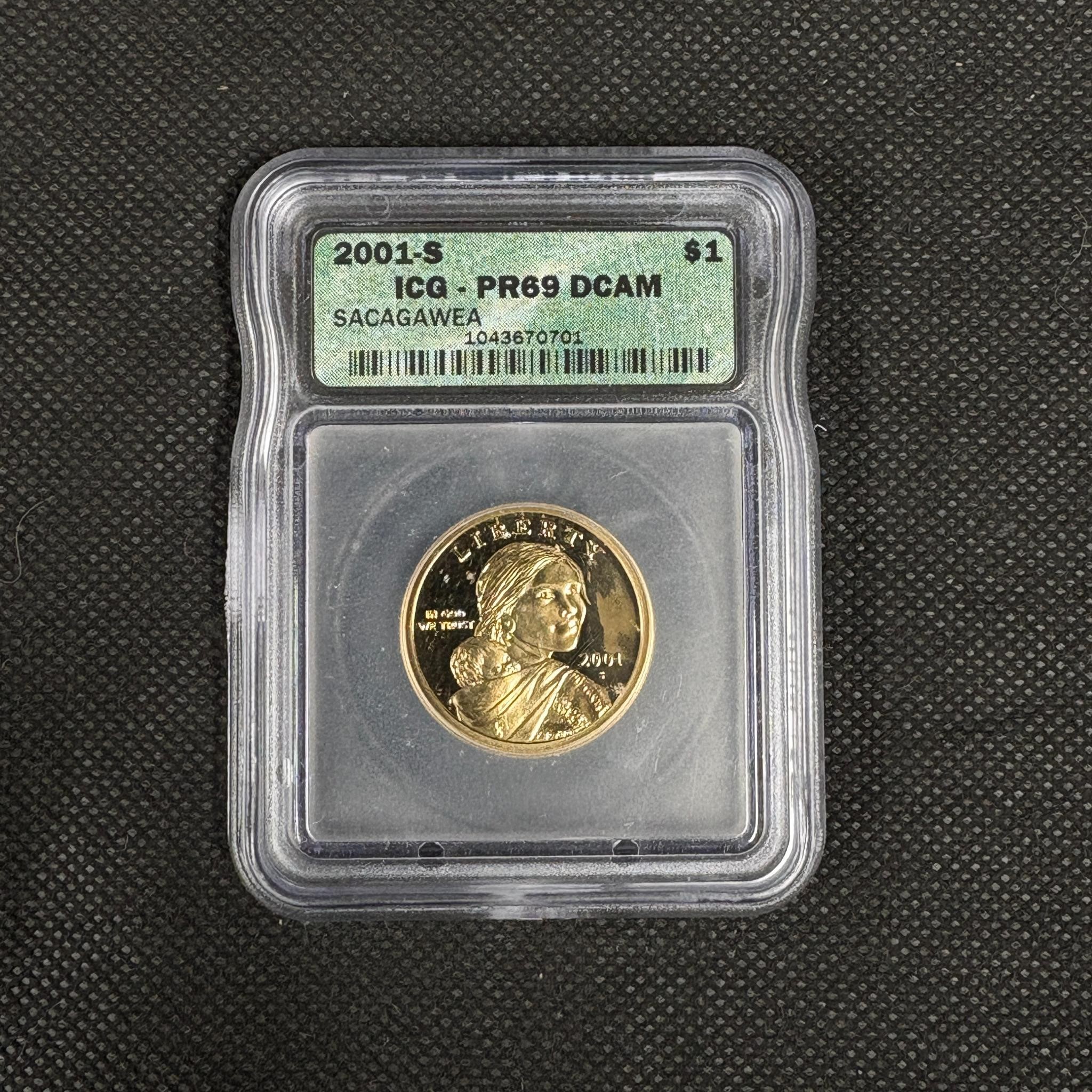 ICG PR69 DCAM Graded 2001 S Sacagawea $1 Coin. We ship in-house! We ship internationally. We also offer pick up and we offer a discount for cash payments. Please look at pictures carefully to determine what you believe are the condition of each lot. We offer in person or virtual previews and we can take additional pictures, or answer questions about any lot until about 24 hours prior to auction. So all lots sold as is. By choosing which card to use to register to bid, you authorize the auction host to charge the card on file at the end of the auction to pay for any lots and shipping you won. Happy Bidding and Best of luck!