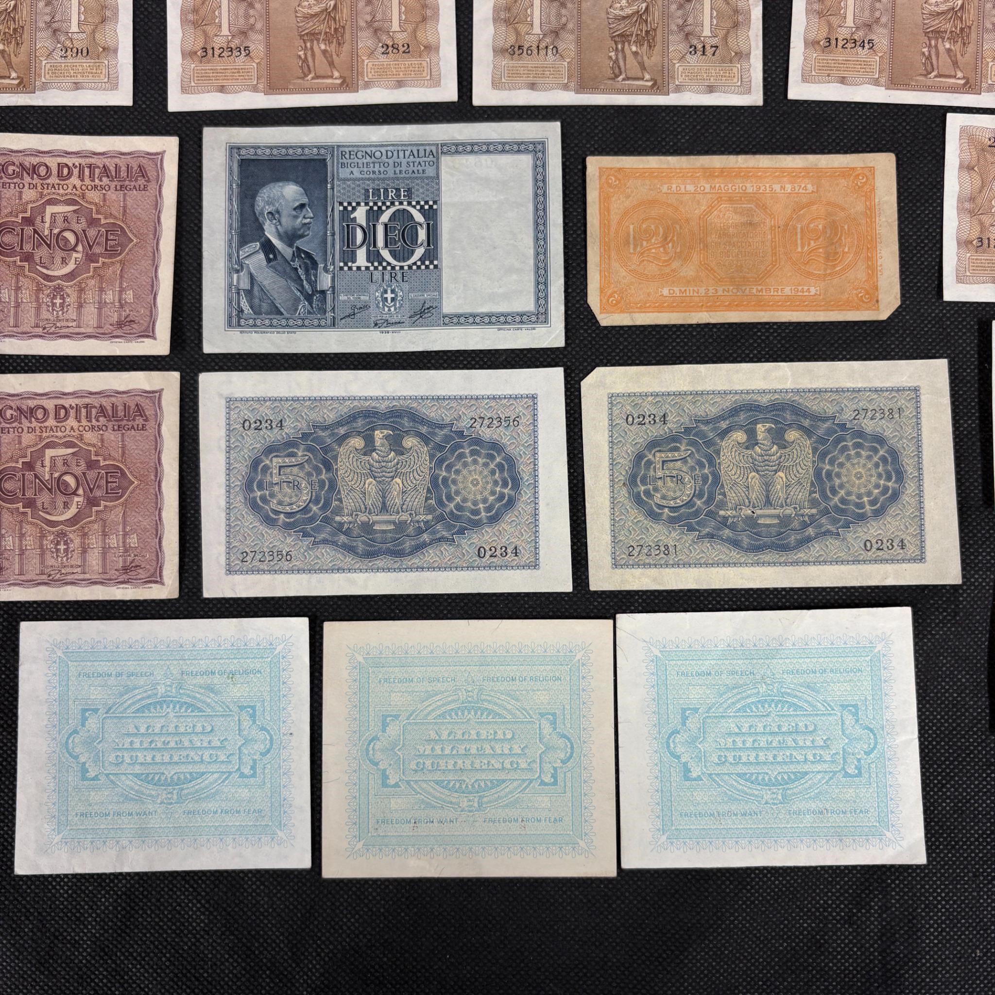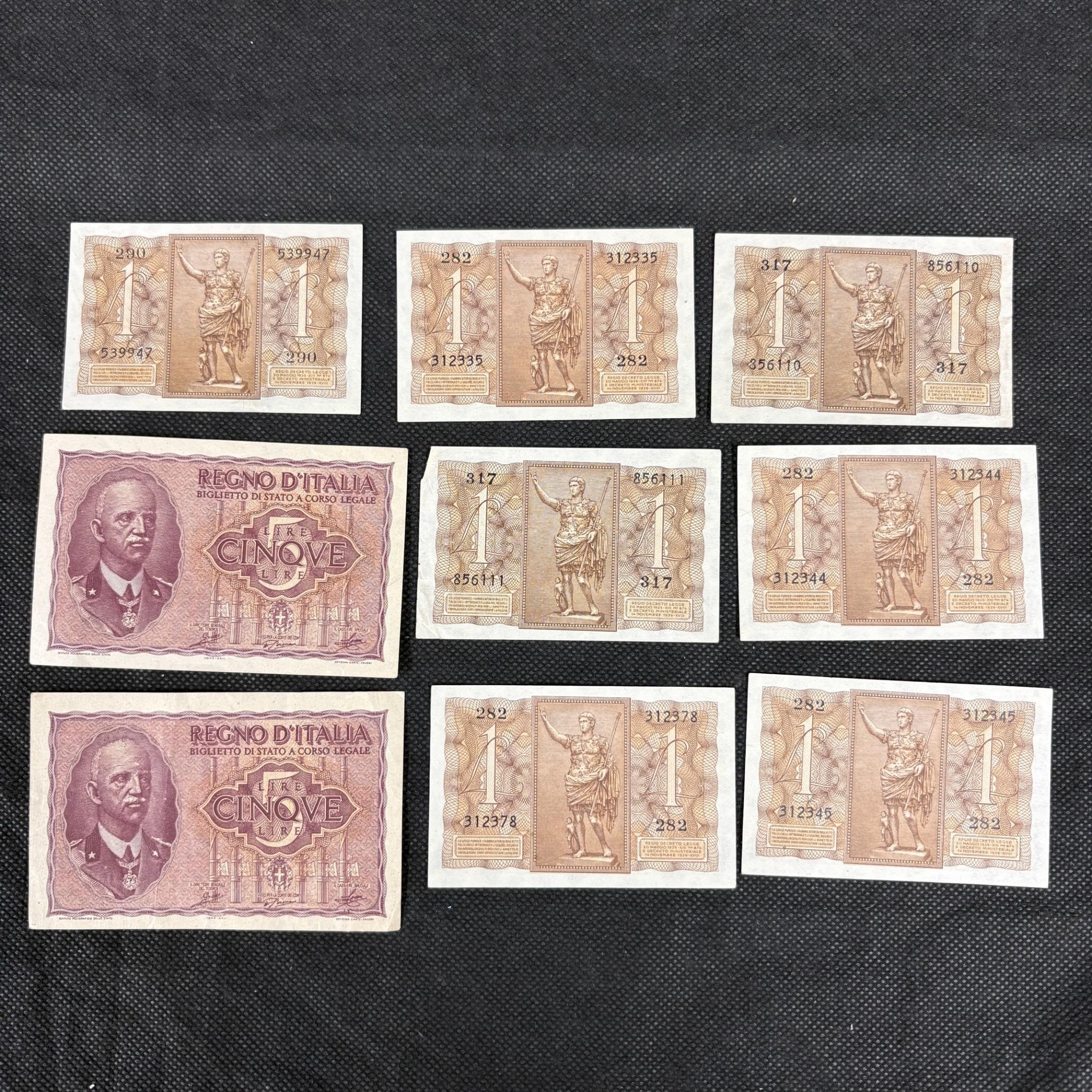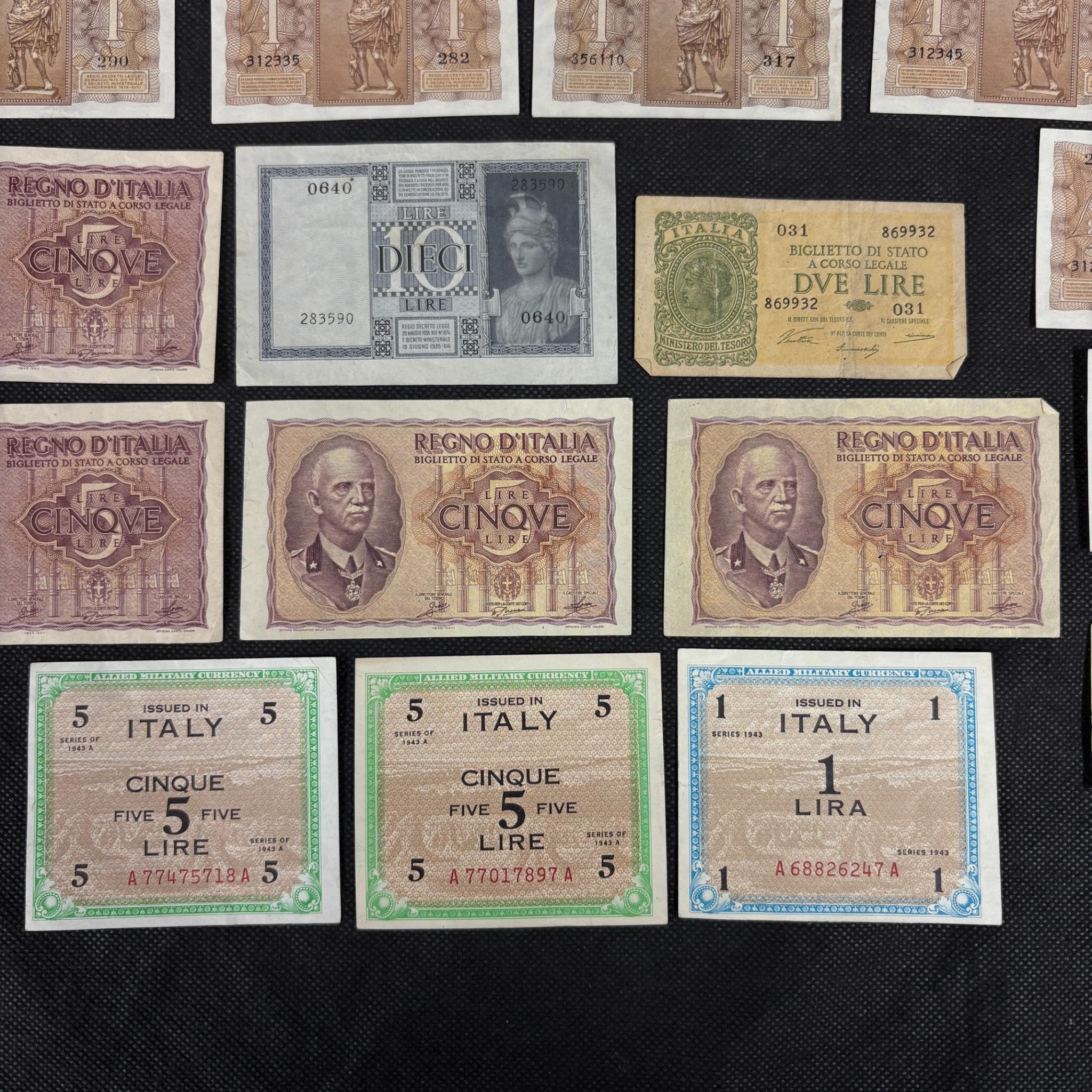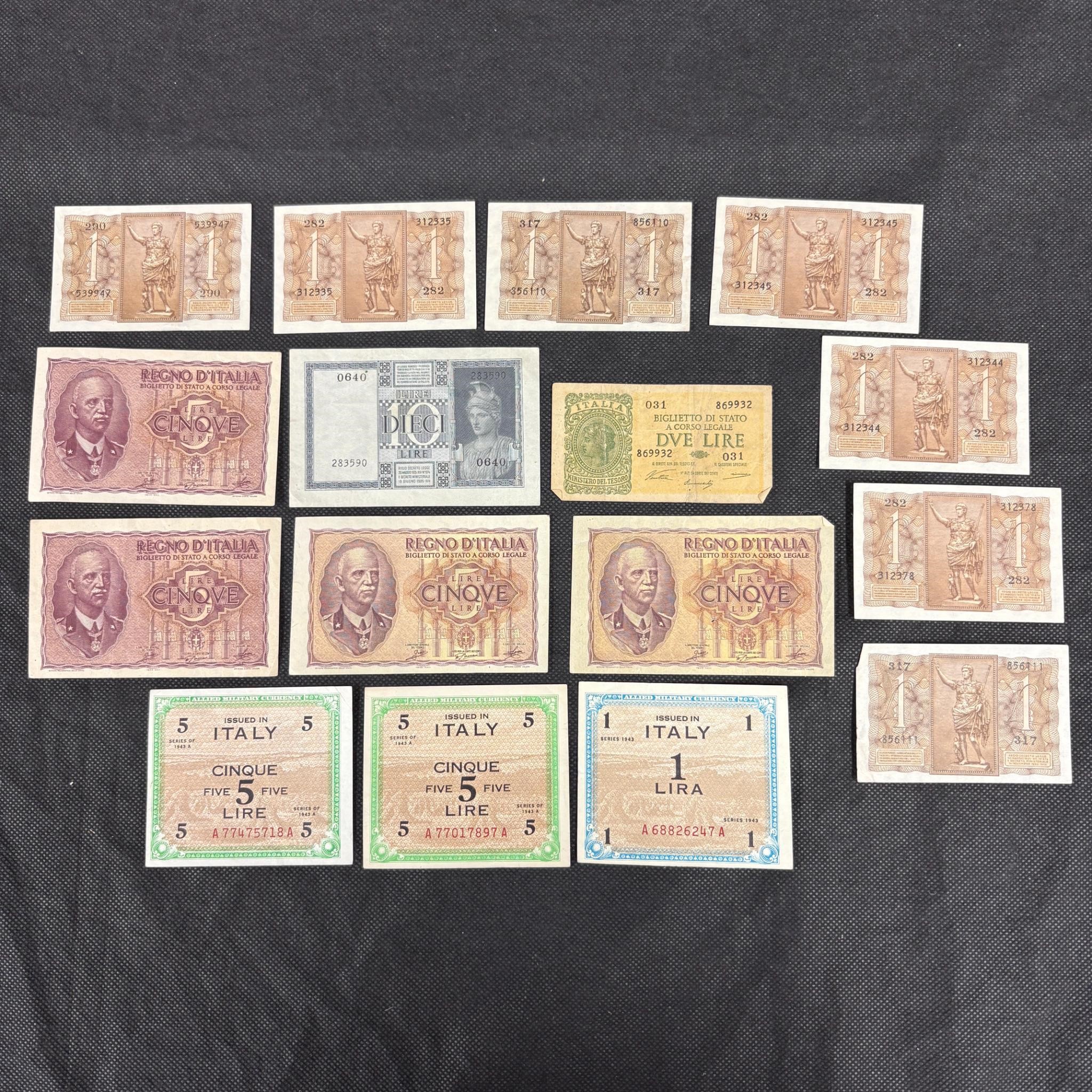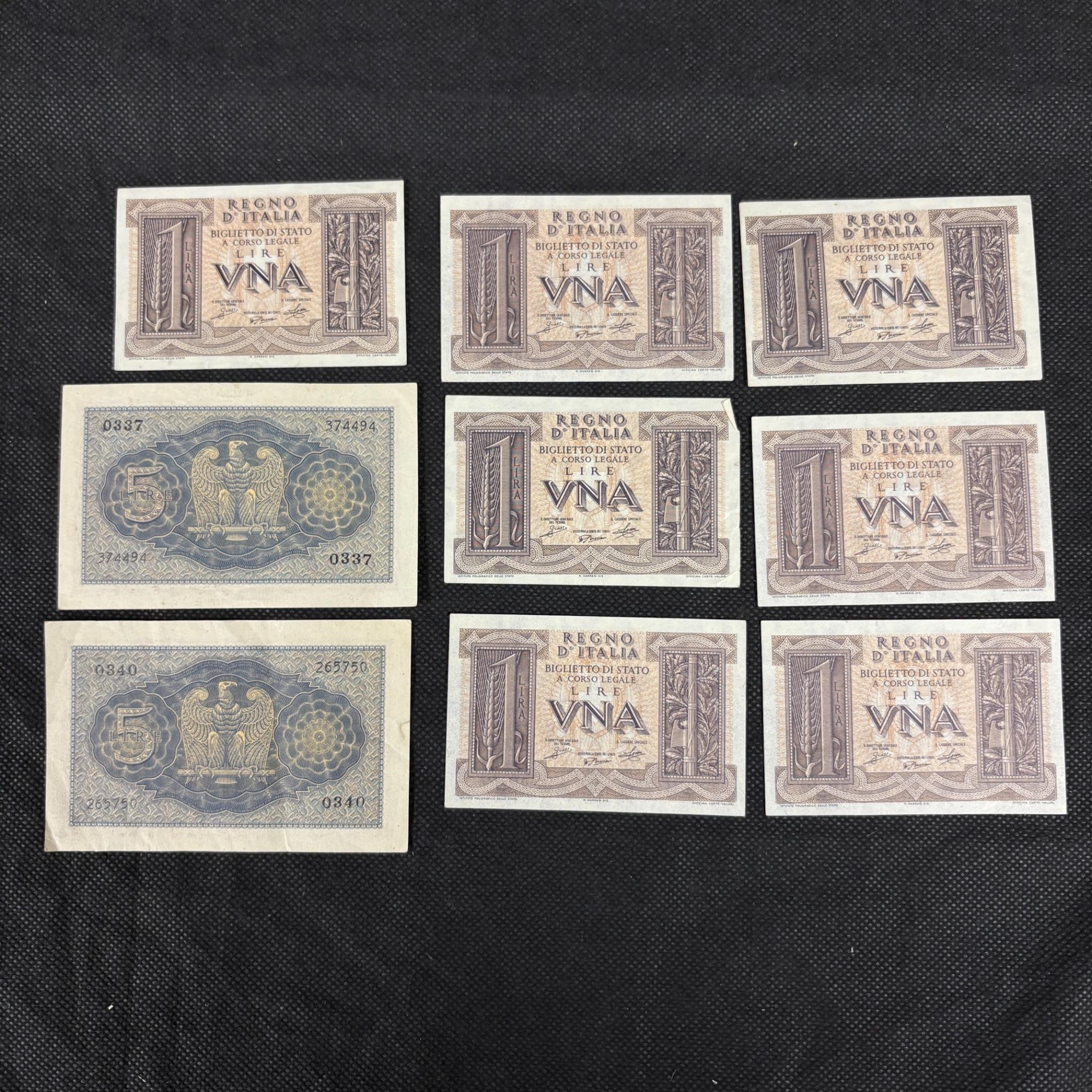 1939 1 Lire Empire Series Italian Bank Note, 1935 10 Lire, 1940s 2 Lire, 1940 and 1944 5 lire Italy Kingdom Bank Note, 1943 Allied Military 5 and 2 Lira Bilingual Italian Bank Notes. We ship in-house! We ship internationally. We also offer pick up and we offer a discount for cash payments. Please look at pictures carefully to determine what you believe are the condition of each lot. We offer in person or virtual previews and we can take additional pictures, or answer questions about any lot until about 24 hours prior to auction. So all lots sold as is. By choosing which card to use to register to bid, you authorize the auction host to charge the card on file at the end of the auction to pay for any lots and shipping you won. Happy Bidding and Best of luck!