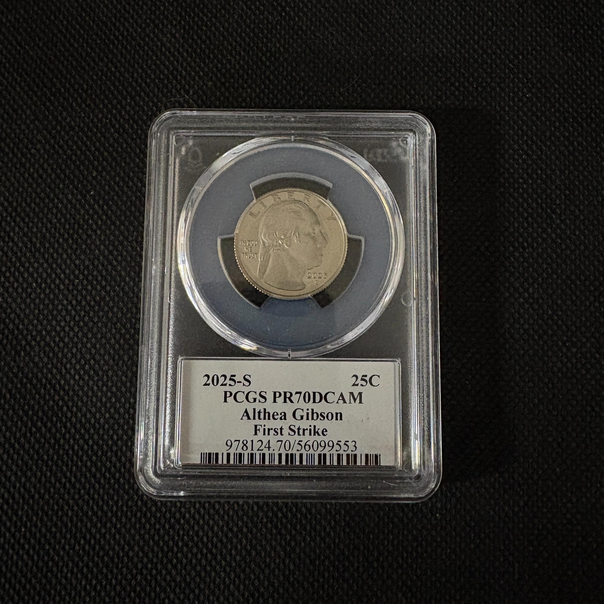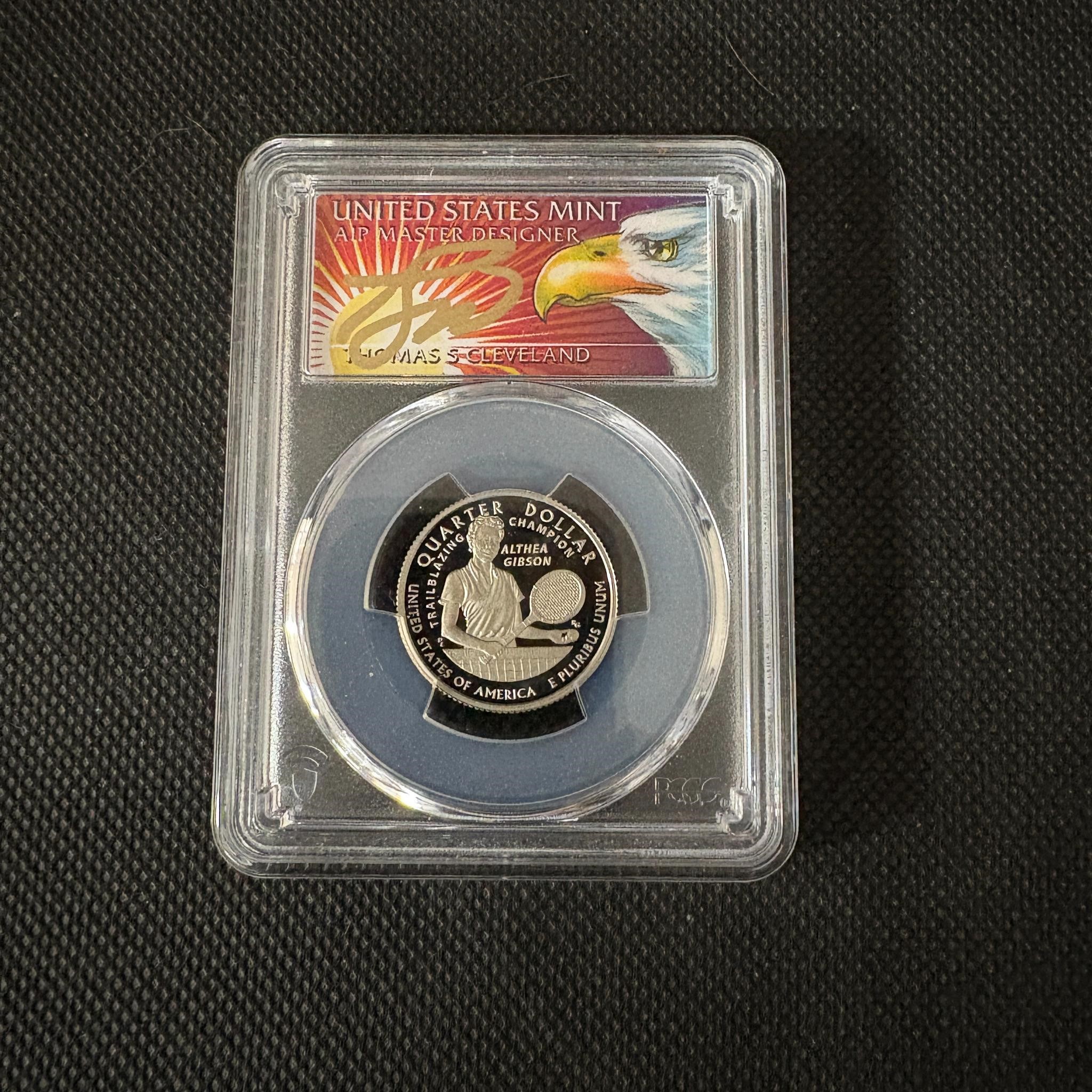PCGS PR70DCAM Althea Gibson Signed AIP Master Designer United States Mint Thomas S Cleveland 2025-S First Strike Quarter. We ship in-house! We ship internationally. We also offer pick up and we offer a discount for cash payments. Please look at pictures carefully to determine what you believe are the condition of each lot. We offer in person or virtual previews and we can take additional pictures, or answer questions about any lot until about 24 hours prior to auction. So all lots sold as is. By choosing which card to use to register to bid, you authorize the auction host to charge the card on file at the end of the auction to pay for any lots and shipping you won. Happy Bidding and Best of luck!