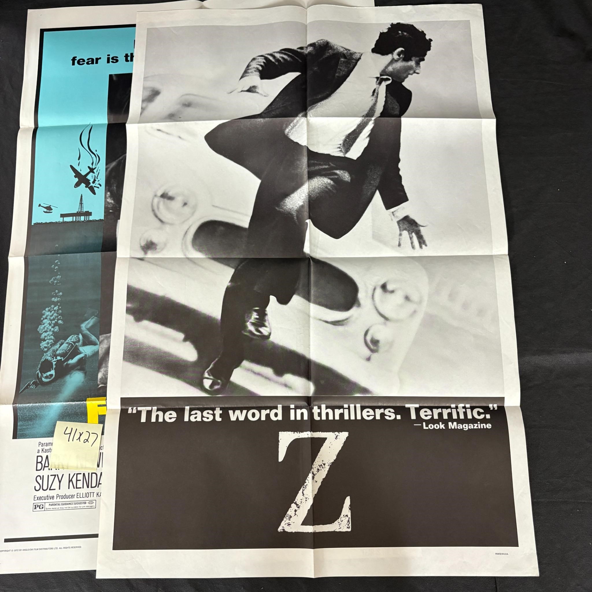 Includes Original One Sheet Posters for Z and Fear is the Key. Dimensions: 41×27. We ship in-house! We ship internationally. We also offer pick up and we offer a discount for cash payments. Please look at pictures carefully to determine what you believe are the condition of each lot. We offer in person or virtual previews and we can take additional pictures, or answer questions about any lot until about 24 hours prior to auction. So all lots sold as is. By choosing which card to use to register to bid, you authorize the auction host to charge the card on file at the end of the auction to pay for any lots and shipping you won. Happy Bidding and Best of luck!
