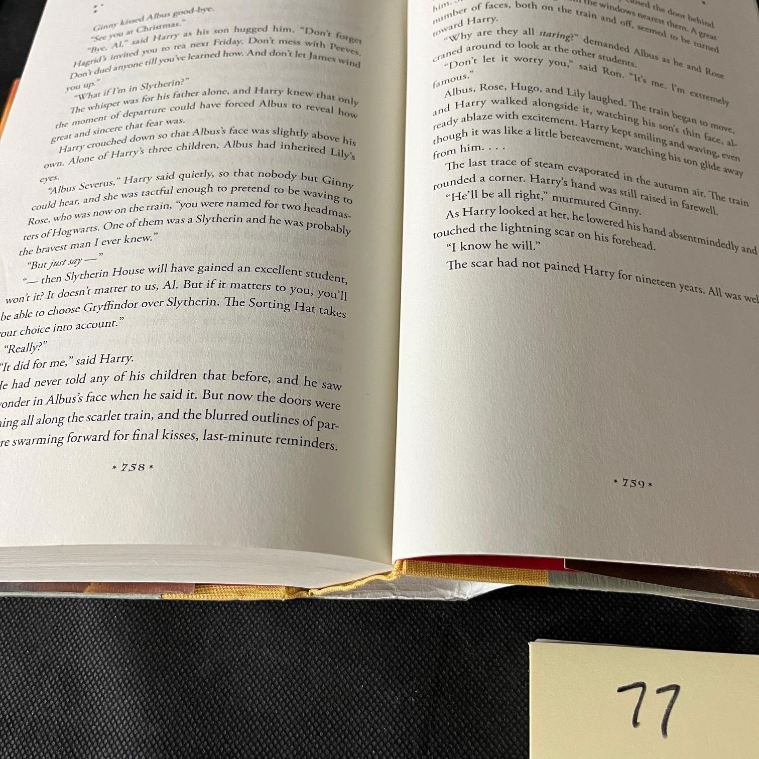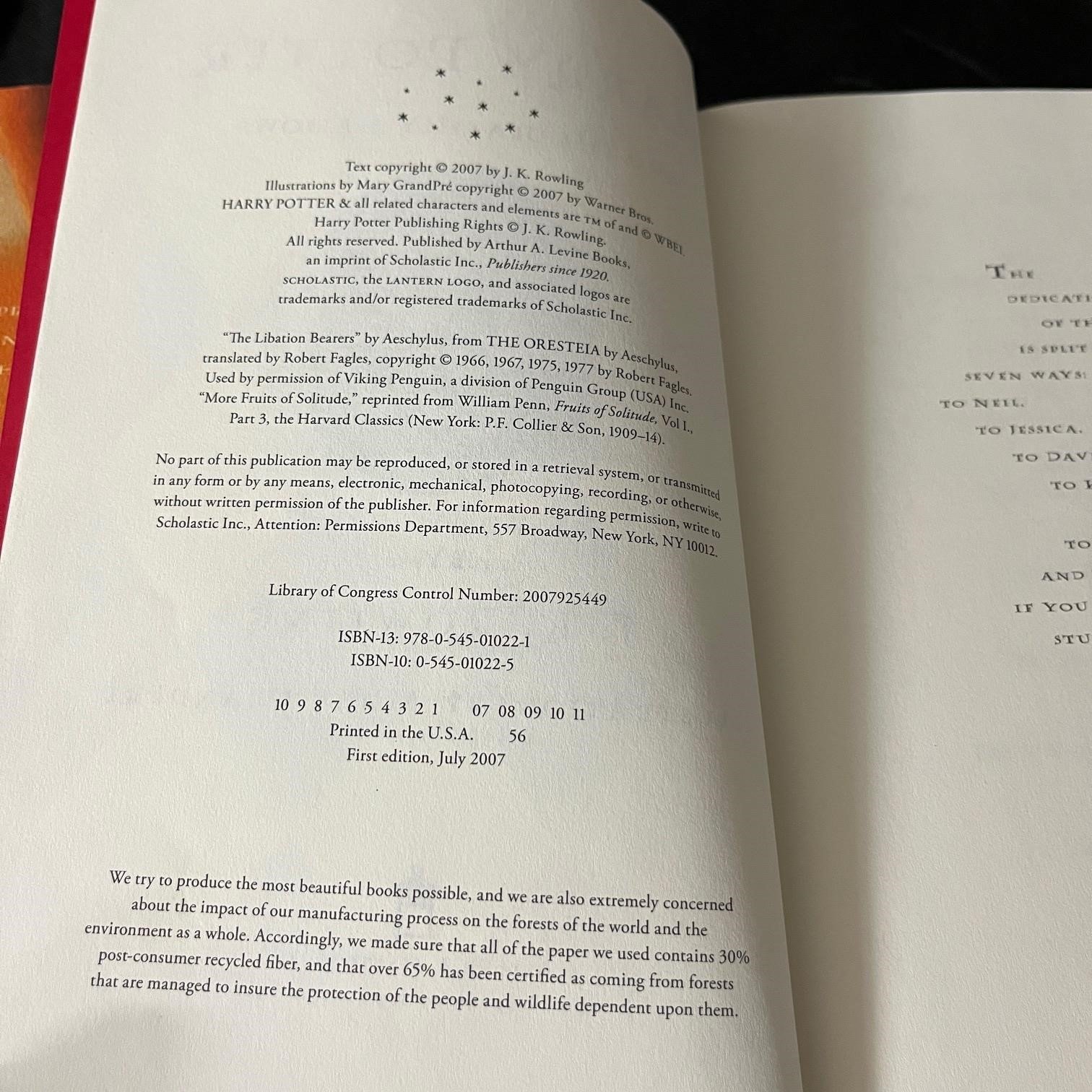 Up for auction is a first edition copy of Harry Potter and the Deathly Hallows. This first edition is the error edition, where the book’s printing ends with page 759. Later editions corrected this mistake so that readers can enjoy the real ending of the book. We ship in-house! We ship internationally. We also offer pick up and we offer a discount for cash payments. Please look at pictures carefully to determine what you believe are the condition of each lot. We offer in person or virtual previews and we can take additional pictures, or answer questions about any lot until about 24 hours prior to auction. So all lots sold as is. By choosing which card to use to register to bid, you authorize the auction host to charge the card on file at the end of the auction to pay for any lots and shipping you won. Happy Bidding and Best of luck!