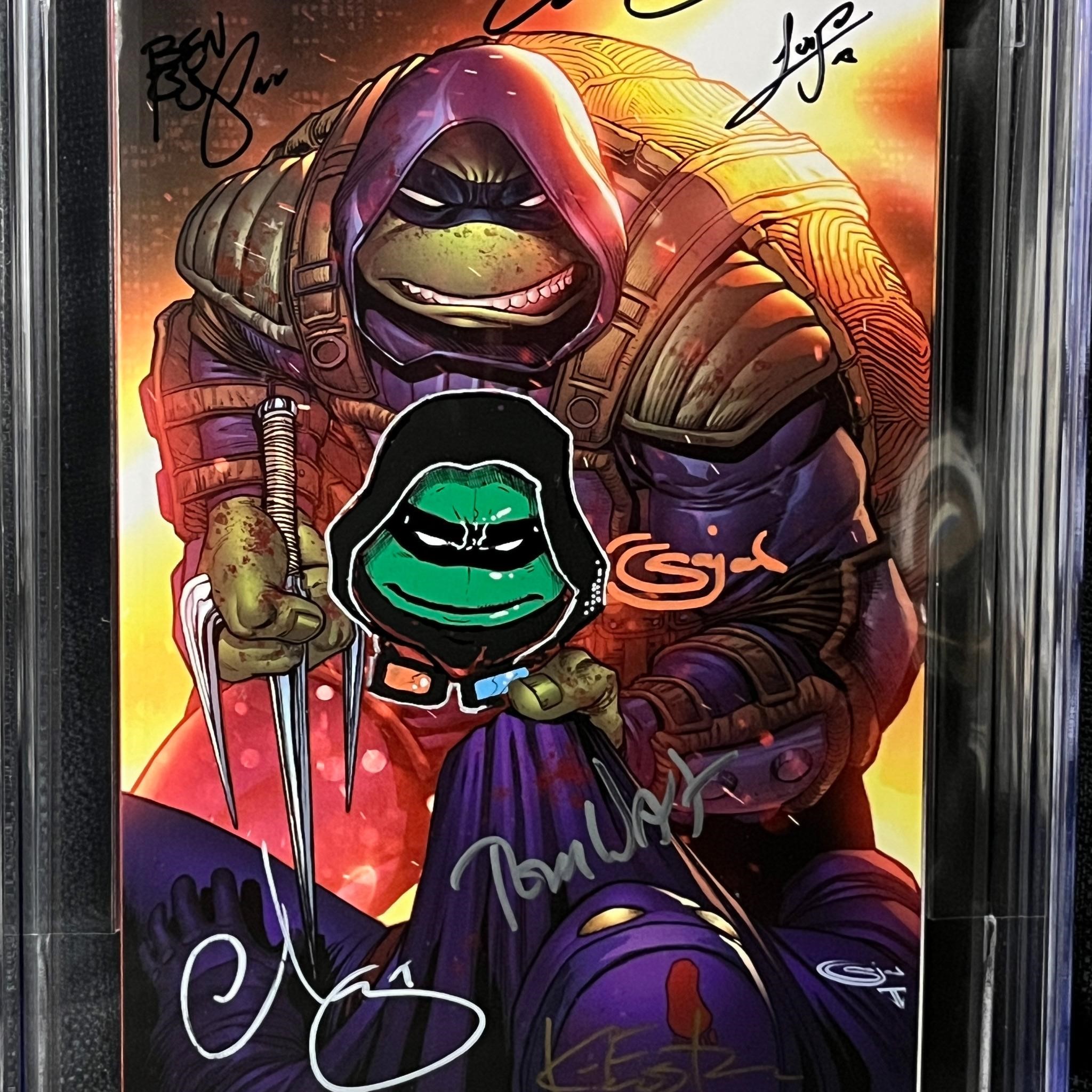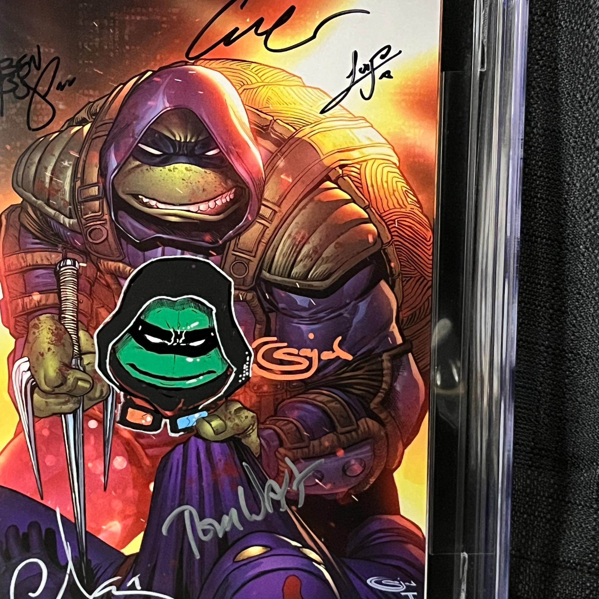 Amazing SEVEN TIMES signature with color sketch. Signed by ben bishop, luis antonia delgado, kevin eastman, esau escorza, isaac escorza, salah shaw, tom waltz. Signatures alone costs over $200! We ship in-house! We ship internationally. We also offer pick up and we offer a discount for cash payments. Please look at pictures carefully to determine what you believe are the condition of each lot. We offer in person or virtual previews and we can take additional pictures, or answer questions about any lot until about 24 hours prior to auction. All lots sold as is. By choosing which card to use to register to bid, you authorize the auction host to charge the card on file at the end of the auction to pay for any lots and shipping you won. Happy Bidding and Best of luck!
