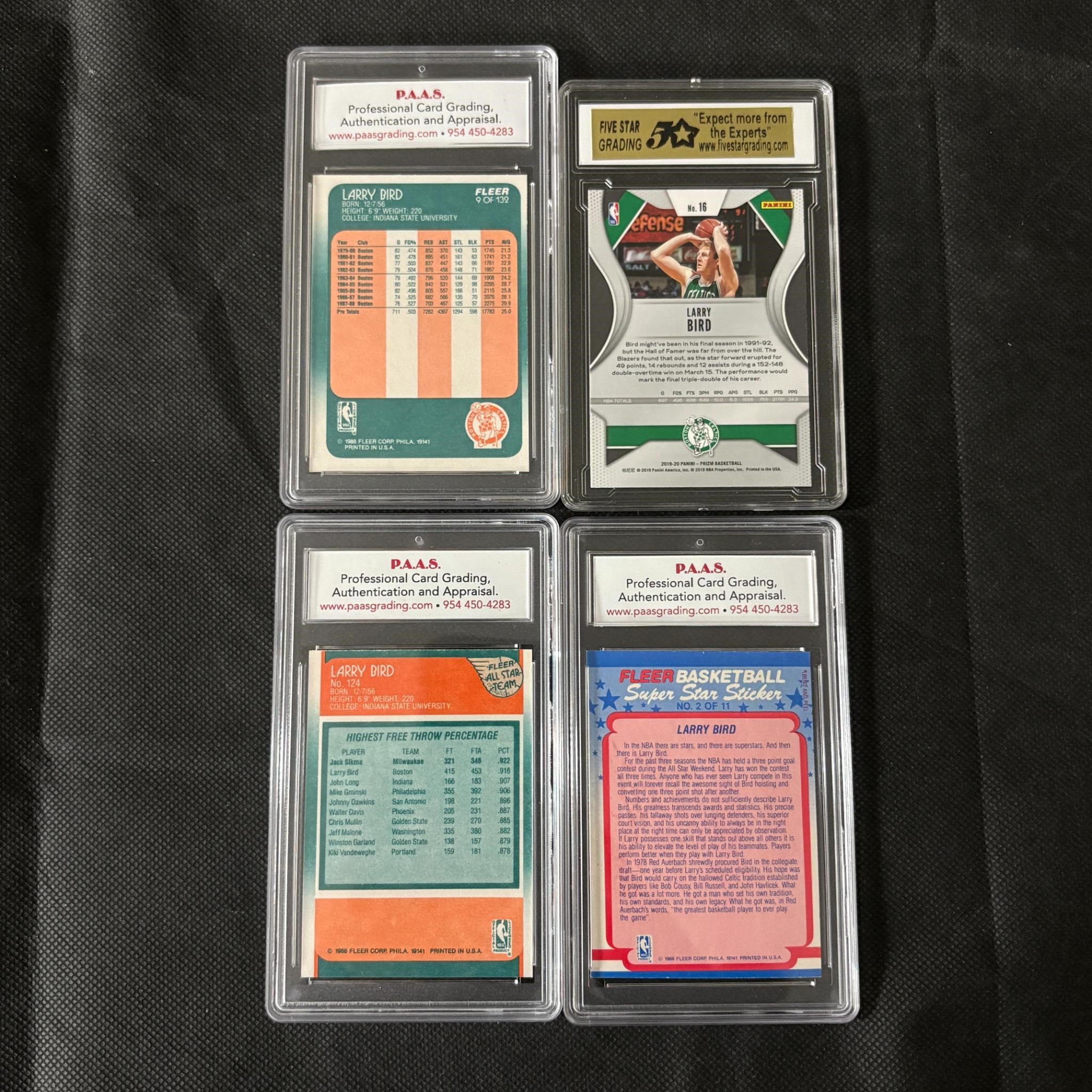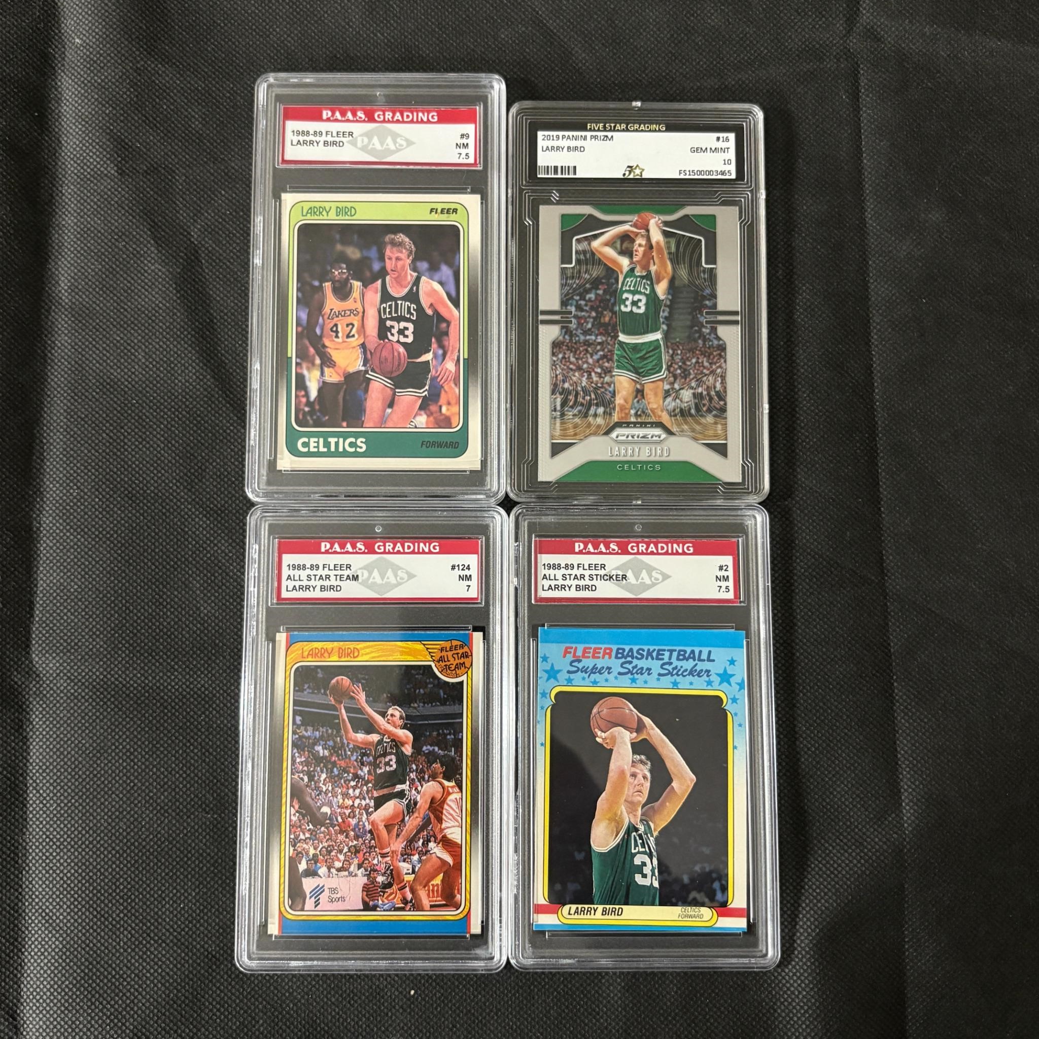 PAAS 7.5 Larry Bird #9 1988-89 Fleer, FSG 10 Larry Bird 2019 Panini Prizm, PAAS 7 Larry Bird 1988-89 Fleer Allstar Team, PAAS 7.5 Larry Bird #2 1988-89 Fleer All Star Sticker.