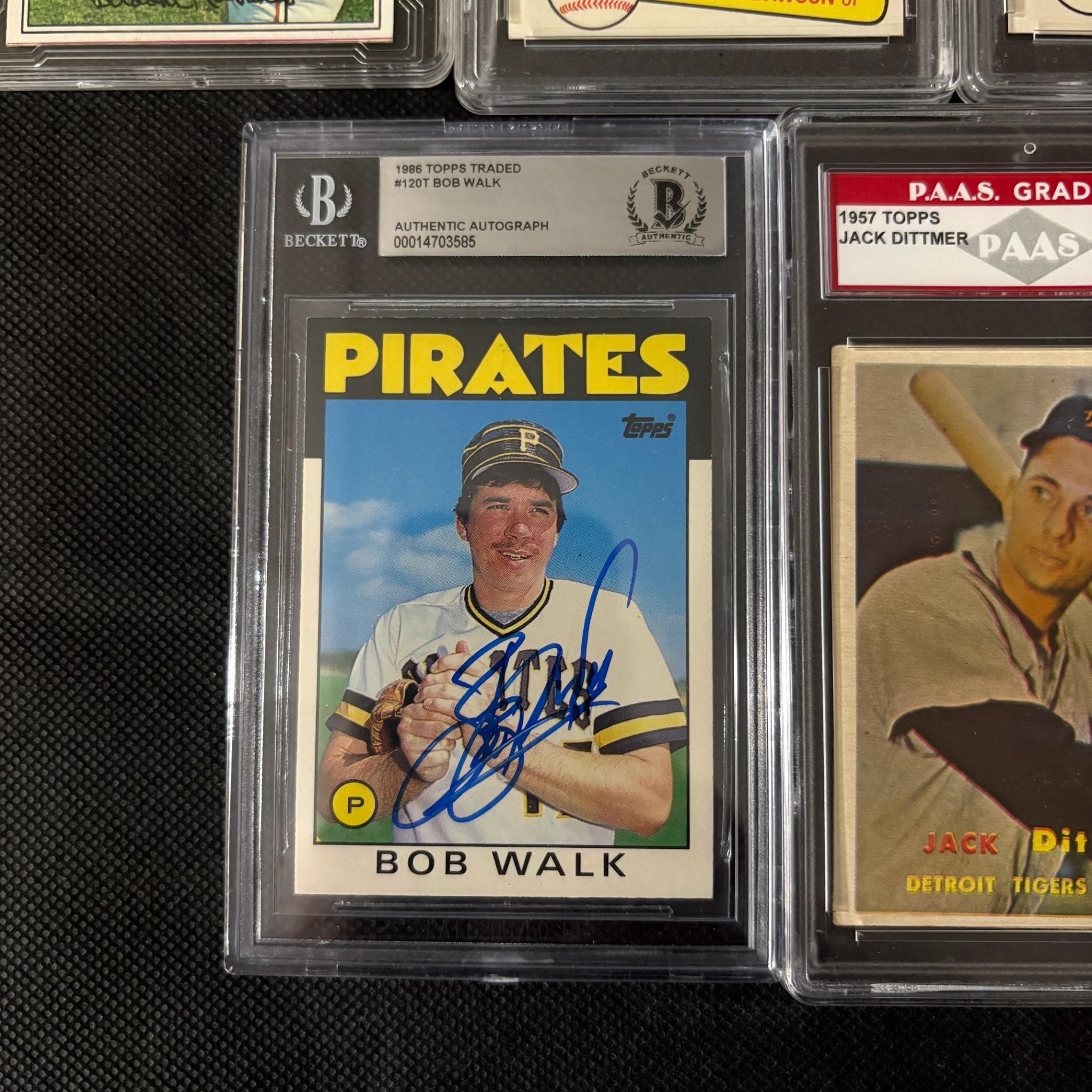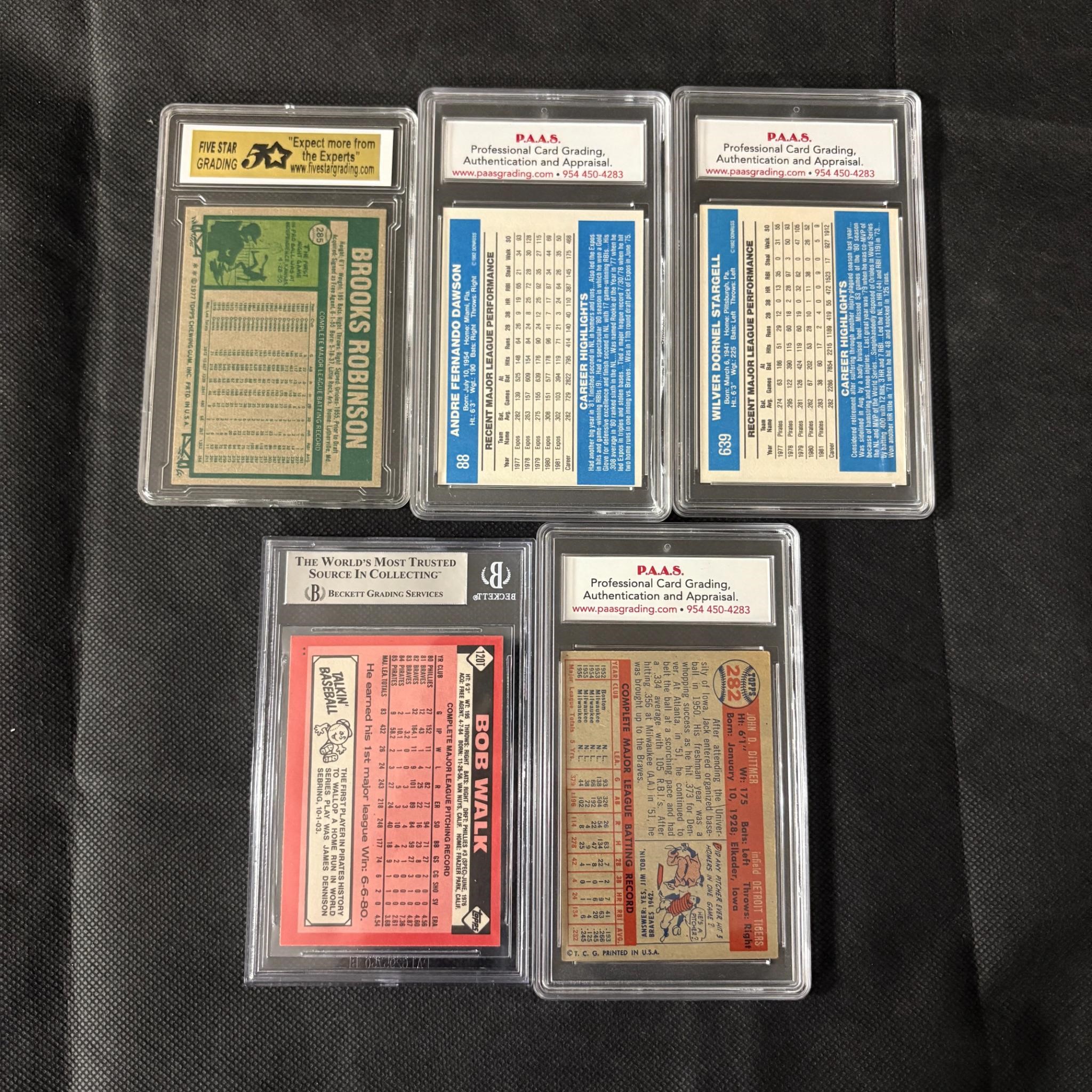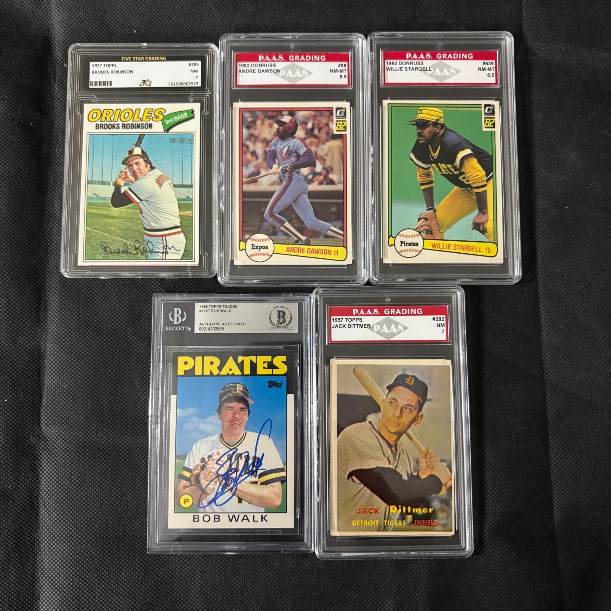 Beckett Authentic Auto Bob Walk, PAAS 7 Jack Dittmer #282 1957 Topps, FSG 7 Brooks Robinson #285 1977 Topps, PAAS 8.5 Andre Dawson #88 1982 Donruss, PAAS 8.5 Willie Stargell #639 1982 Donruss.