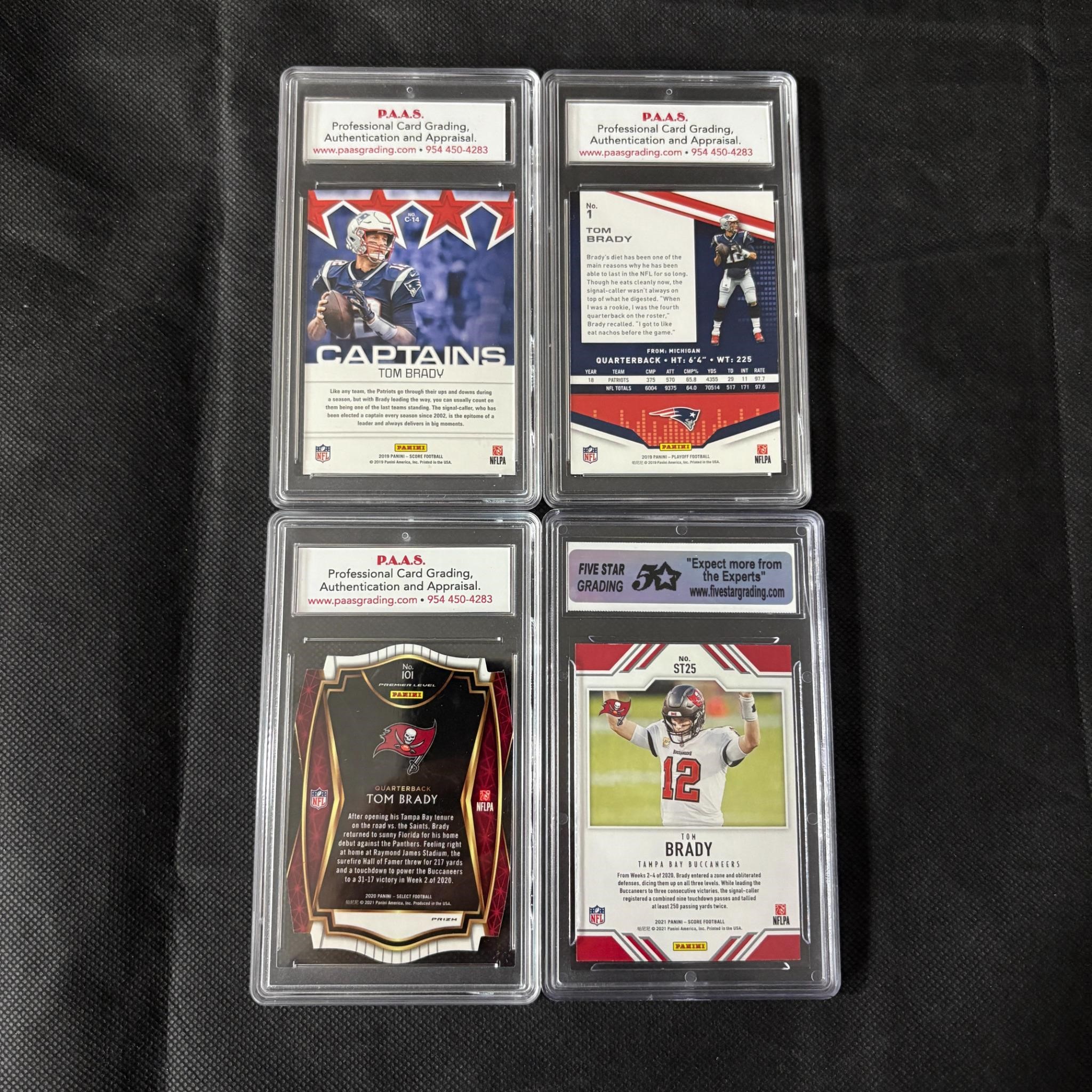 PAAS 9 Tom Brady #C-14 2019 Panini Score Captains, PAAS 9.5 Tom Brady #1 2019 Panini Playoff Green Kickoff, PAAS 9 Tom Brady #101 2020 Panini Select Bronze Die Cut Prizm, FSG Tom Brady #ST25 2021 Score Score Team.
