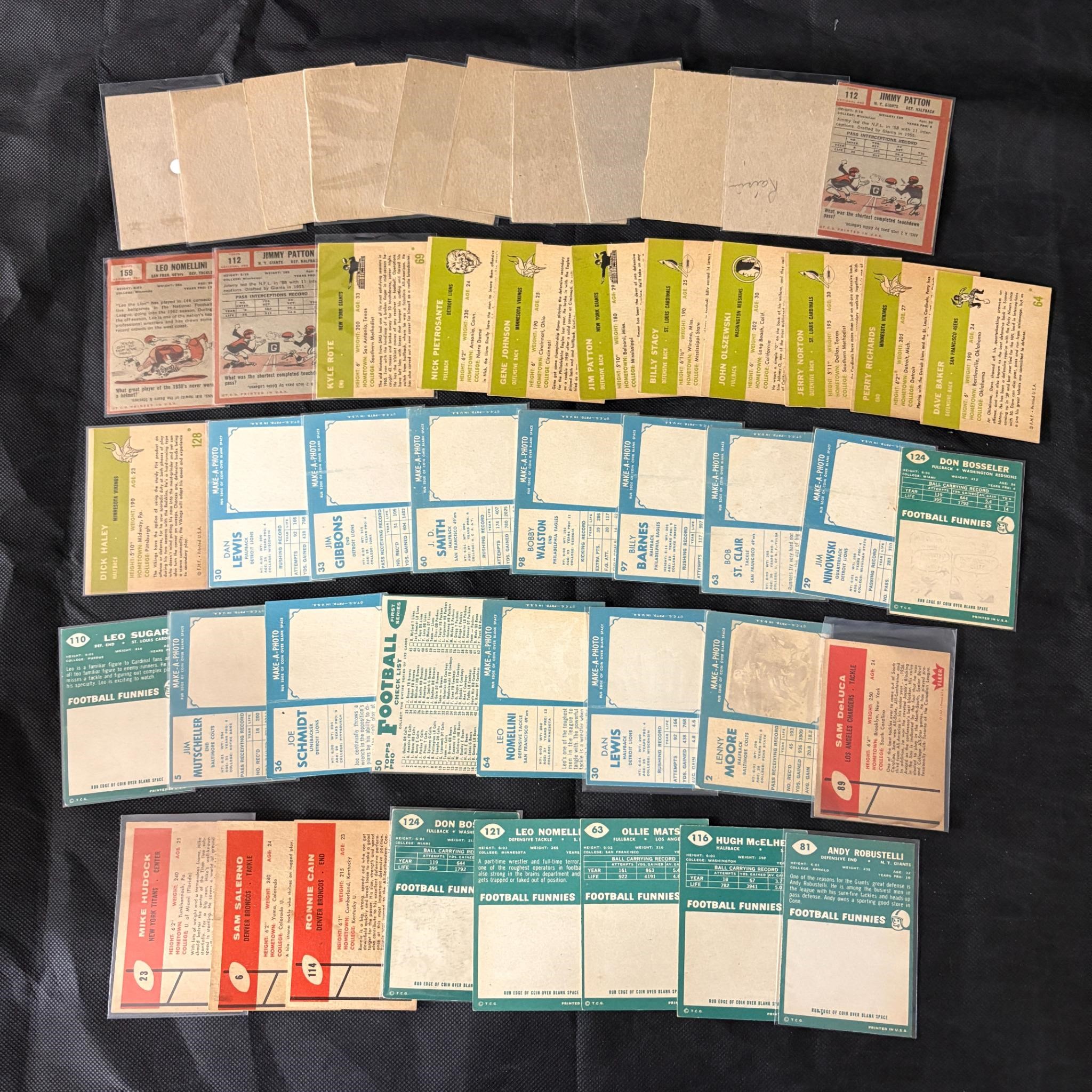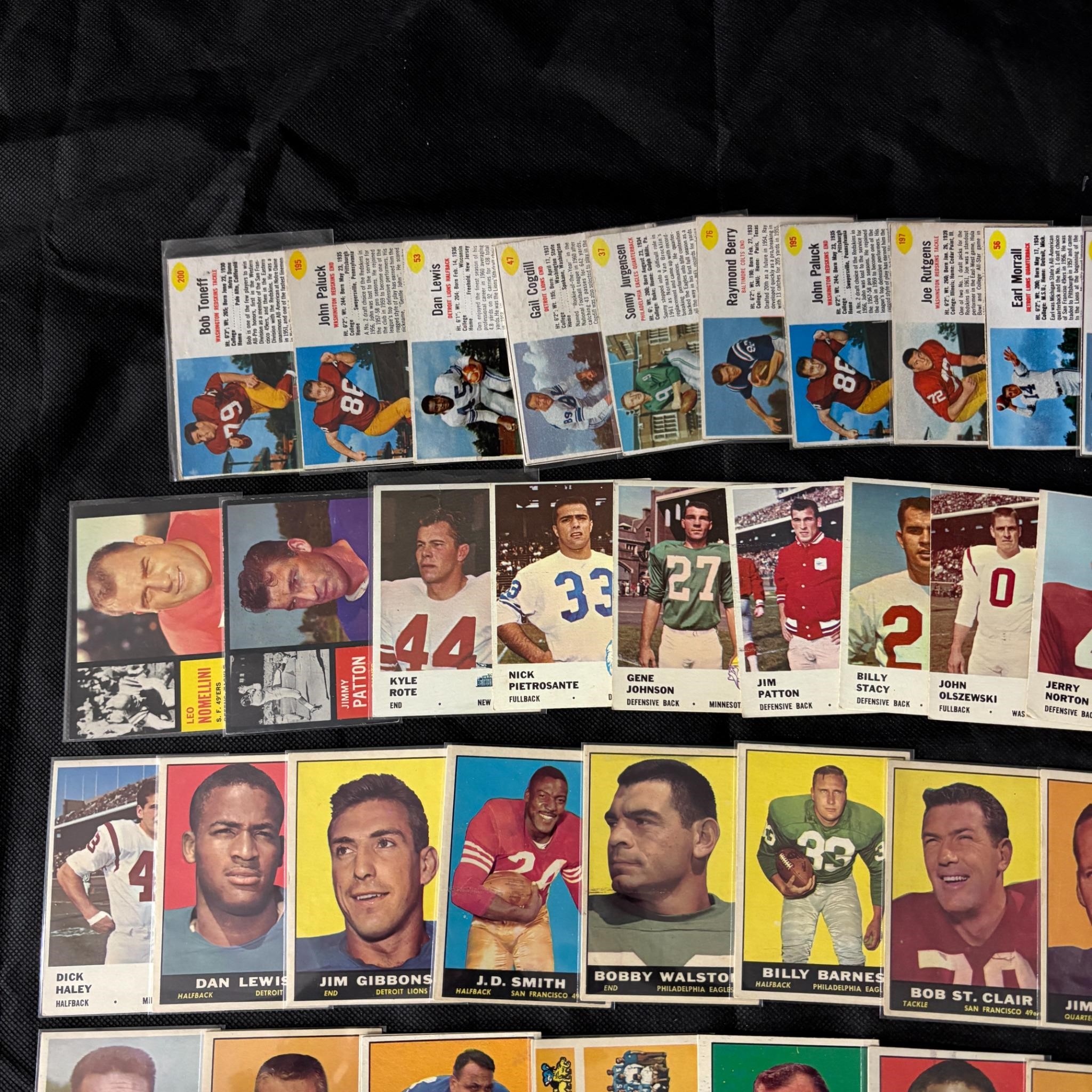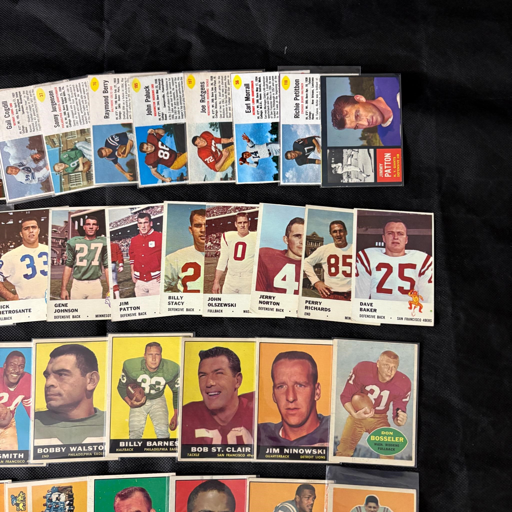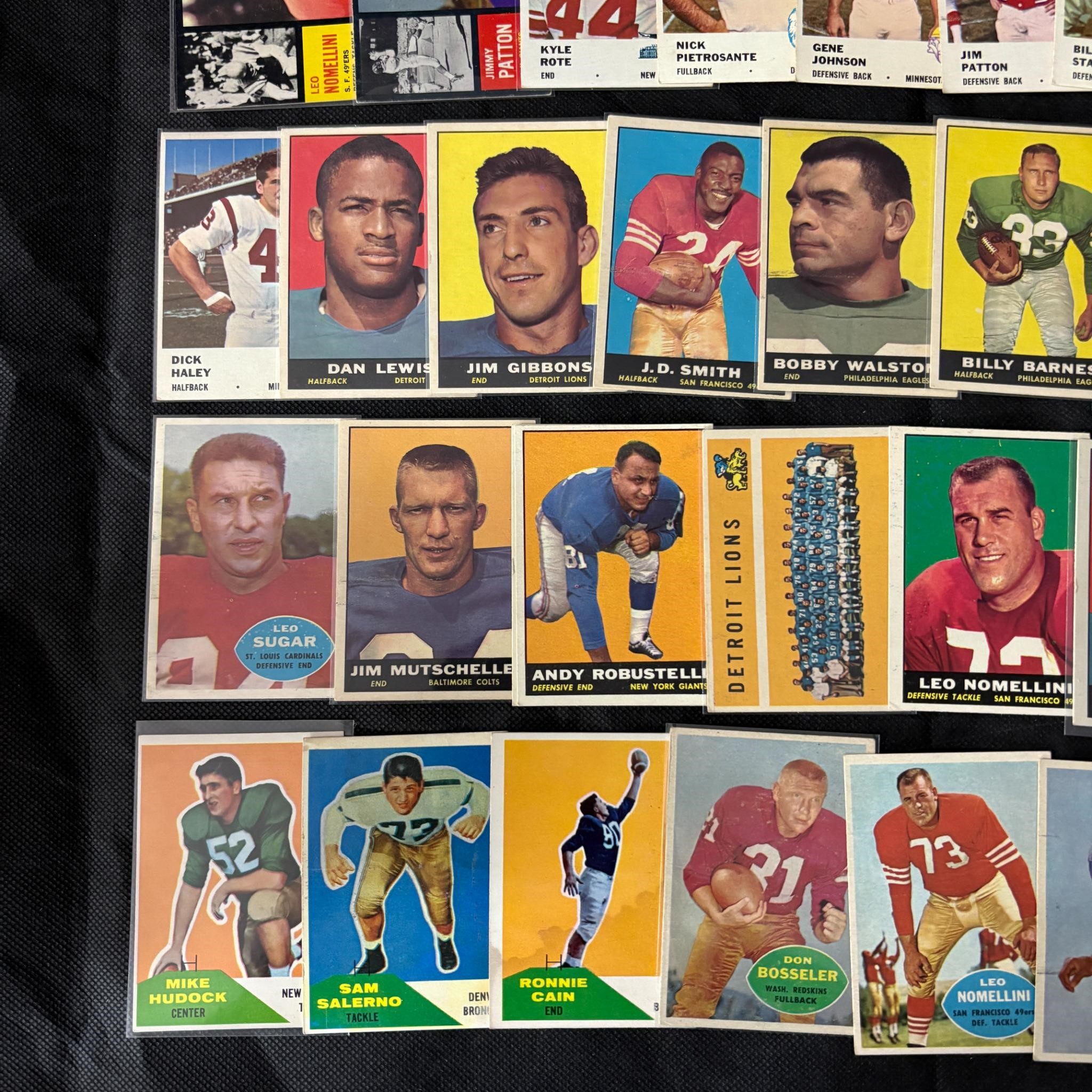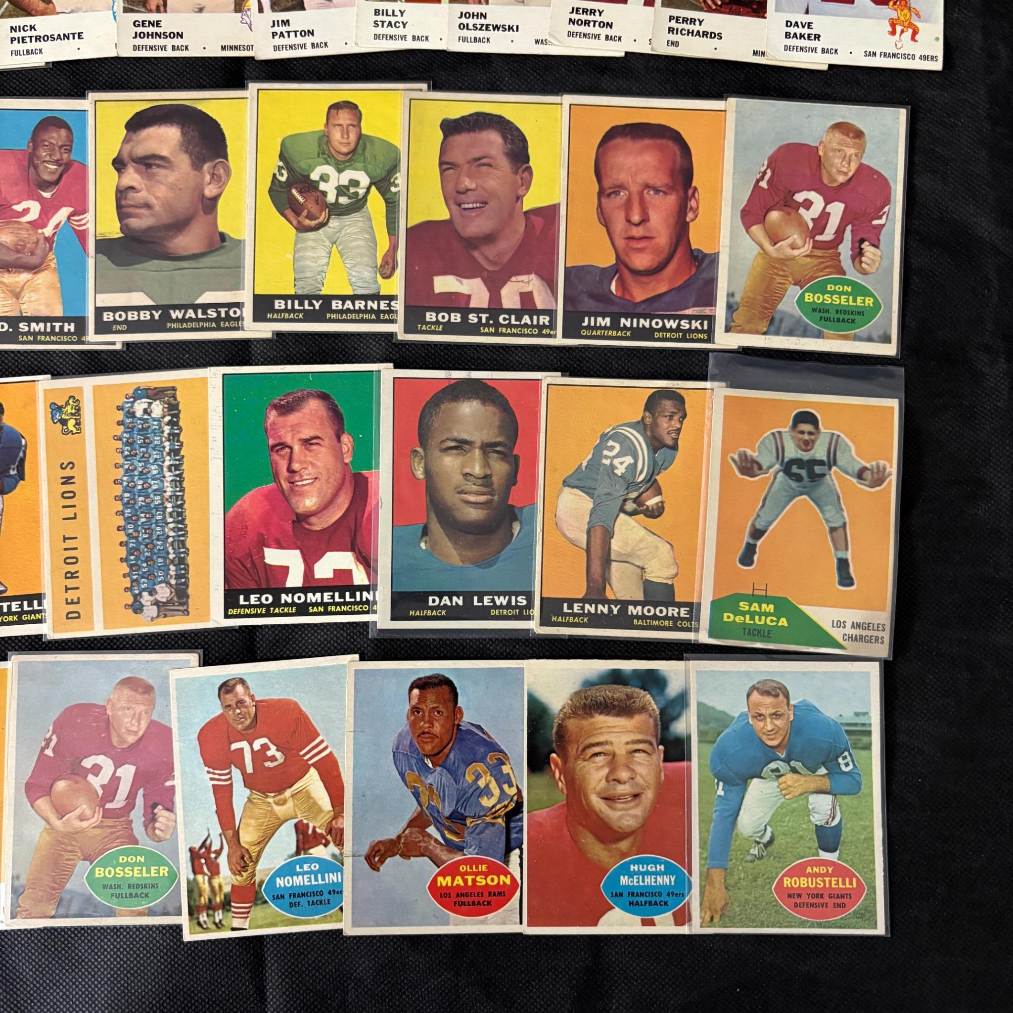 Mixed lot of 1960s NFL cards: 1960 Topps, 1961 Topps (including Lenny Moore), 1961 Fleer, 1962 Topps & Post. Good era for vintage set pieces.