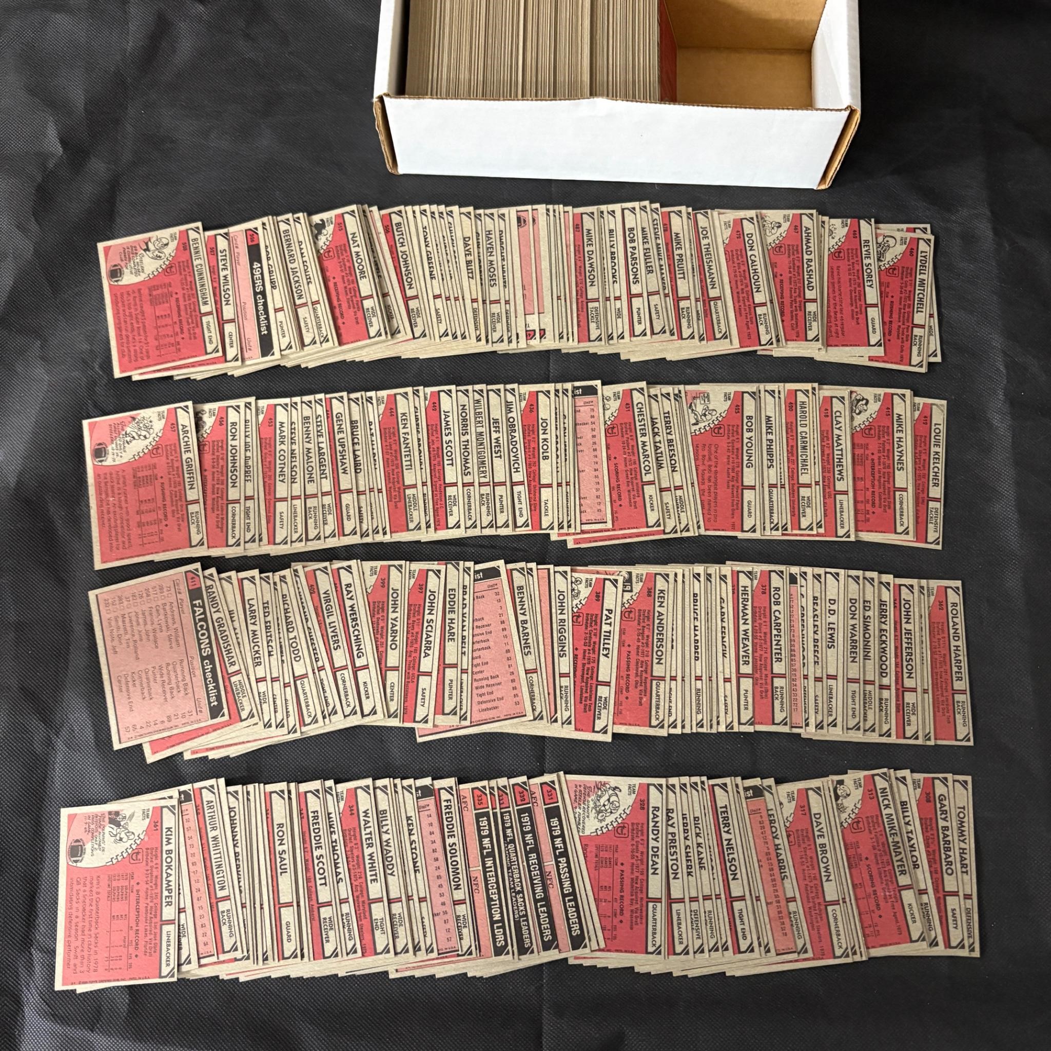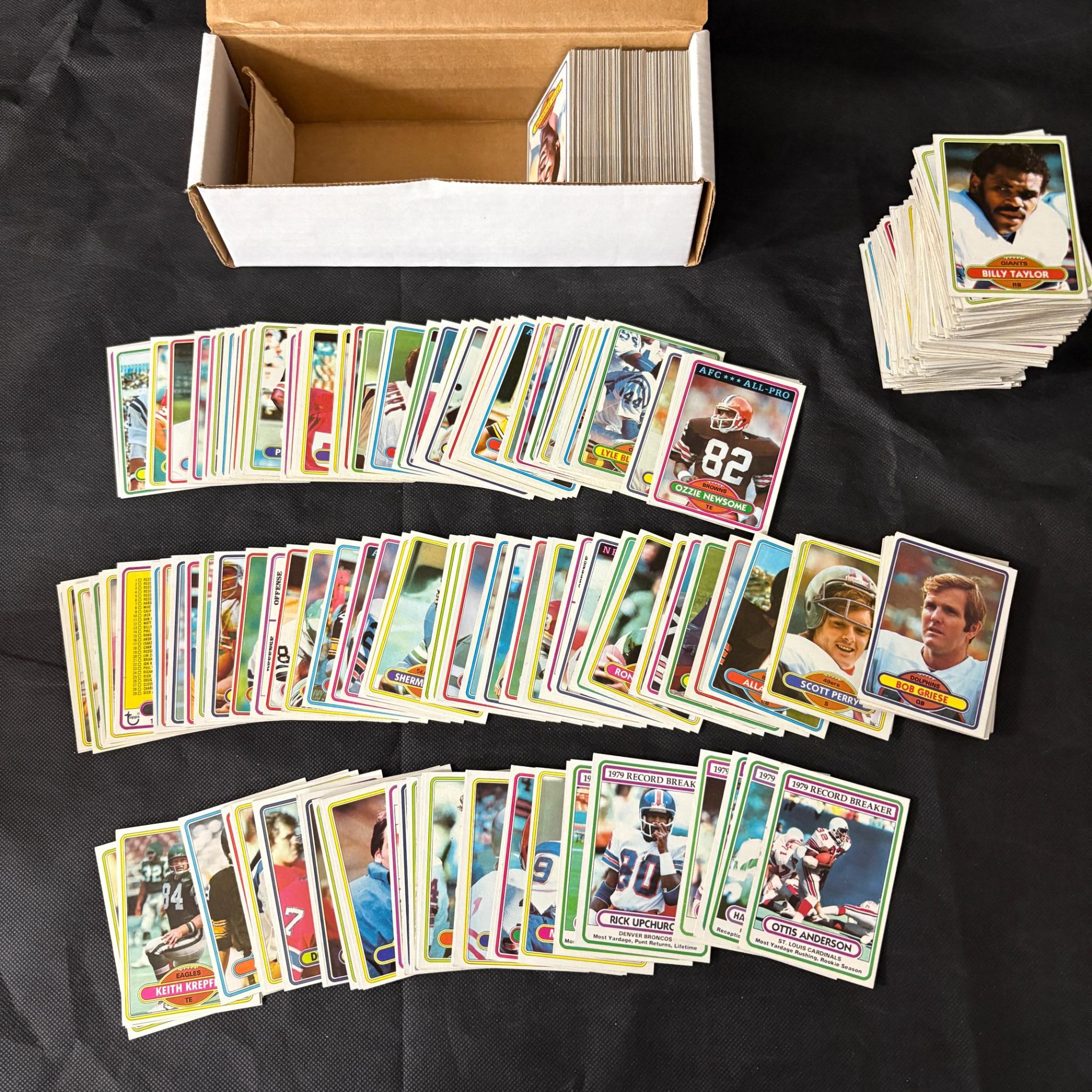 Complete 1980 Topps football set (cards #1-528), including the Phil Simms rookie card. Condition likely mixed; some mid-grade fronts/backs.