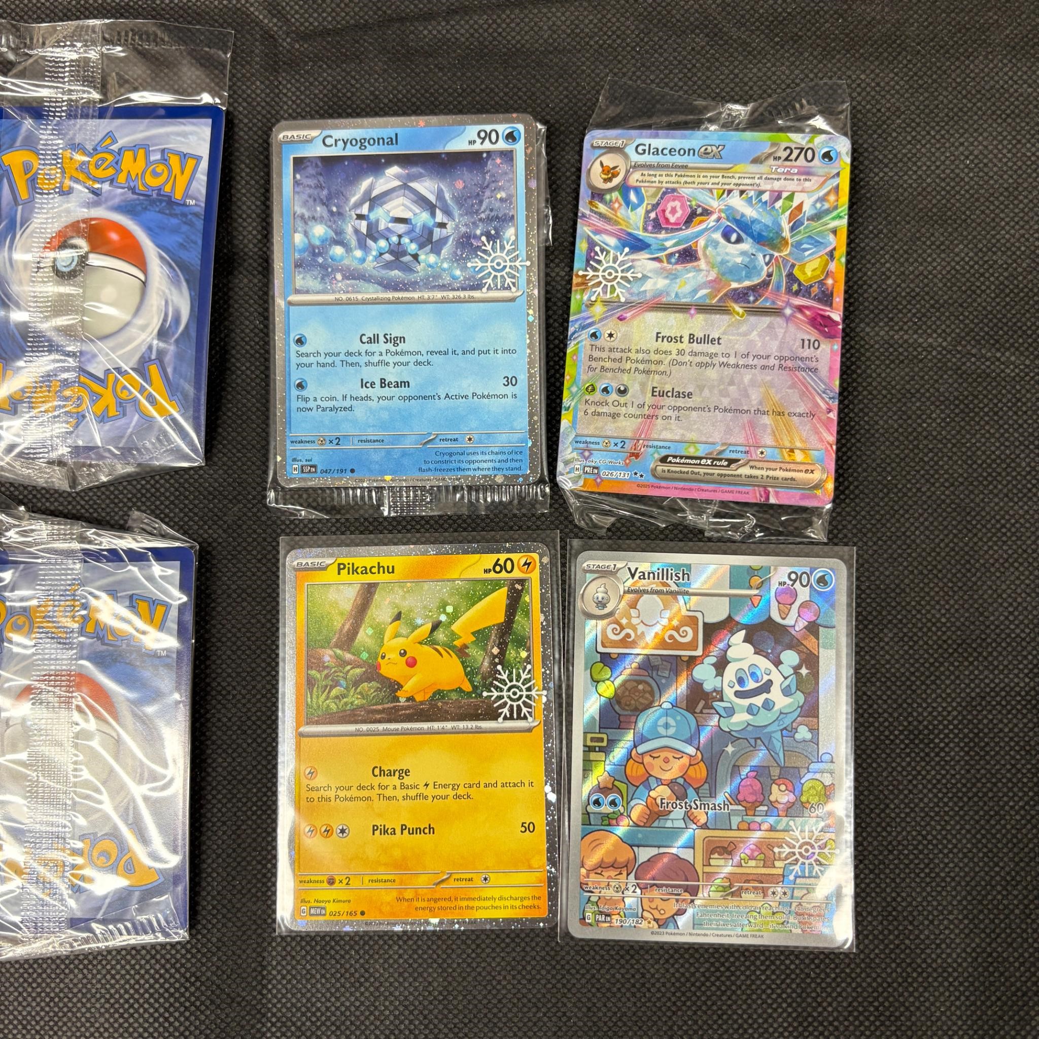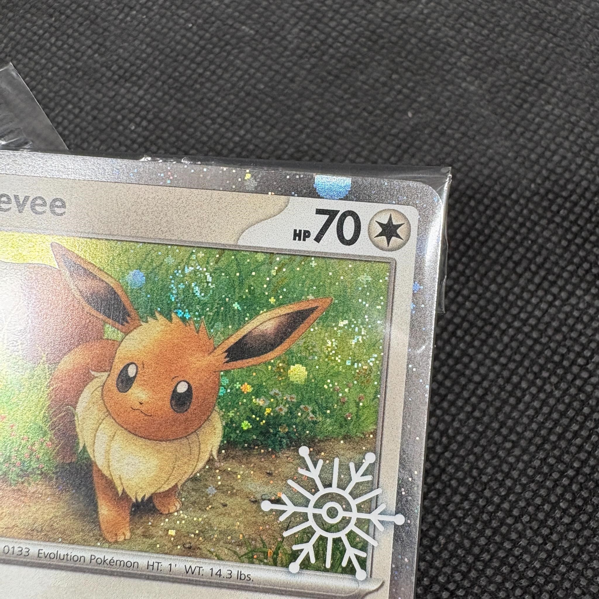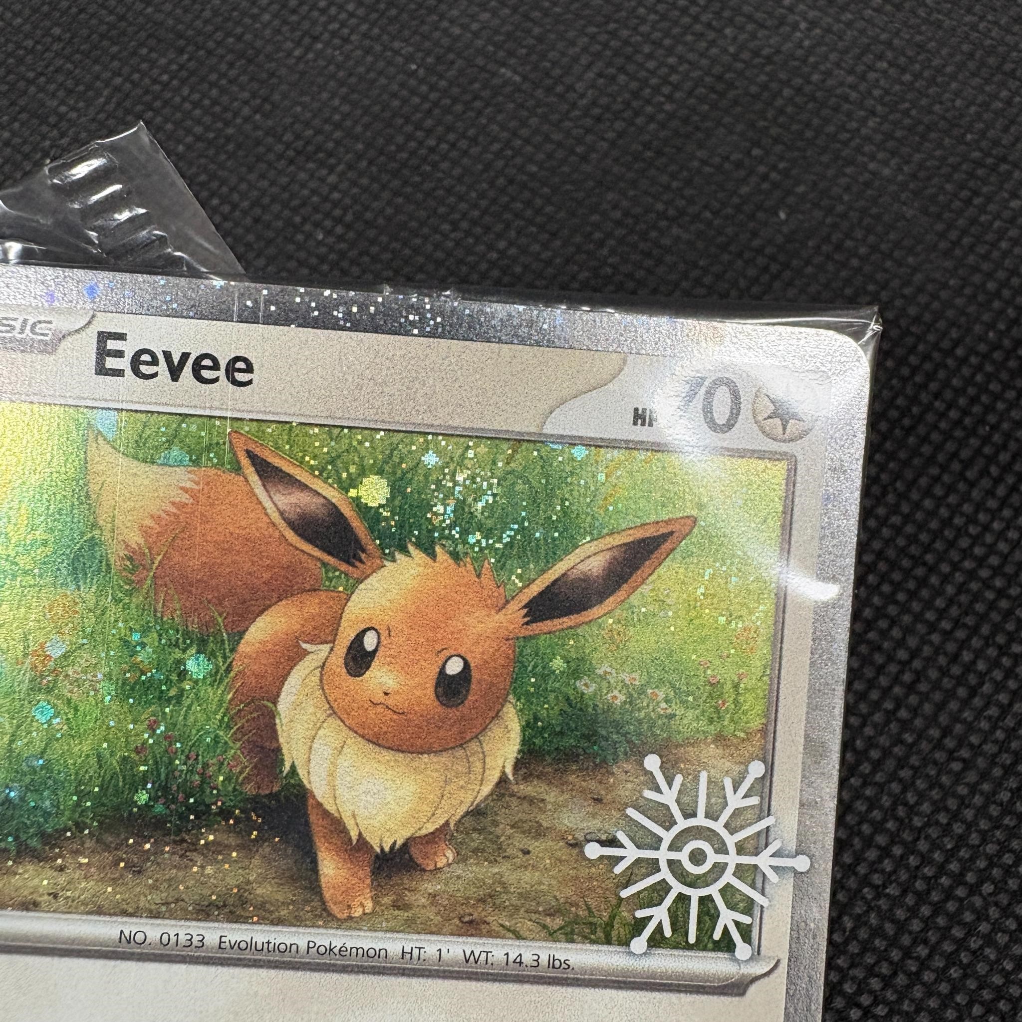 Lot of Sealed Snowflake Stamped Promo Pokemon Cards. Includes opened Pikachu and Vanillish Snowflake Stamped Cards. Sealed Eevee Promo has a RARE DOUBLE SWIRL.