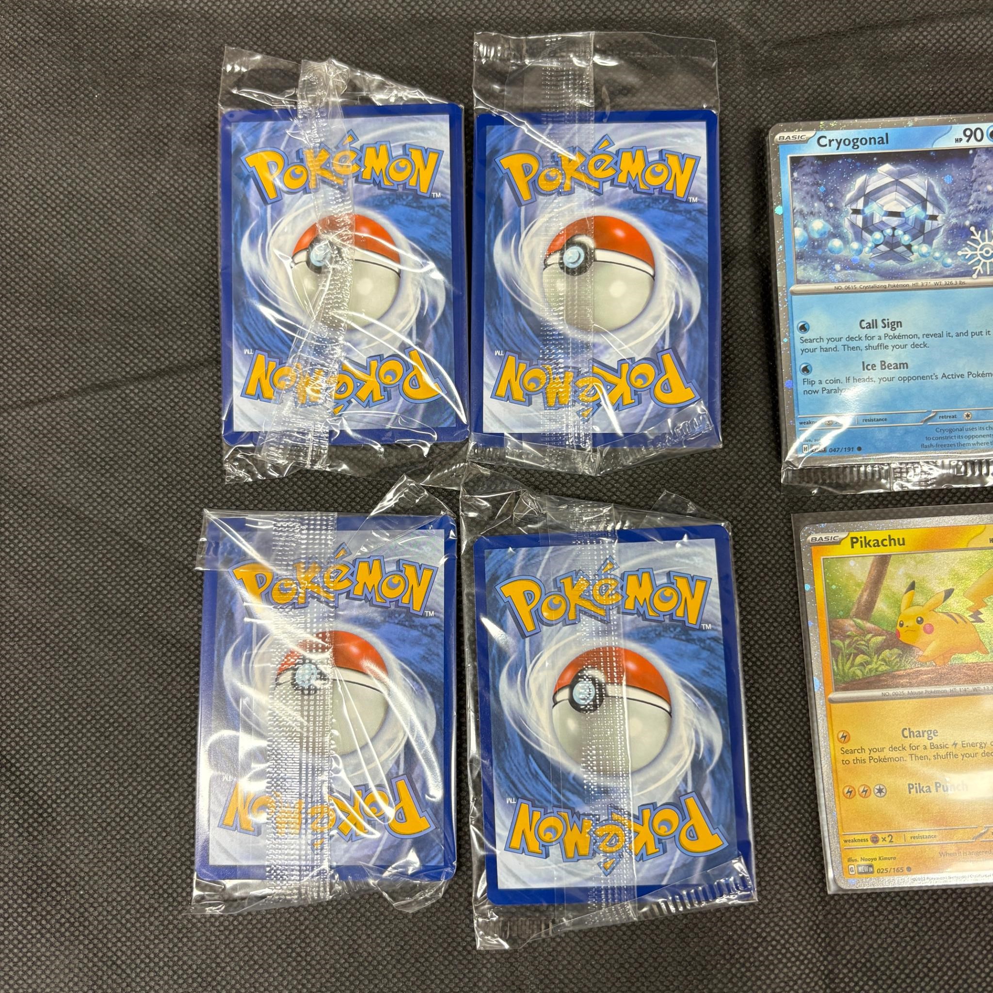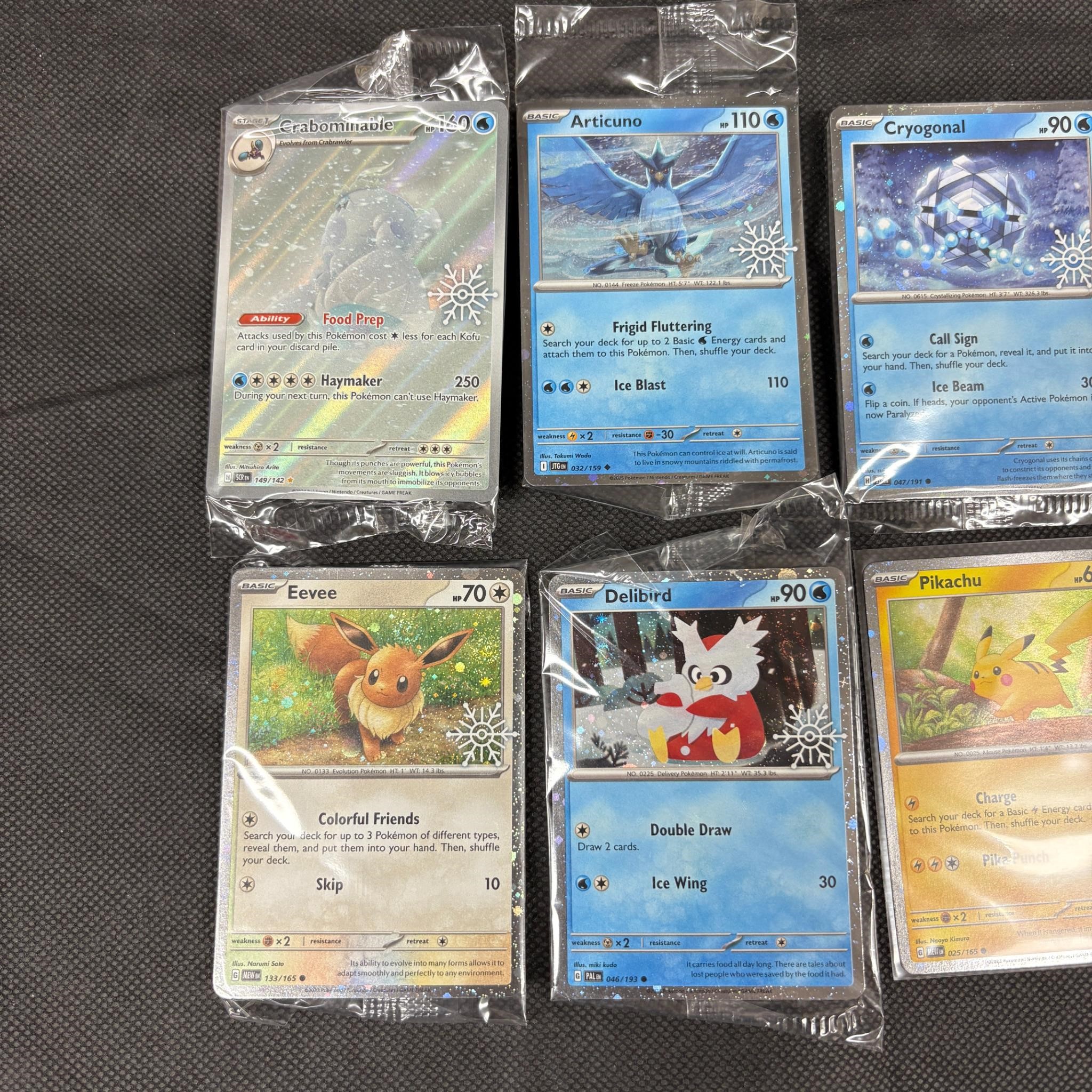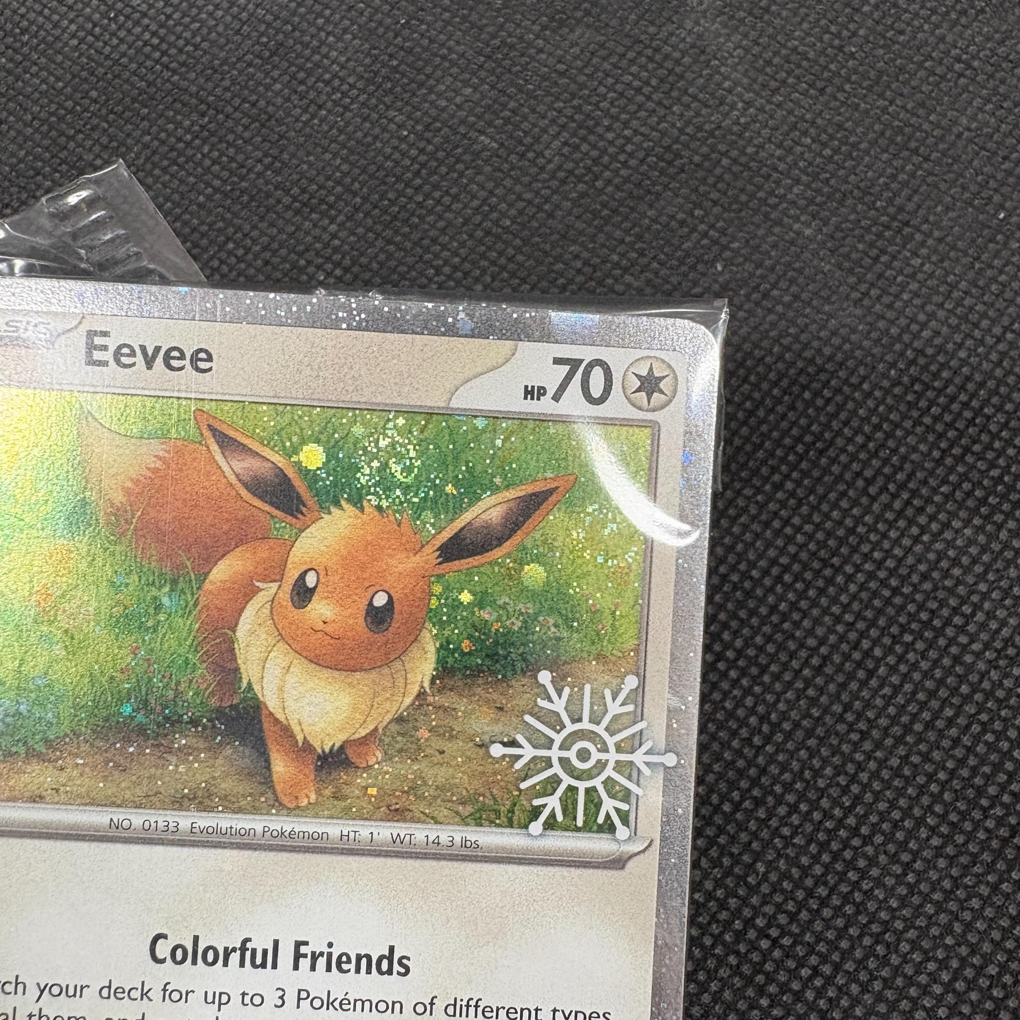 Lot of Sealed Snowflake Stamped Promo Pokemon Cards. Includes opened Pikachu and Vanillish Snowflake Stamped Cards. Sealed Eevee Promo has a RARE DOUBLE SWIRL.