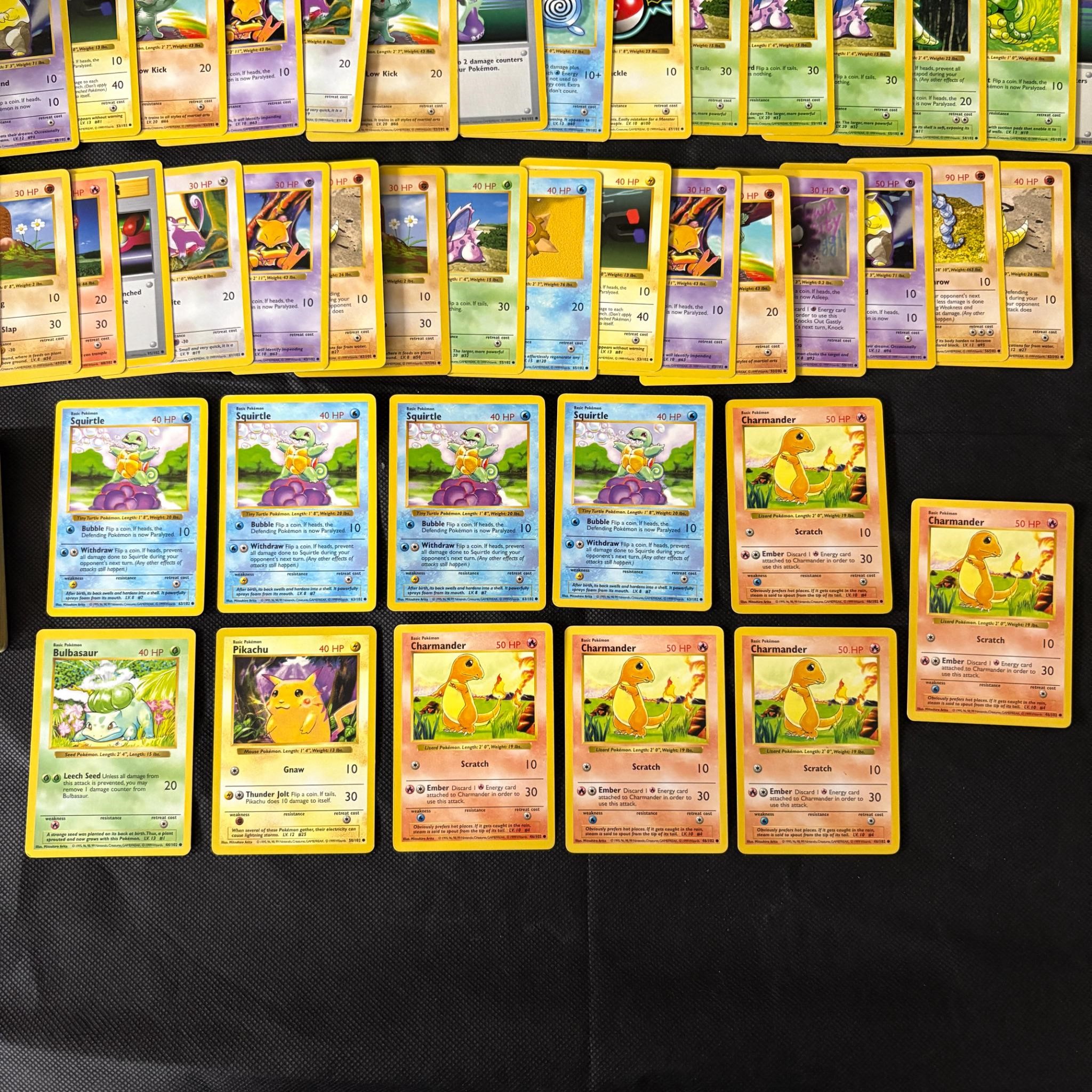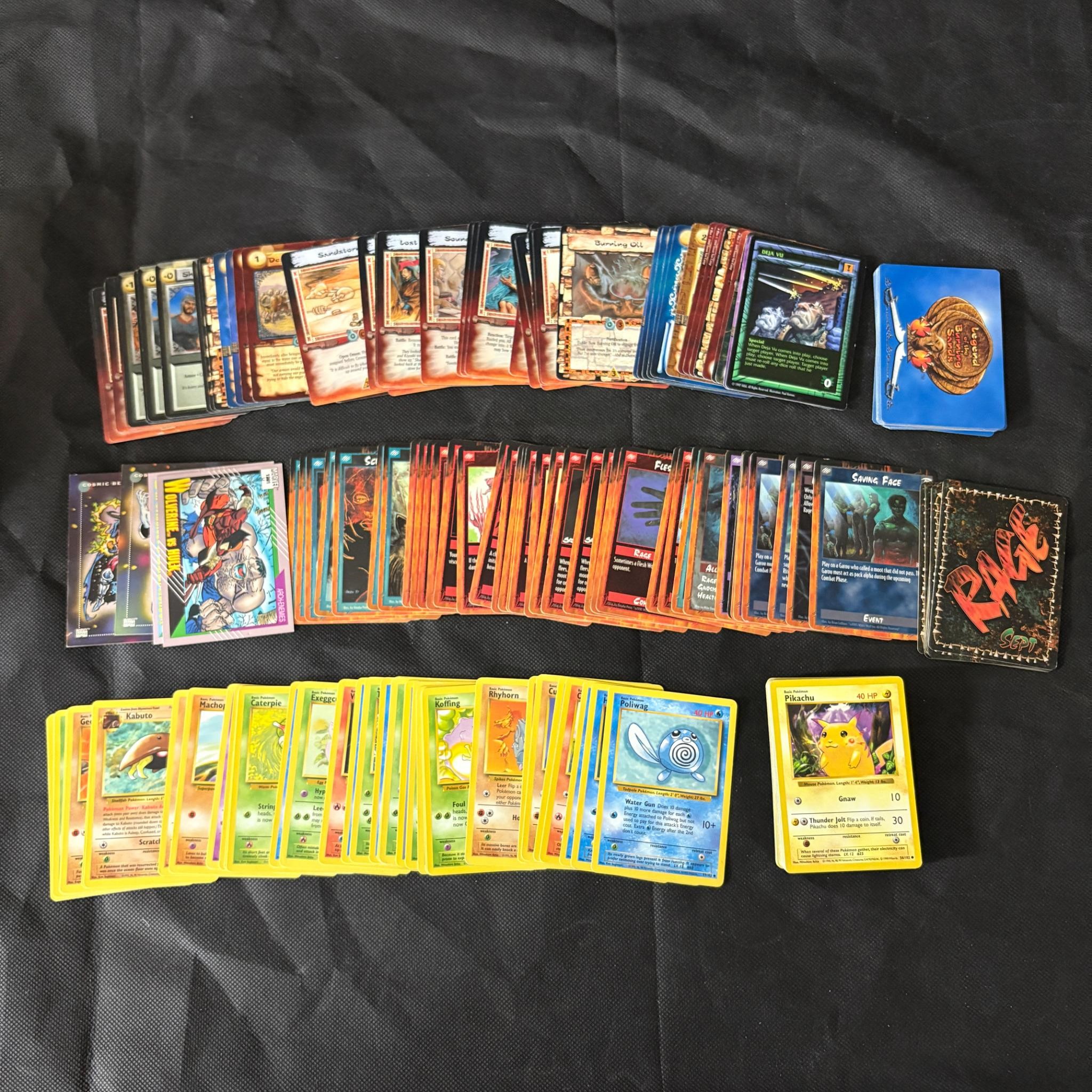 Vintage pokemon and trading card lot. Shadowless Base Set Pokemon Cards. Includes Shadowless Red cheek Pikachu. Rage and Legends of the Burning Sands Cards.