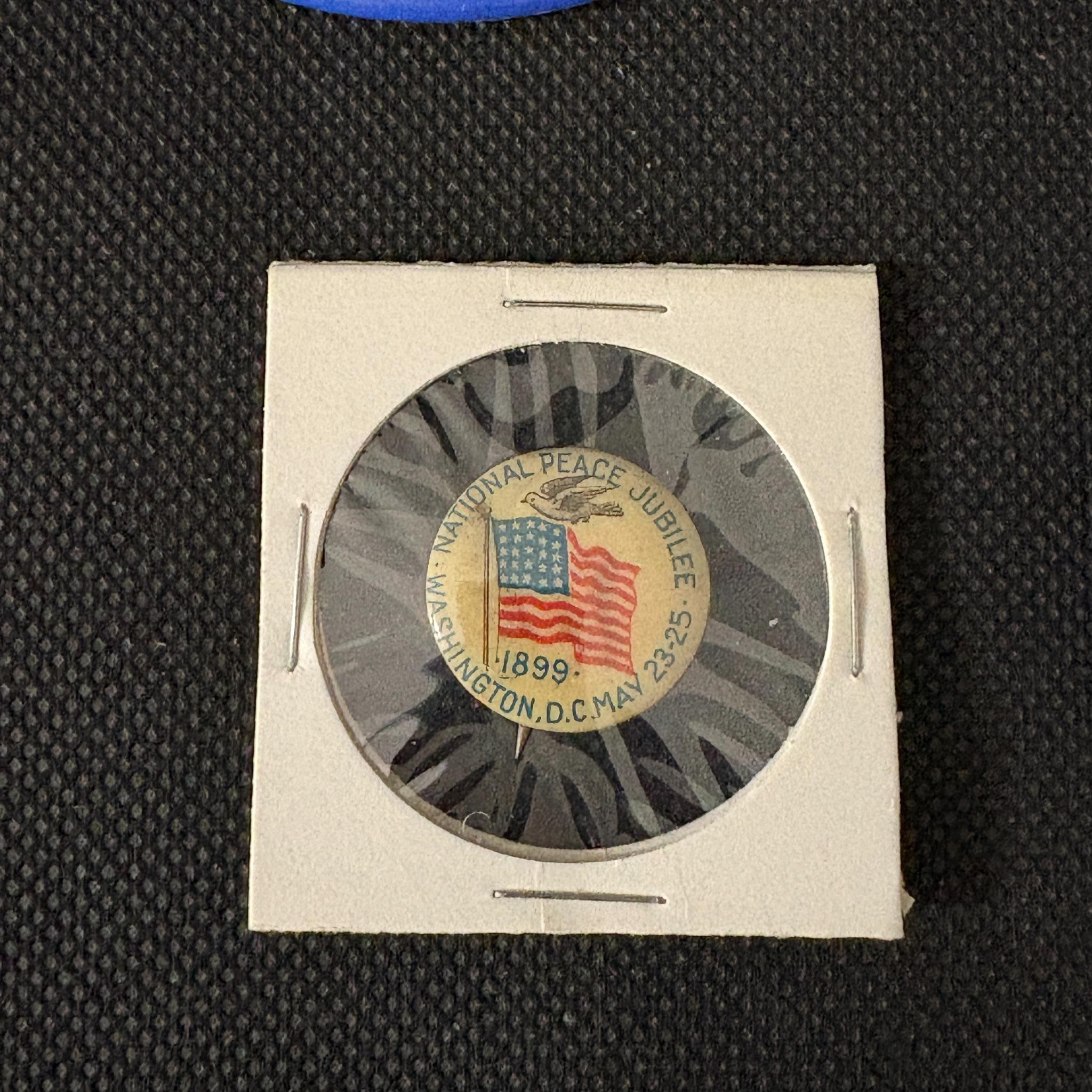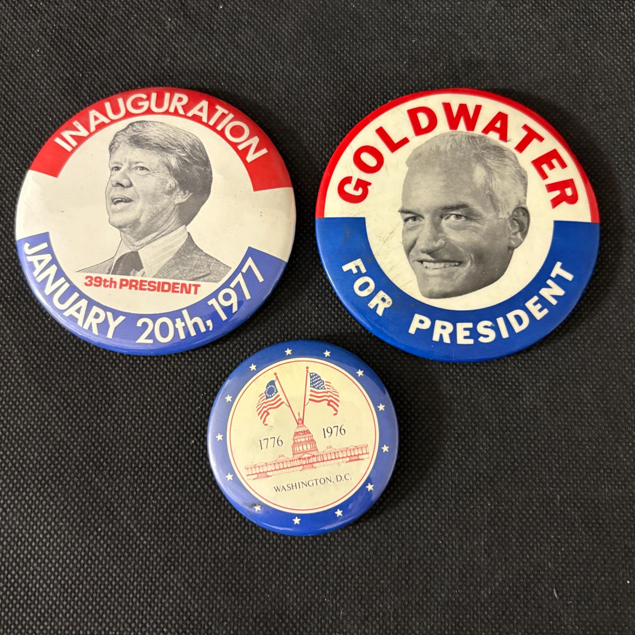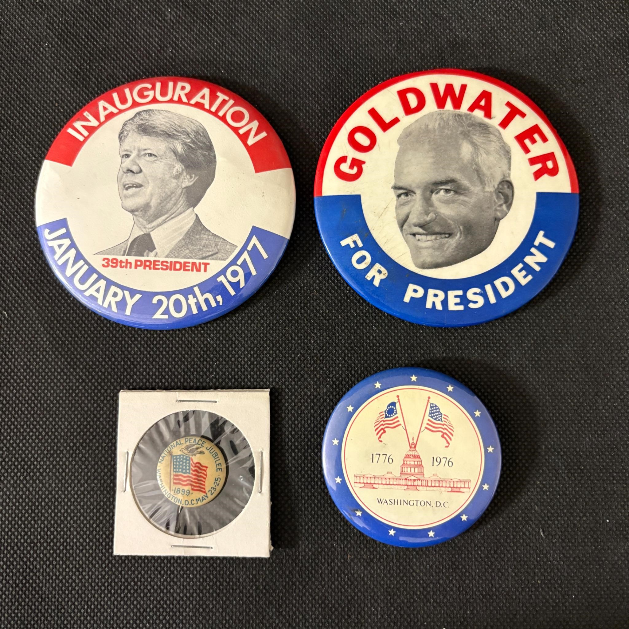 Vintage Political Pins, Includes 1899 National Peace Jubilee 1899 Whitehead & Hoag Pin, Carter Inauguration Pin, Goldwater for president campaign prin, and 1970s Washington DC Pin.