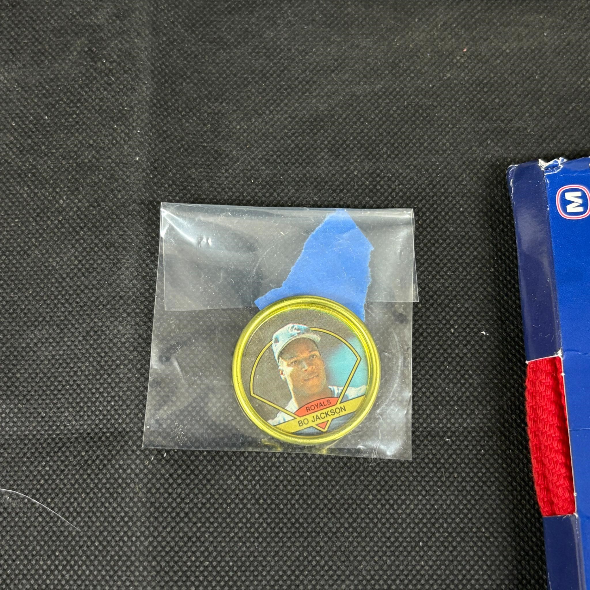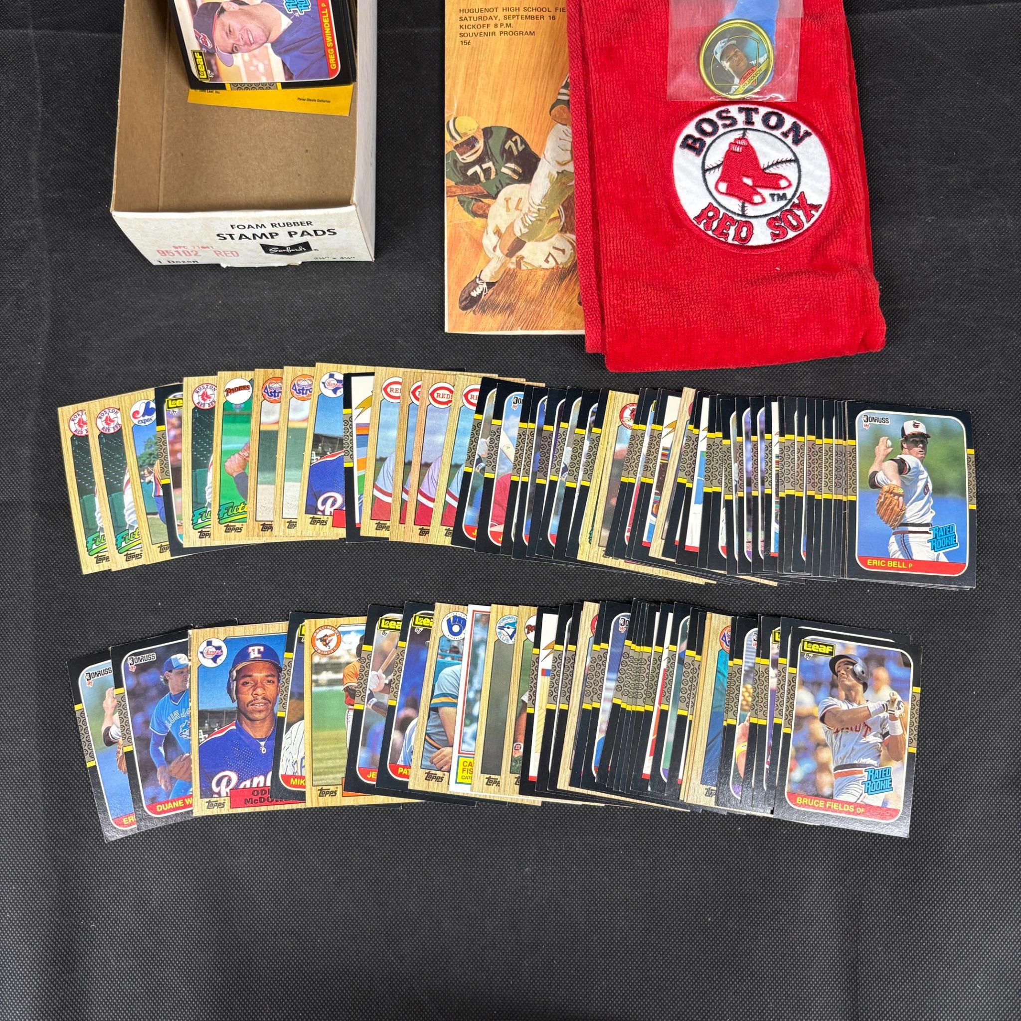 Includes 87 leaf Baseball Cards, Topps, Donruss, Boston Redsox Towel, Bo Jackson Coin, +