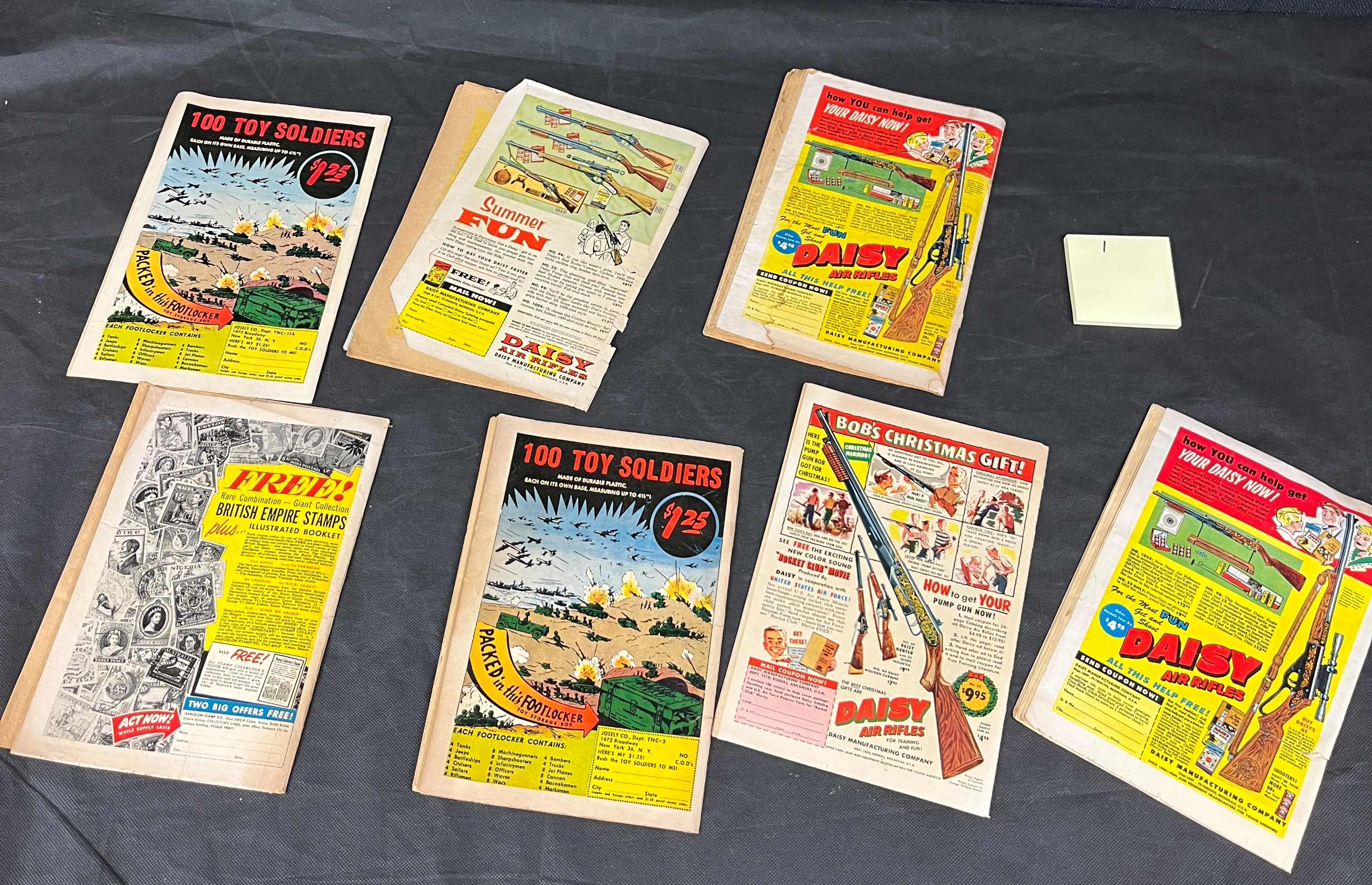 A collection of vintage American comic books and accompanying advertising flyers, all printed on paper from the mid-20th century. The comic books include titles such as Superboy #108, Peter Panda, Jackie Gleason’s Honeymooners, Greatest Adventure #27, Adventure Comics #264, Sgt. Bilko #10, and Screen Comics (featuring Bugs Bunny and Woody Woodpecker), uniformly marked with a 10-cent price. The advertising flyers promote items such as “100 Toy Soldiers” ($1.25), “Daisy Air Rifles” ($9.95), and “British Empire Stamps, ” with visible text including “Summer Fun” and “Bob’s Christmas Gift.” All items are in English.