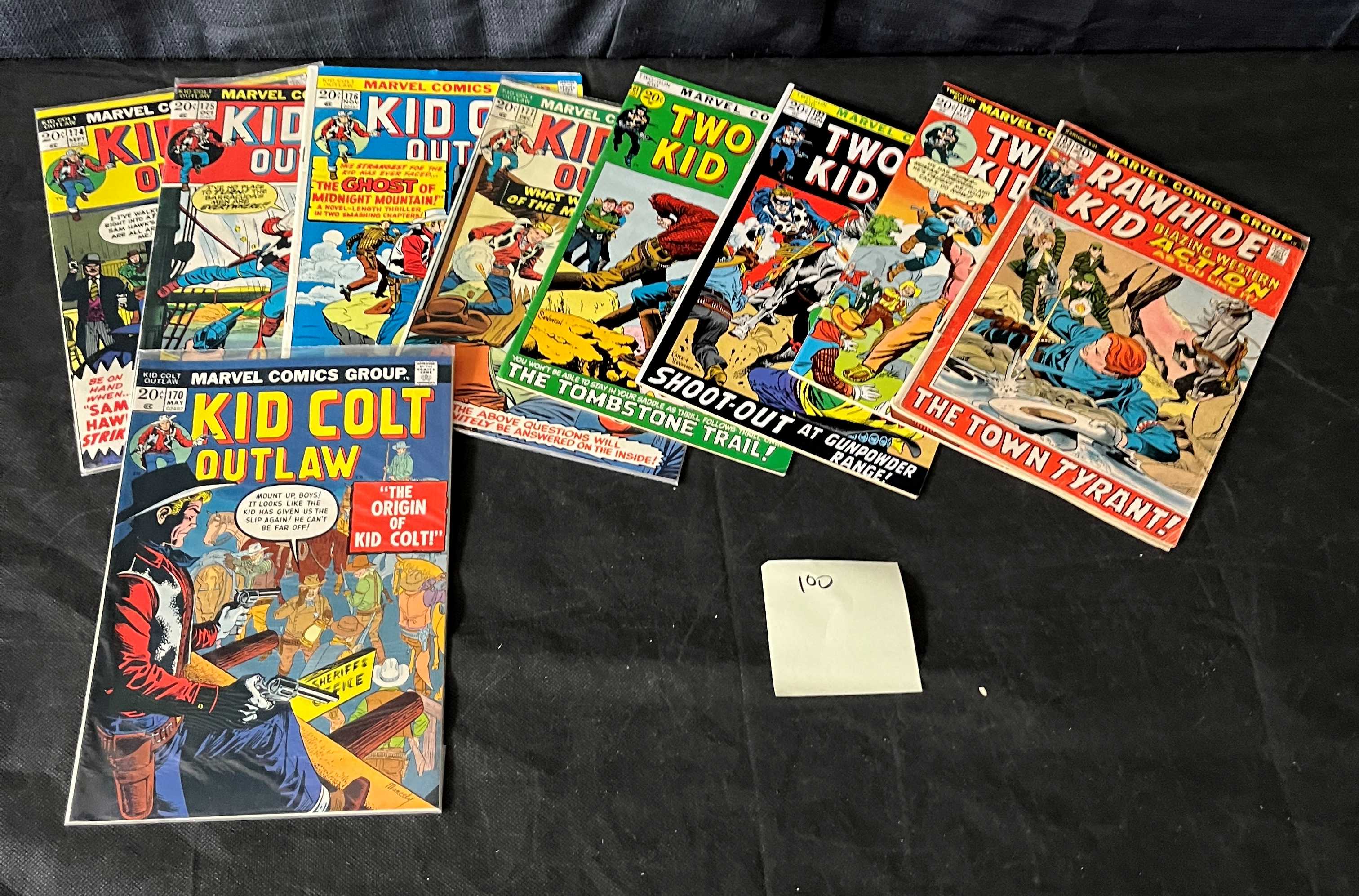 A collection of 9 Marvel Comics Group Western comic books, primarily dating to the early 1970s. Titles include *Kid Colt Outlaw* (e.g., issues #170, #174, #175, #176, #177), *Two-Gun Kid* (e.g., issues #102, #103, #104), and *Rawhide Kid* (e.g., issue #91). Each comic features action-oriented, illustrative covers depicting cowboys, horses, and firearms, consistent with the Western genre. The comics are constructed from paper and uniformly display a ’20c’ price point. Visible publication months include May, Sept, Oct, Dec, Jan, Mar, Apr. Some comics are housed in protective plastic sleeves.