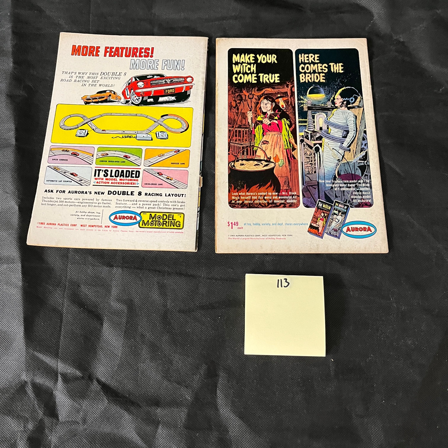 This lot features two Silver Age DC Comics from “The Brave and the Bold” series. The first comic is identified as issue #61, featuring “Batman versus Eclipso,” with cover text highlighting Eclipso’s lack of memory regarding Batman. The second comic is identified as issue #62 (1965), showcasing “Starman and Black Canary” facing “The Sportsmaster and Huntress,” promoted as a “SENSATIONAL COMIC-BOOK FIRST!” and a “SUPER-HERO COME-BACK WILD!!!”, and is notable for the 1st Silver Age appearance of Black Canary. Both comics bear a 12¢ cover price and display the “APPROVED BY THE COMICS CODE AUTHORITY” seal. The reverse side of issue #61 features a full-page advertisement for “Aurora Model Motoring” with a Ford Mustang race set. The reverse side of issue #62 features advertisements for “Make Your Witch Come True” and “Here Comes The Bride” models, priced at $1.49.