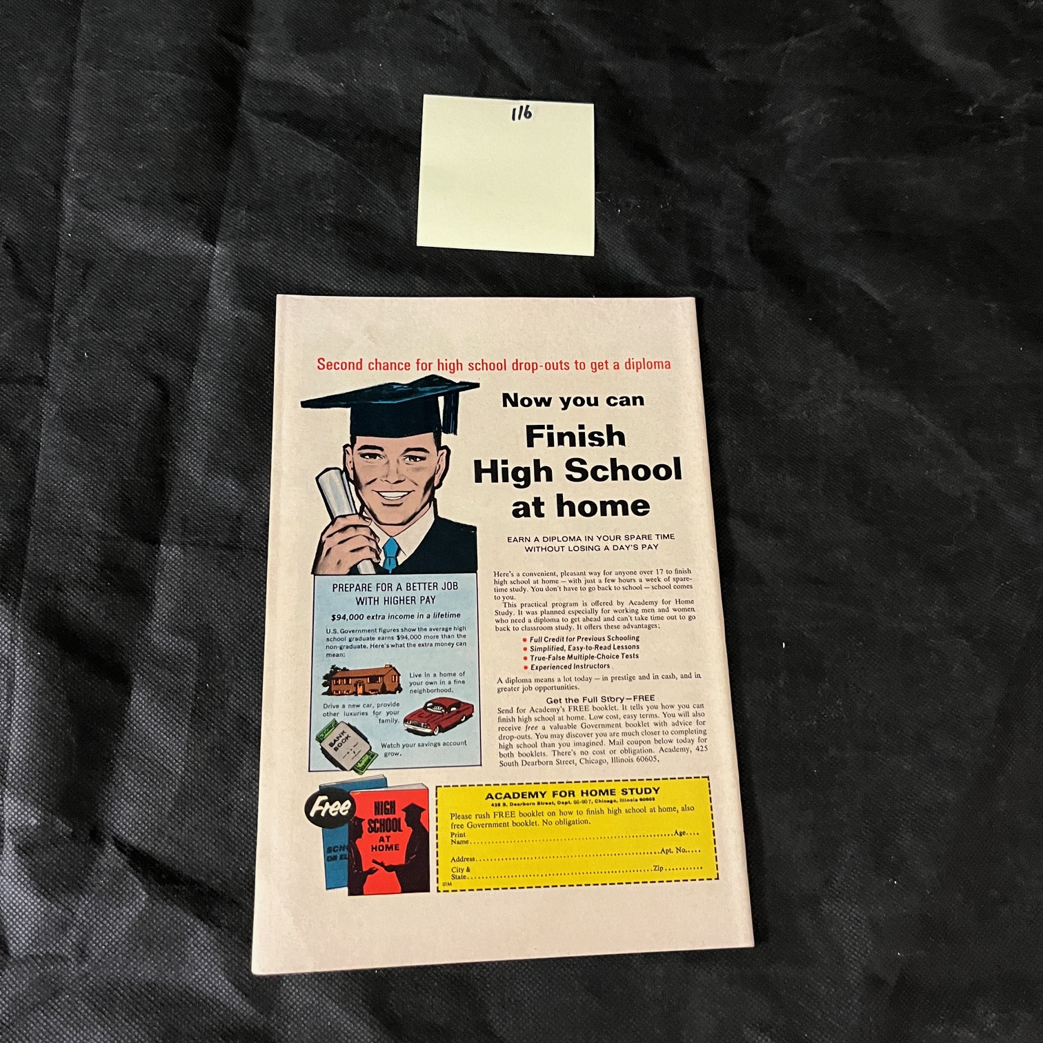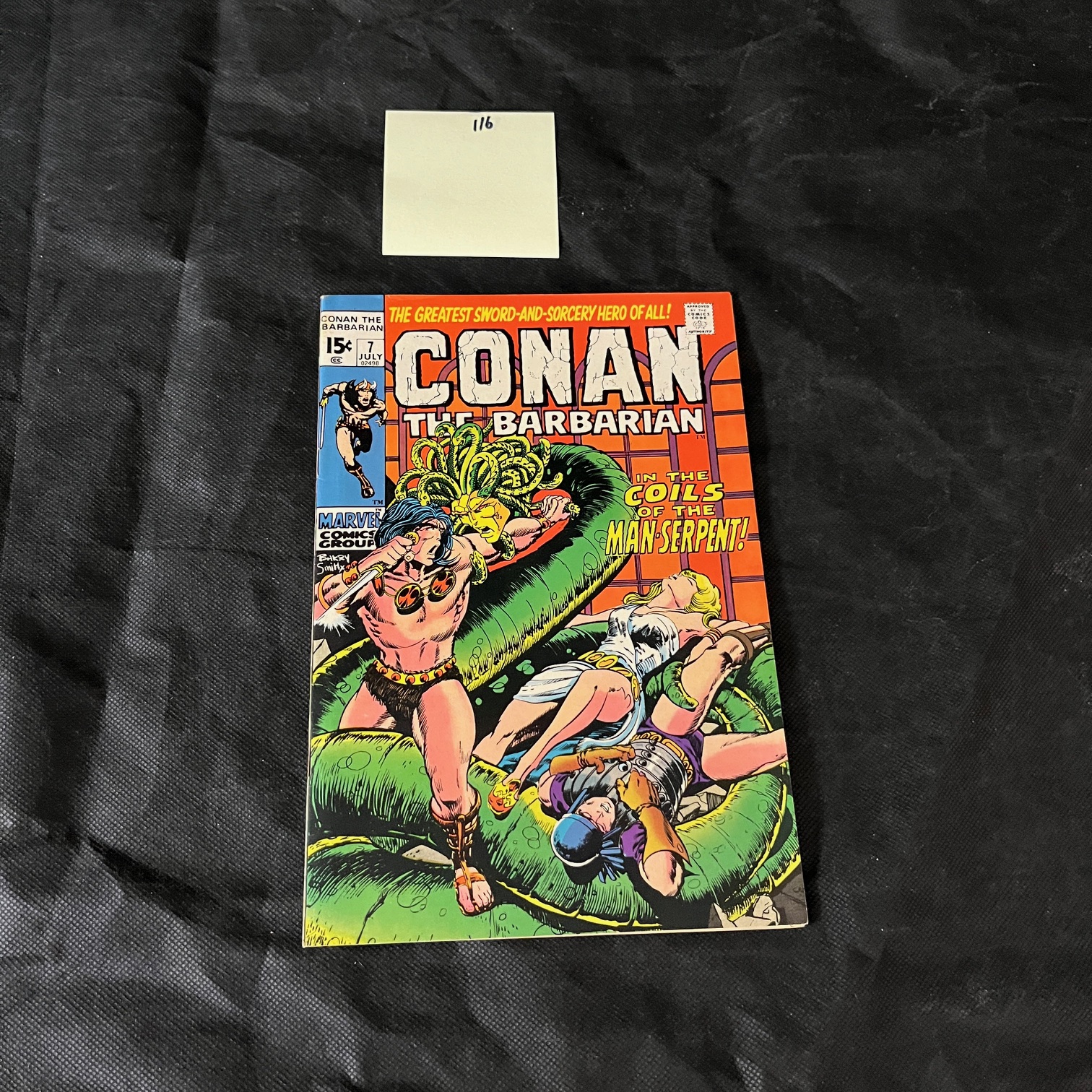 A vintage Marvel Comics Group ‘Conan The Barbarian’ issue #15, dated July, originally priced at 15¢. The front cover features colorful art depicting Conan battling a large green serpent-like creature, with a bound woman and another fallen figure also present. Text on the front cover includes ‘THE GREATEST SWORD-AND-SORCERY HERO OF ALL!’ and ‘IN THE COILS OF THE MAN-SERPENT!’. The back cover displays a full-page advertisement for ‘ACADEMY FOR HOME STUDY’ with the headline ‘Now you can Finish High School at home.’ Constructed from printed paper.