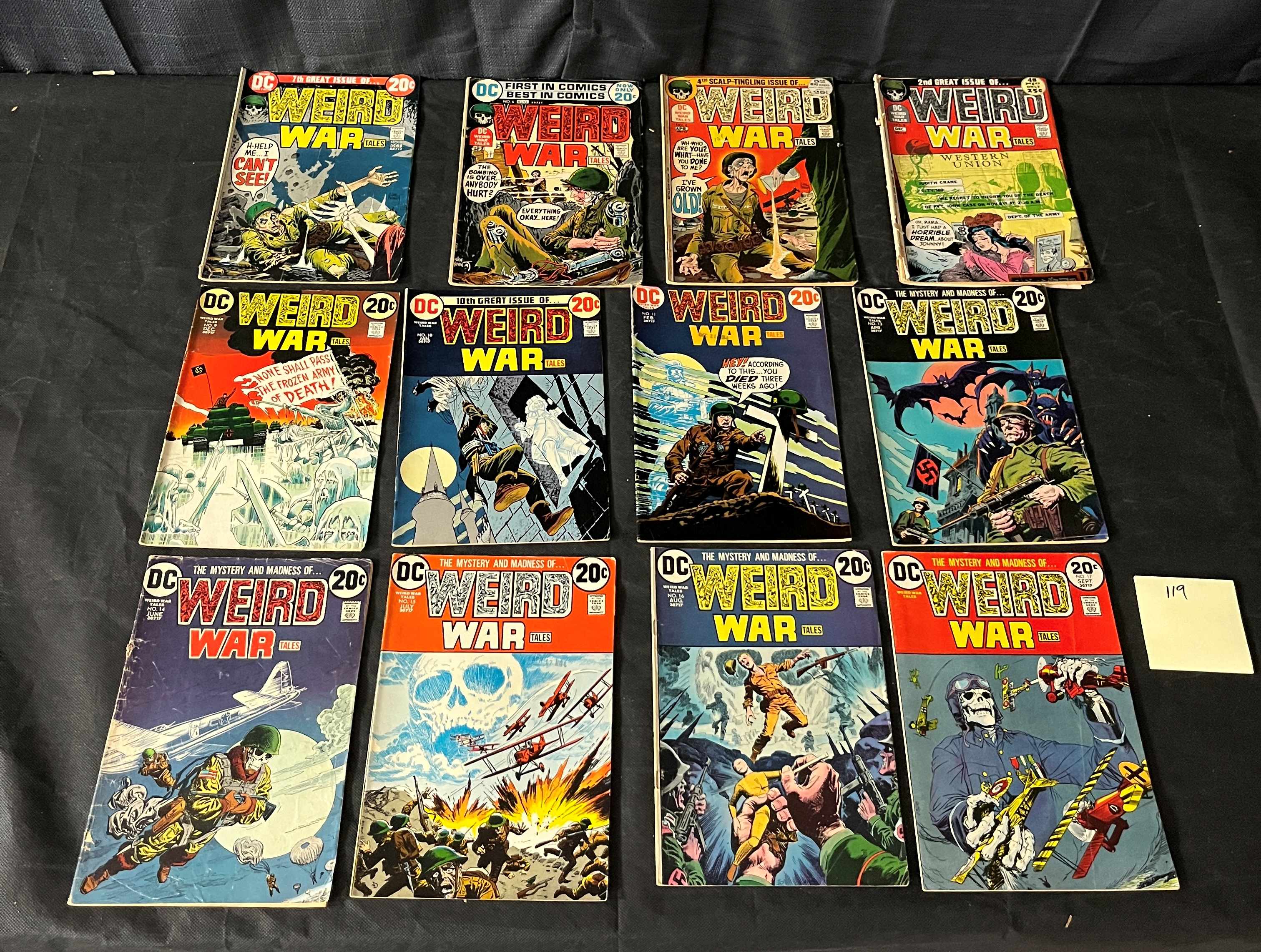 A collection of 12 vintage American comic books from the ‘Weird War Tales’ series, published by DC Comics. Dating primarily from the early 1970s, these comics feature a distinct Bronze Age art style, depicting war-themed stories often infused with horror and supernatural elements. Each cover prominently displays the ‘DC’ logo, the series title ‘WEIRD WAR TALES, ‘ a 20-cent price, and various issue numbers including 1, 2, 4, 9, 10, 11, 14, 15, 16, and 17. Dramatic English blurbs such as “H-HELP ME… I CAN’T SEE!”, “I’VE GROWN OLD!”, and “YOU DIED THREE WEEKS AGO!” are visible on the covers.
