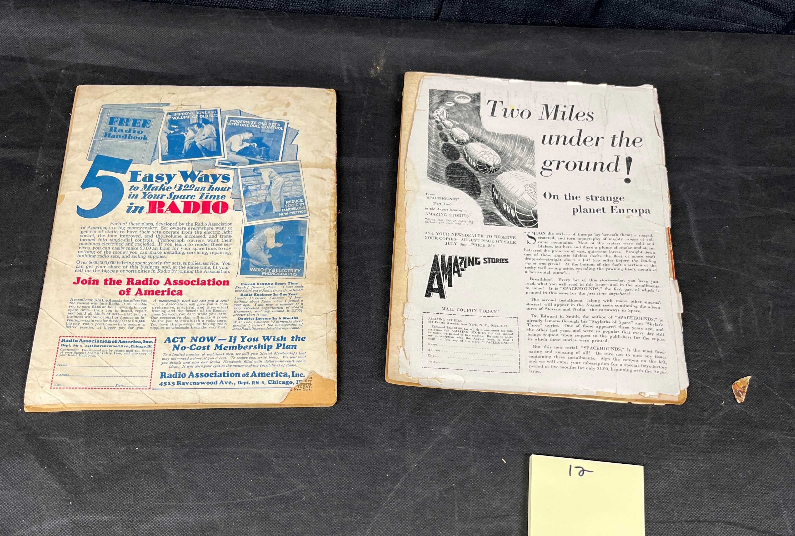 Both magazines exhibit significant wear consistent with their age, including creased, torn, and discolored covers. Visible spine deterioration is present on both, and the pages are aged and yellowed. Overall fair to poor condition.