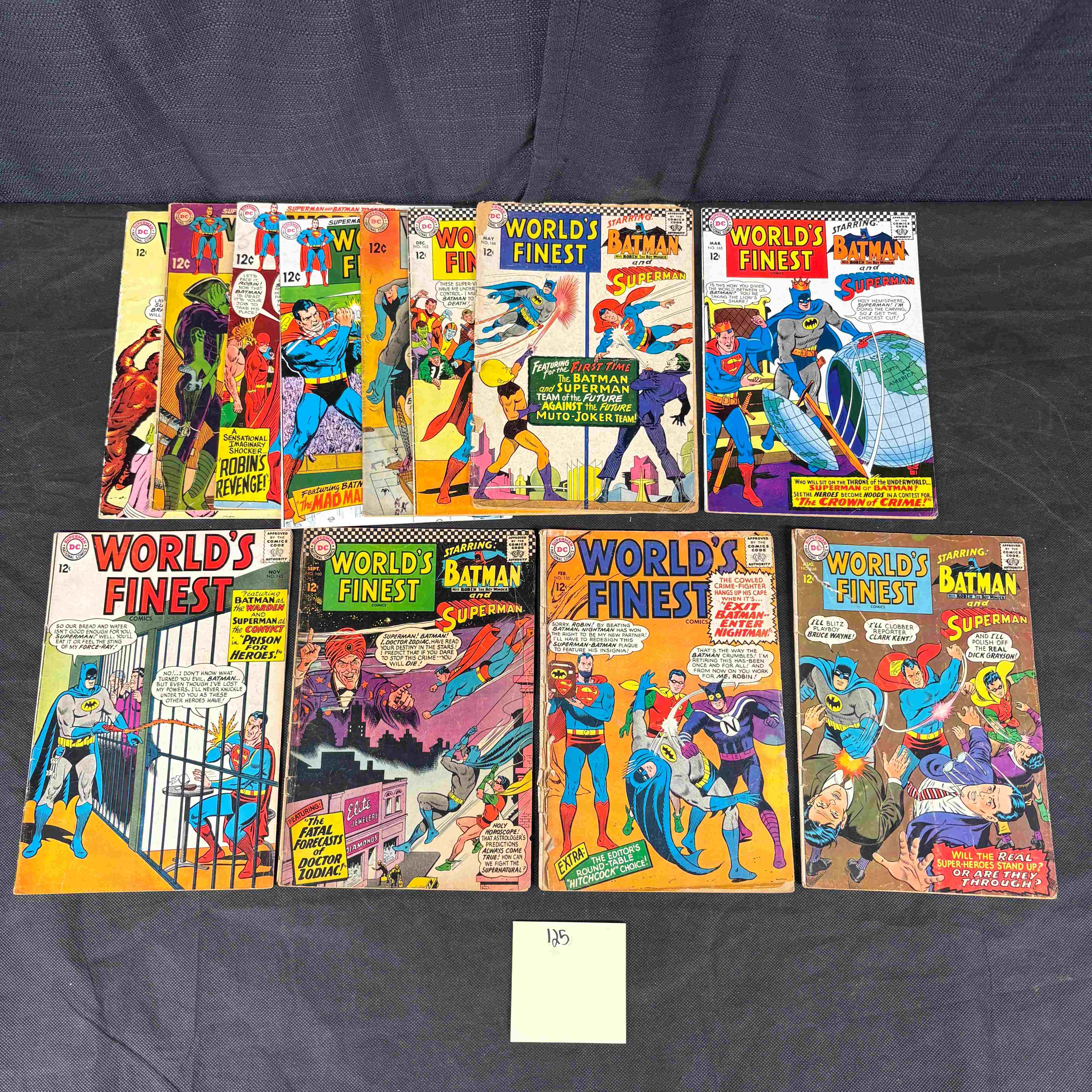 A group of ten Silver Age ‘World’s Finest’ comic books, published by DC Comics, featuring Superman and Batman. These issues date to the Silver Age, indicated by the consistent 12c cover price. The lot includes issues ranging from #154 through #163. Key characters depicted and referenced on the color covers include Robin, Green Arrow, Dr. Zodiac, The Joker, Lex Luthor, and the Composite Superman. Printed on paper.