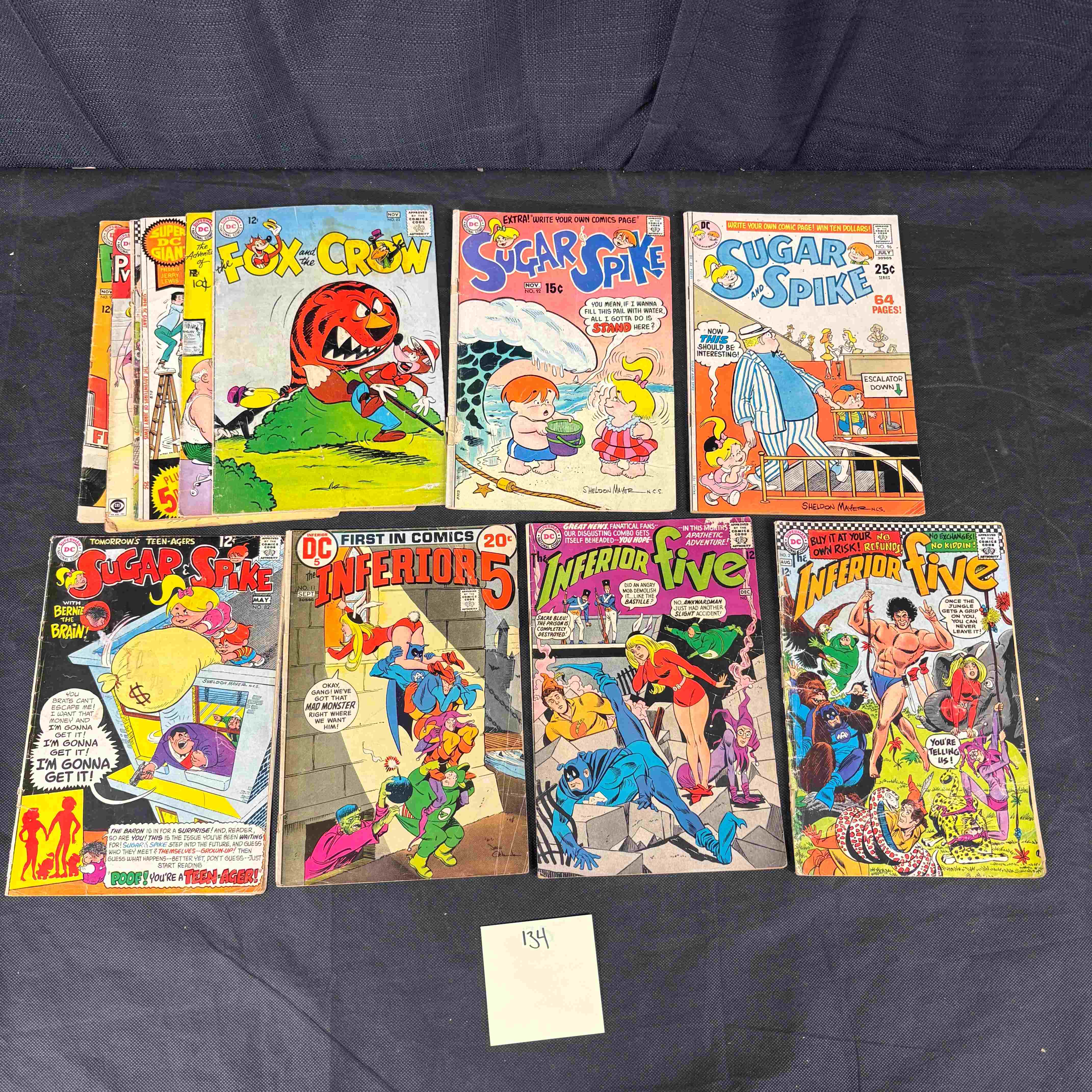 A collection of 12 vintage American comic books published by DC Comics/National Periodical Publications. This group includes issues from popular series such as *Adventures of Bob Hope*, *Fox & Crow*, *Sgt. Bilko’s Doberman*, *Sugar & Spike*, *Jerry Lewis*, *Bob Hope*, and *Inferior 5*. With cover prices ranging from 10 cents to 25 cents, these comics likely span the late 1950s through the early 1970s. Visible issue numbers include #12, #1-12, #119, #134, and #135. Many covers feature additional text such as “AMERICA’S FUNNIEST COMIC MAG.” or “FIRST IN COMICS.” Printed on paper. A small handwritten note “134” is present on a separate piece of paper.