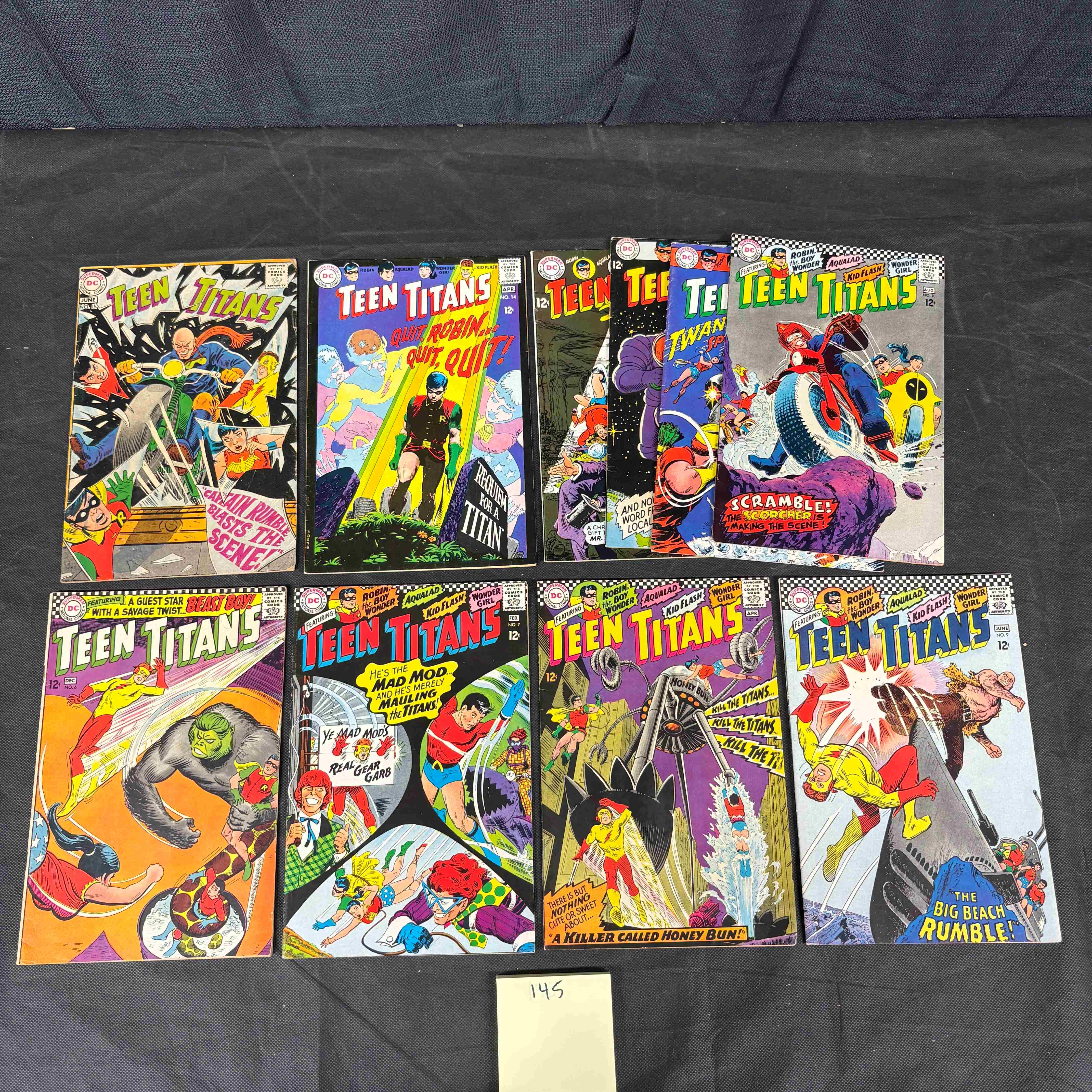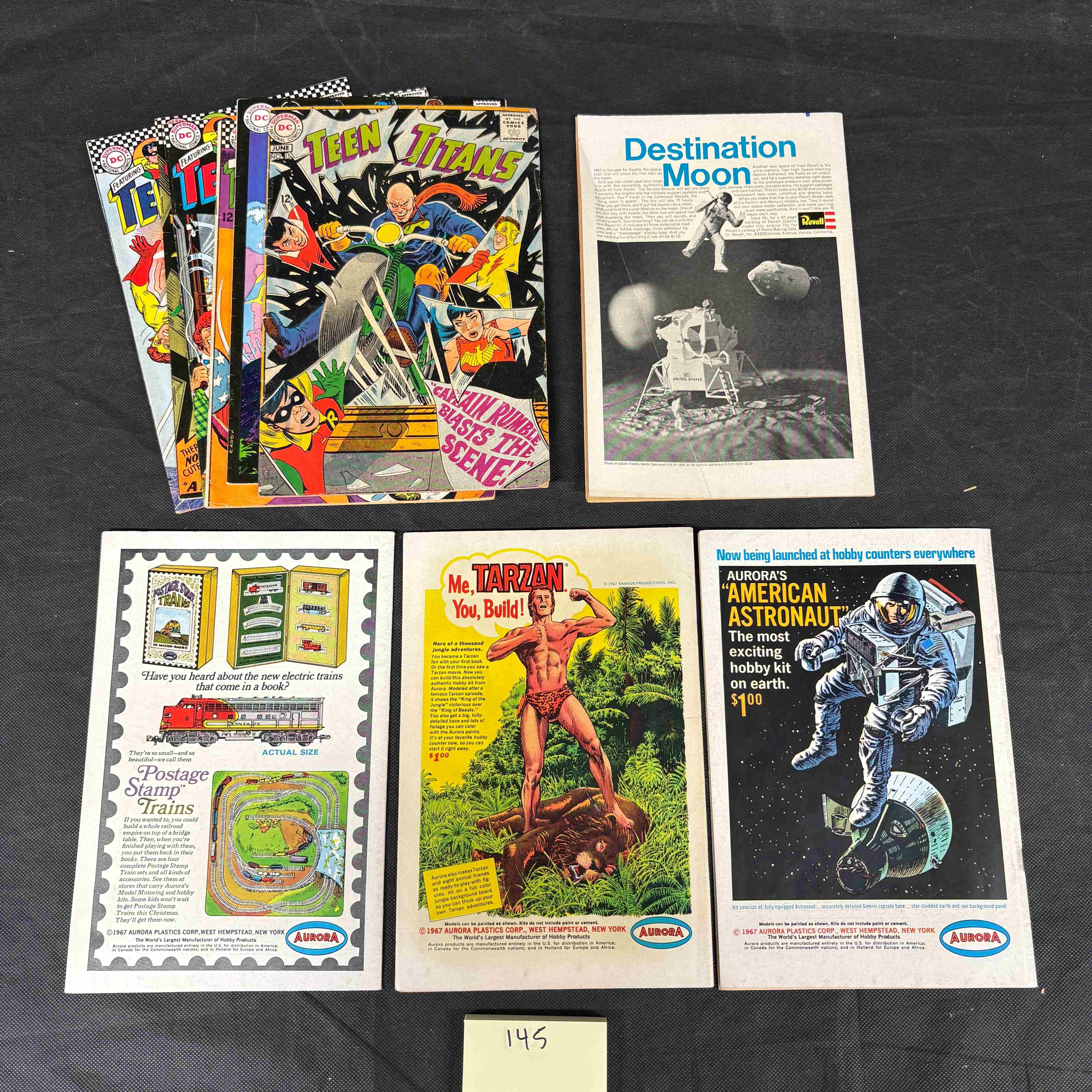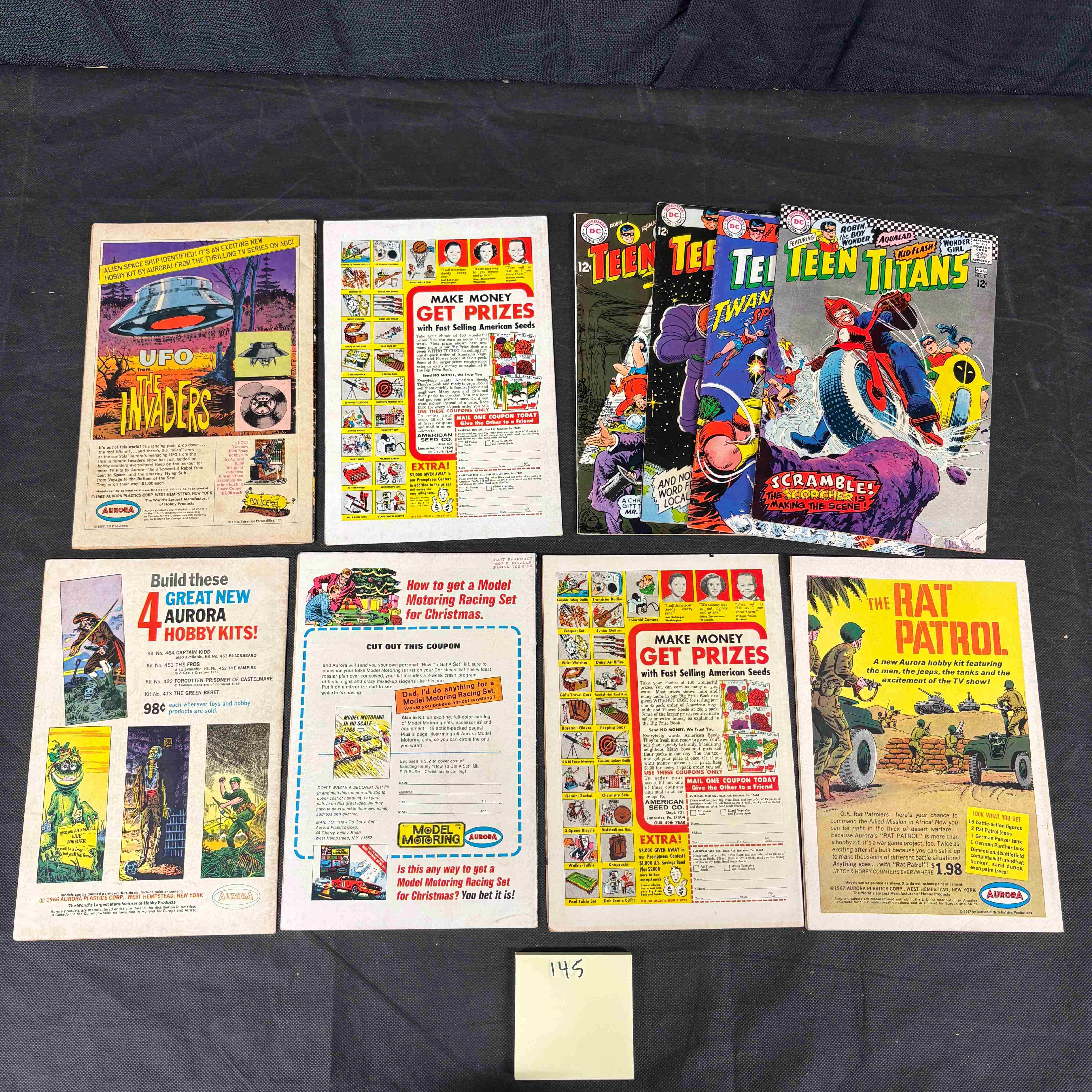 A collection of eleven vintage American comic books from the DC Comics ‘Teen Titans’ series, published beginning in 1966. This lot includes visible issues numbers 2 and 4 through 11. The comics feature prominent DC Silver Age characters such as Robin, Wonder Girl, Kid Flash, Speedy, and Aqualad. All issues are marked with a 12-cent cover price. The covers display typical comic book art of the period, with various action scenes and prominent titles including “Captain Rumble Blasts The Scene!”, “Scramble!”, “A Christmas Happening!”, “Twang!”, and “The Mad Mod!”. The back covers uniformly feature period advertisements for Aurora model kits (e.g., “American Astronaut,” “Tarzan,” “UFO Invaders,” “Destination Moon,” “Rat Patrol,” “Postage Stamp Trains”) and promotions for American Seeds.